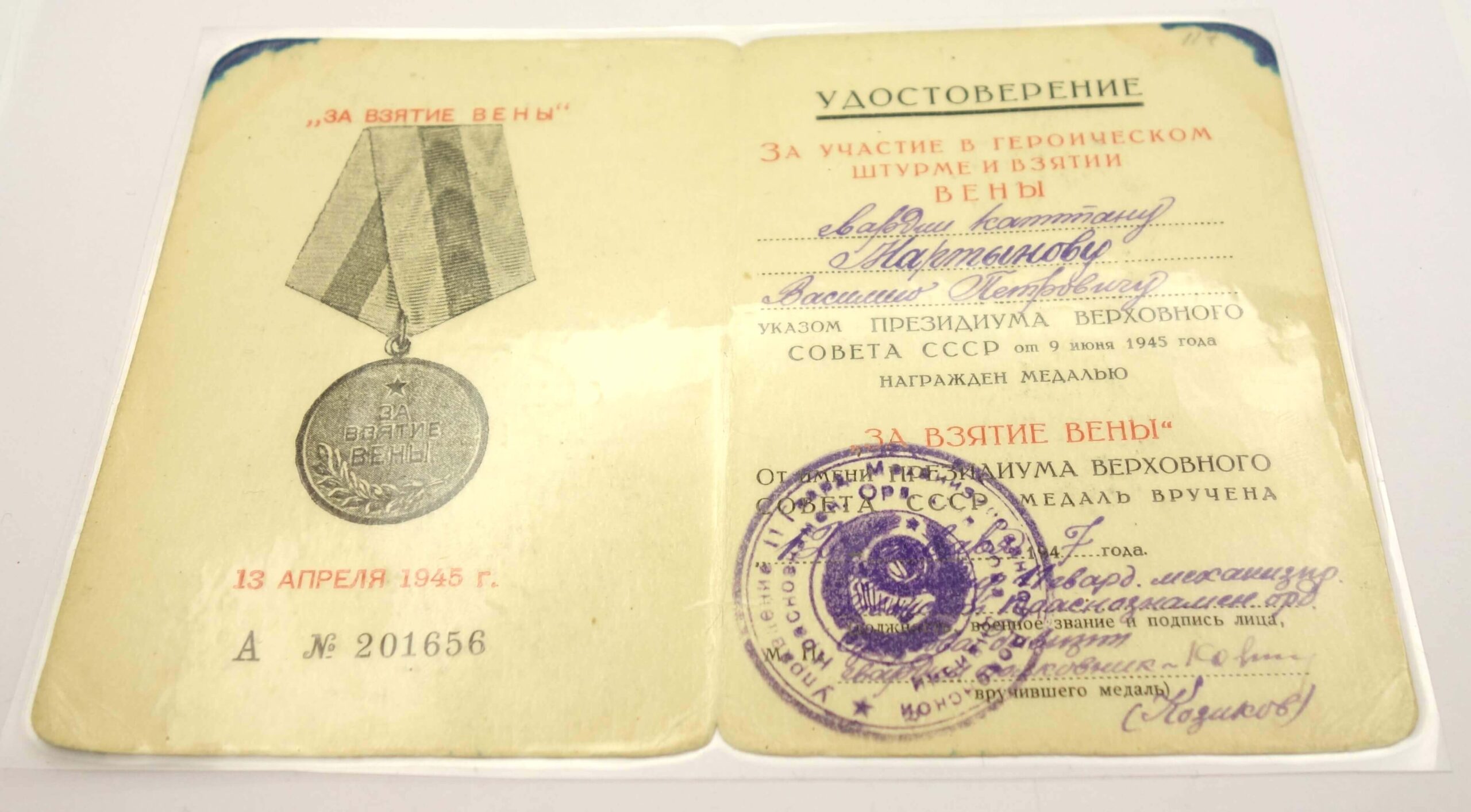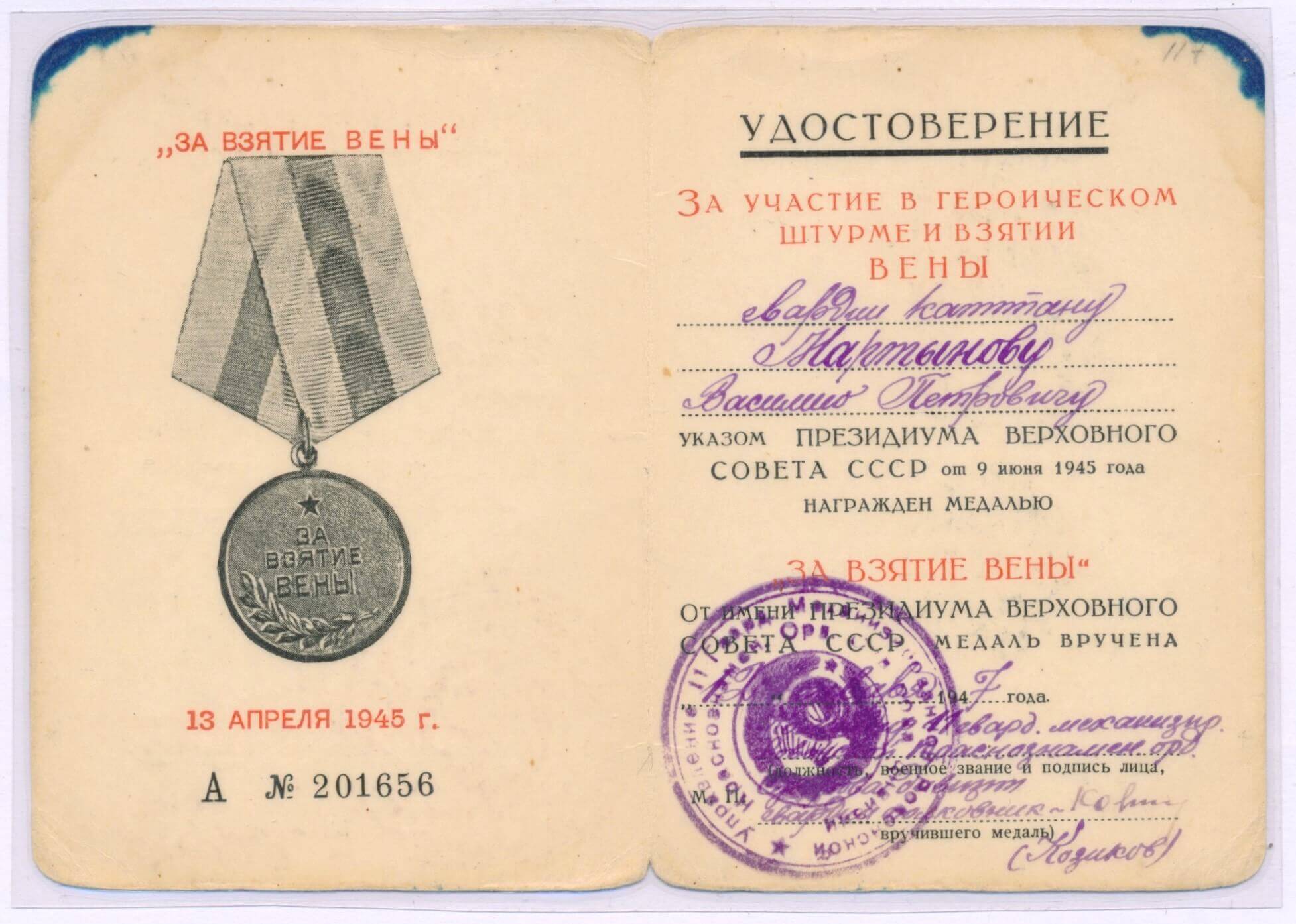 Document for the Medal for the Capture of Vienna