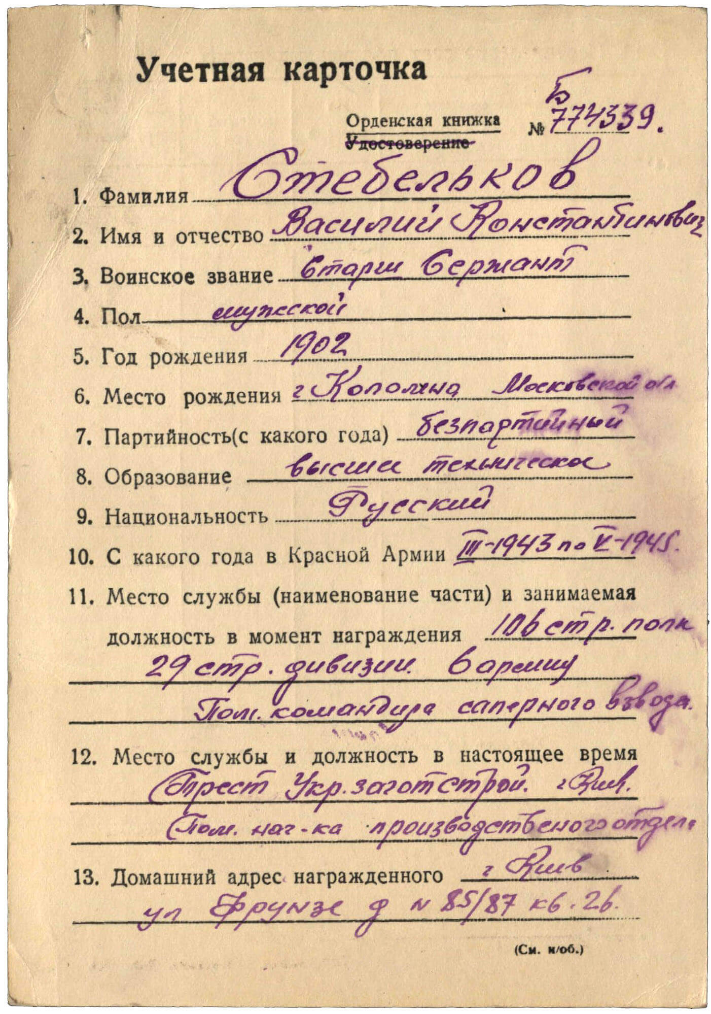 Awarded to Sr. Sergeant Vasily Konstantinovich Stebelkov (Василий Константинович Стебельков)