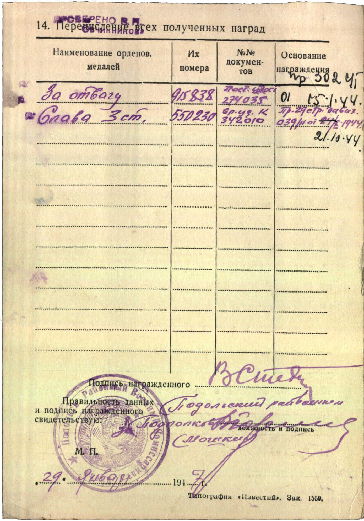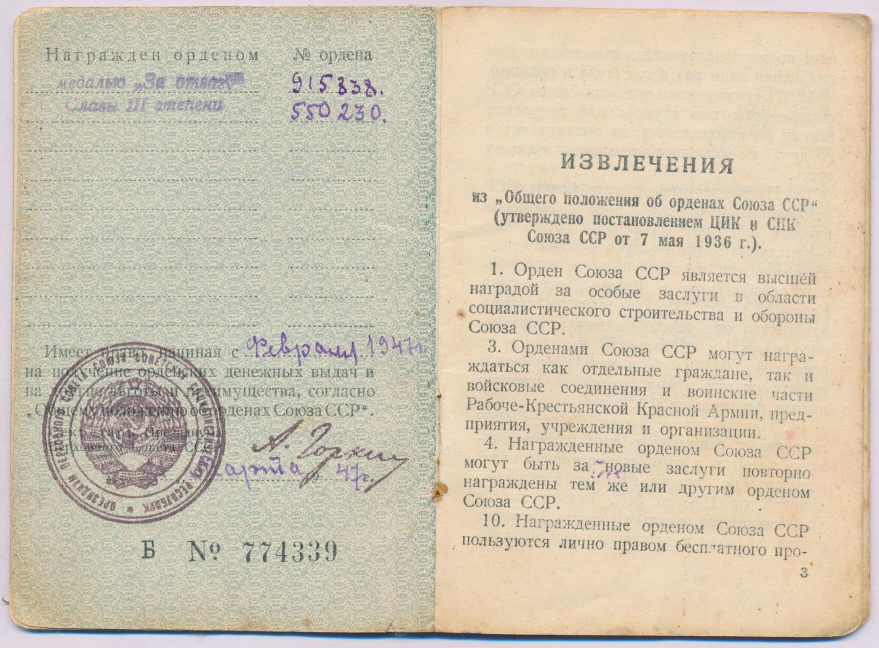 Documented Group of an Order of Glory 3rd class #550230 + Medal for Bravery #915838