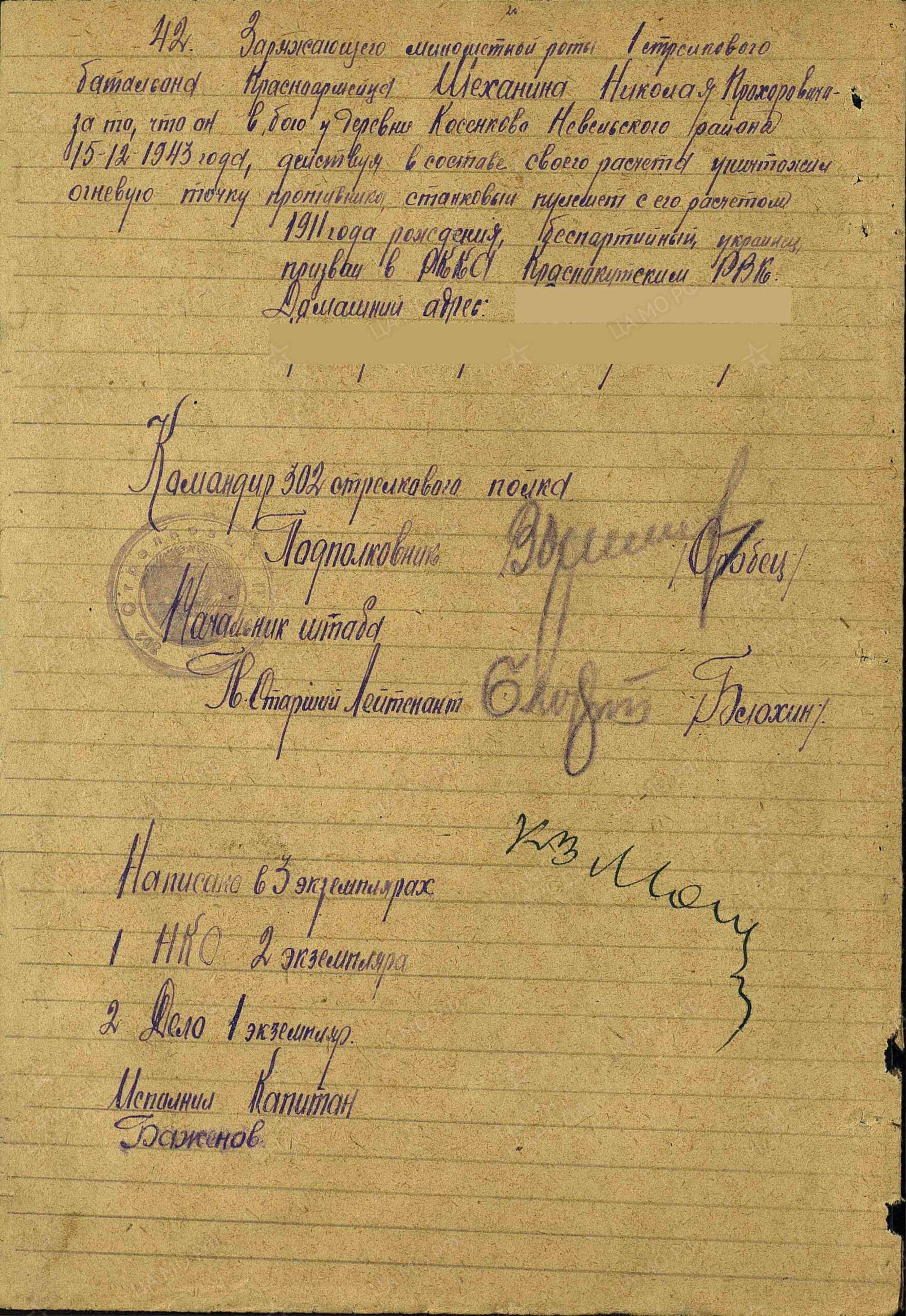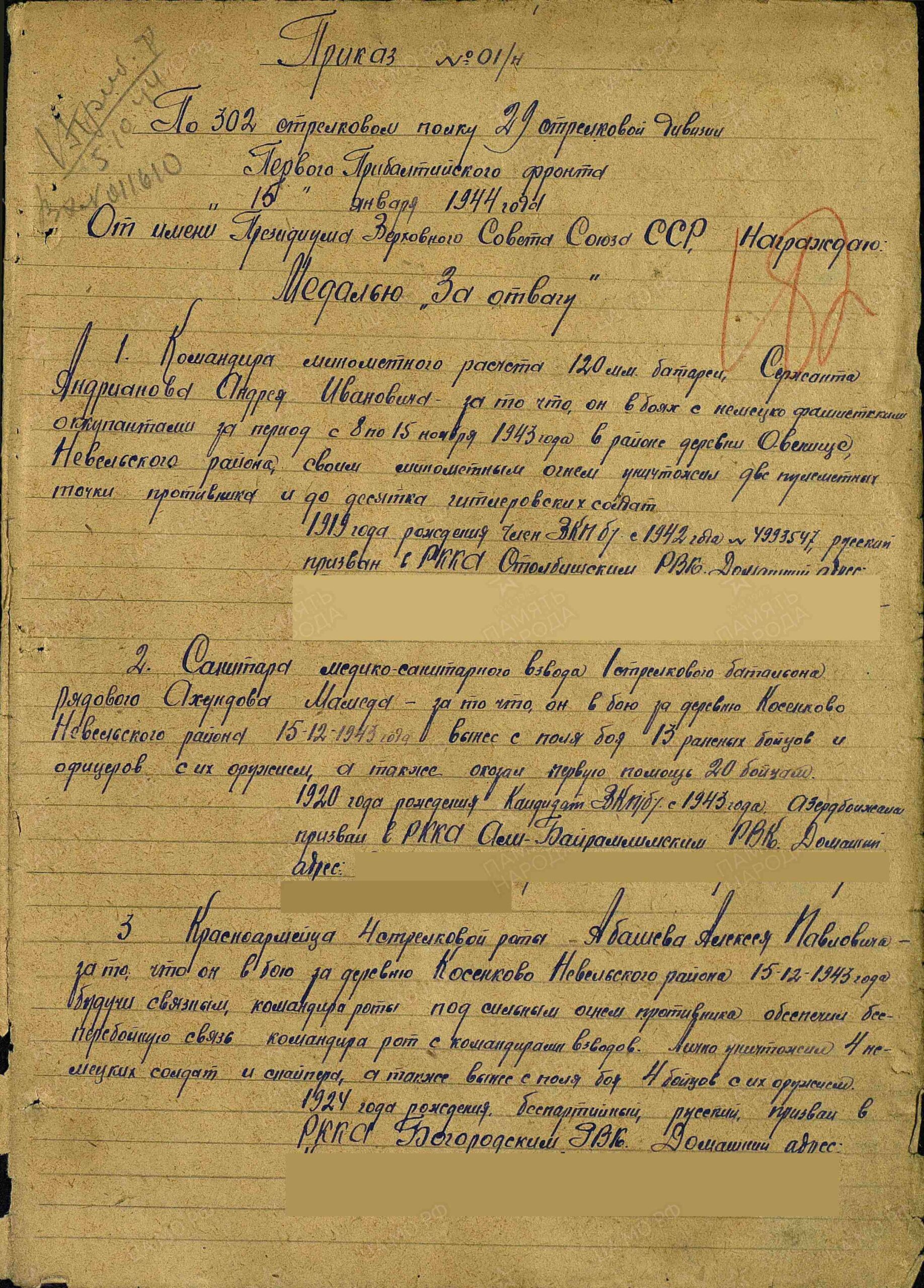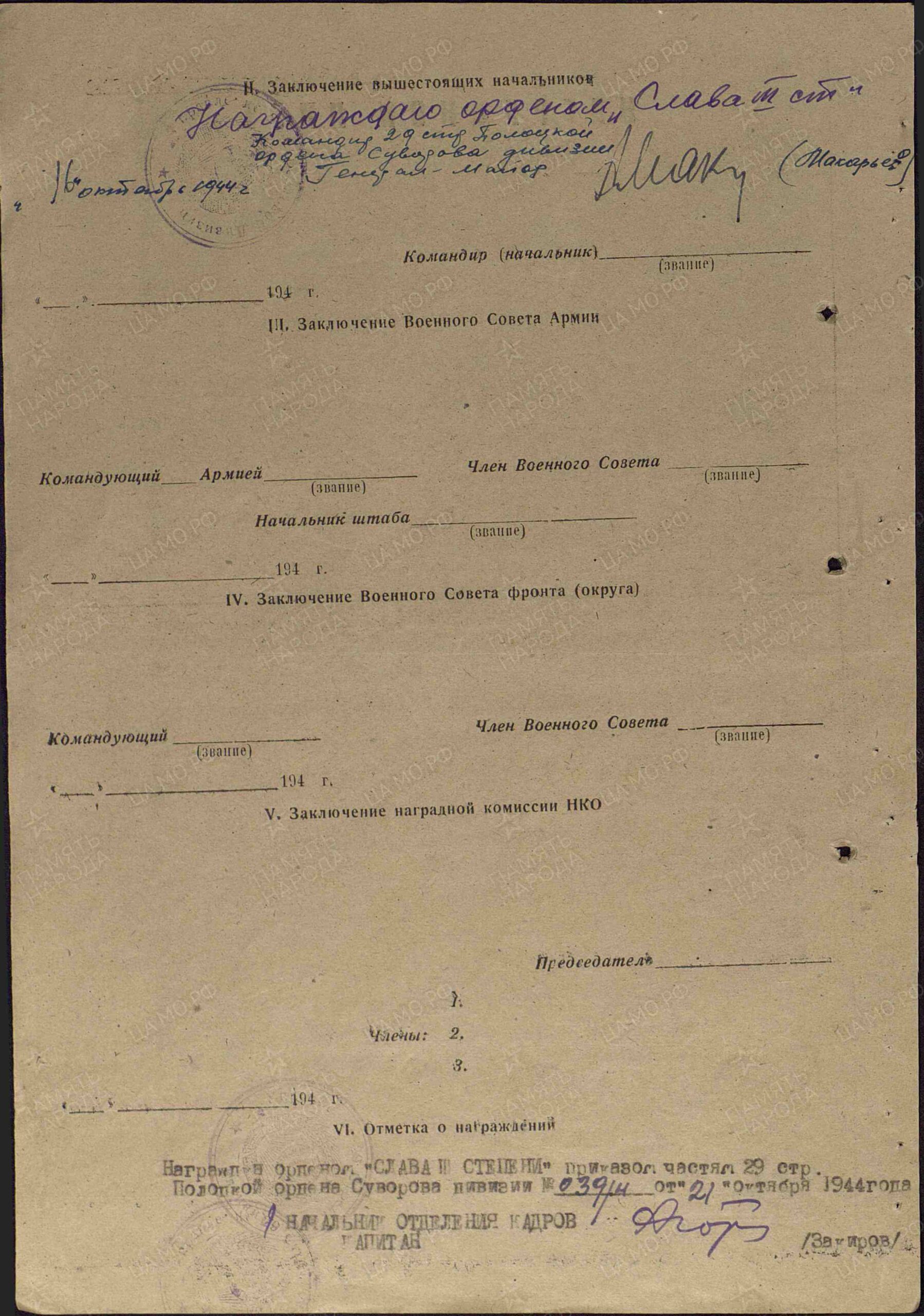 29. Assistant commander of the Sapper Platoon, Senior Sergeant Stebelkov Vasily Konstantinovich, for the fact that he performing the combat mission of clearing passages in a minefield for the infantry offensive in the direction of the village of Palkino, Nevelsky region, on the night of 15.12.1943, completed the task under enemy fire.