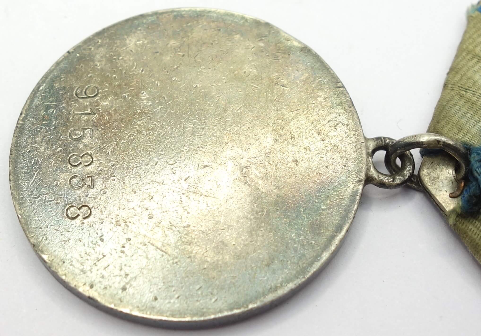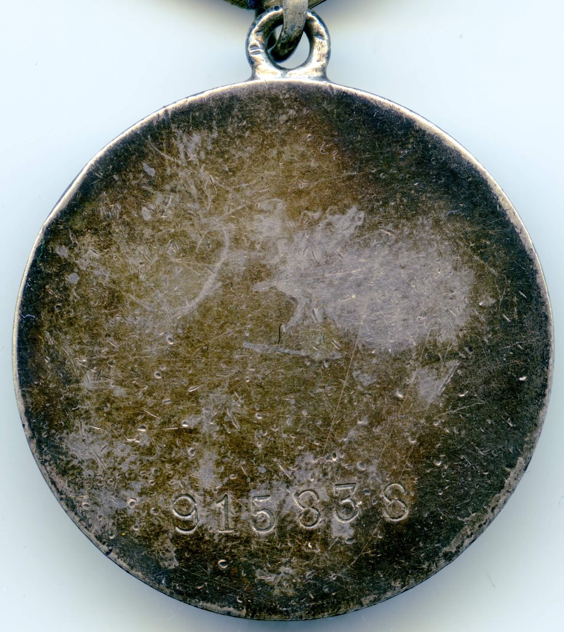 The medal is in good overall condition with most details visible but several dings on both sides. Over half of the original red lacquer is still present and without repairs. Its connection ring has not been cut, and the medal comes with its period-appropriate suspension and an old ribbon.