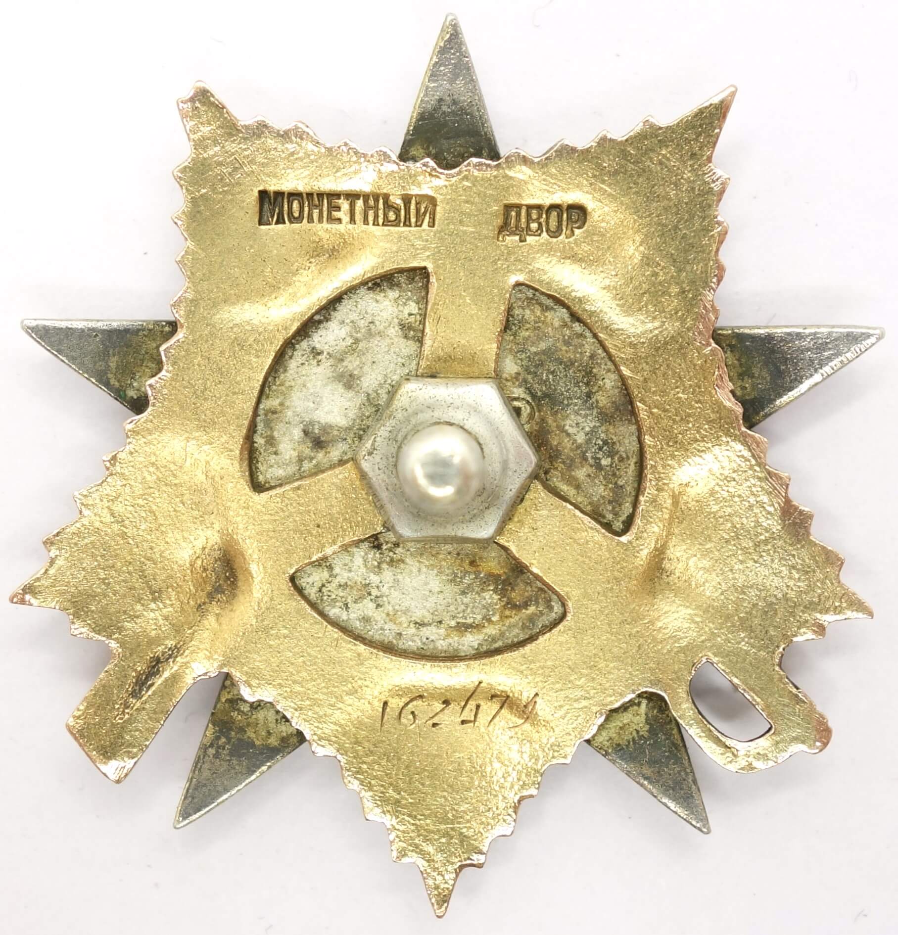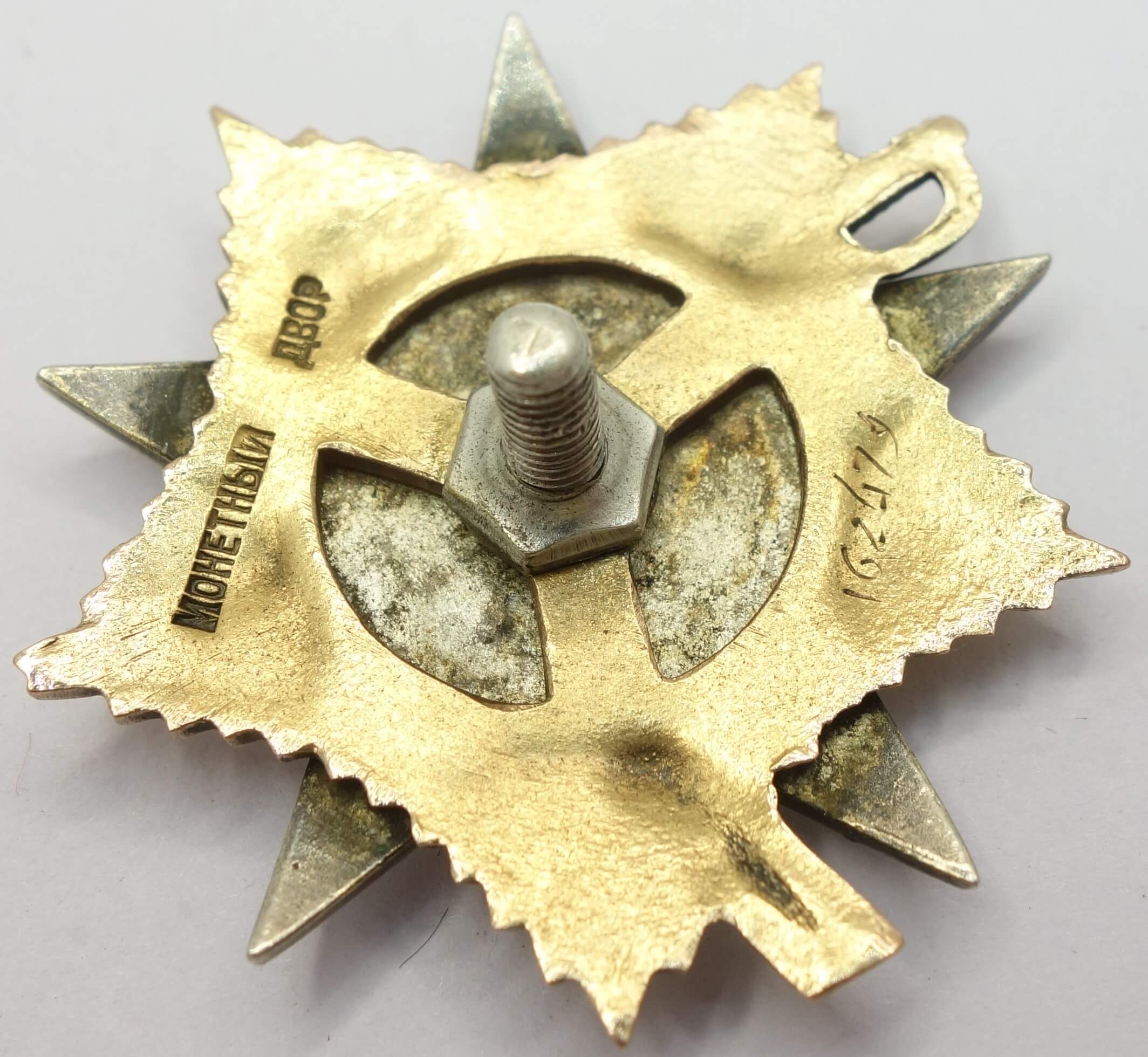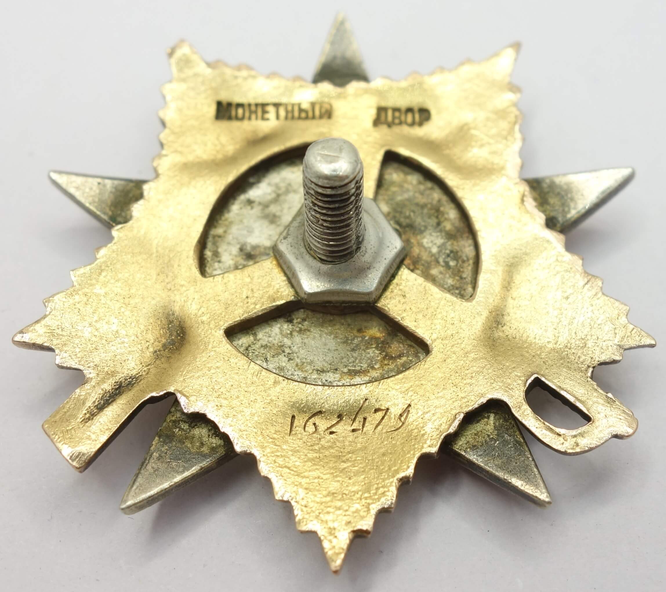 In worn condition with substantial enamel loss on the 12. 3 and 5 o’clock rays of the red star. Despite this damage the details remain crisp and even the seperately attached gold hammer and sickle shows it edges perfectly well. The order has never been disassembled and its reverse is free from dings and scratches, The screwpost remains unshortened, and the order includes a well-fitted silver screwplate.