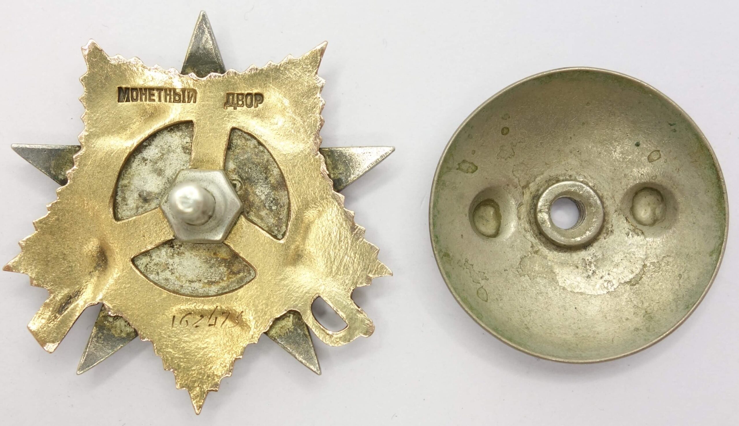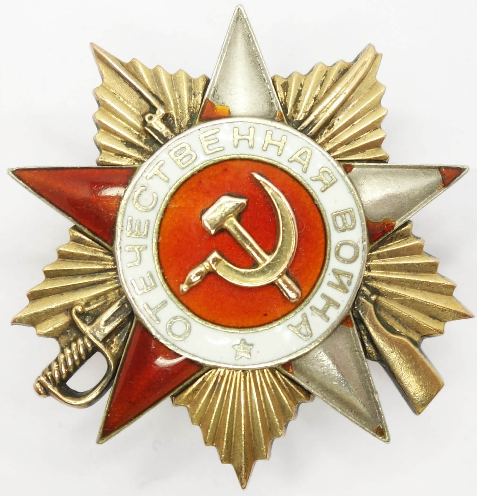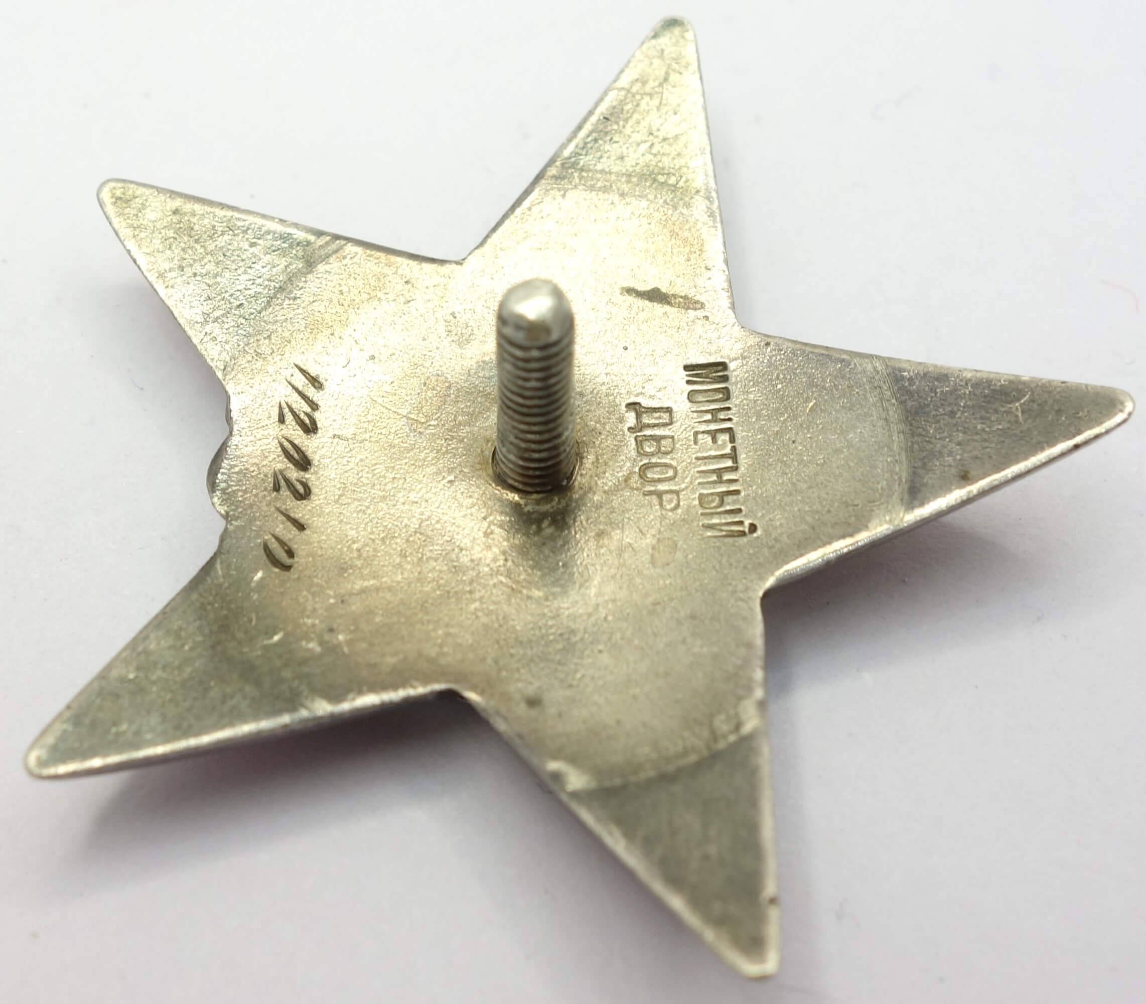 In worn condition with substantial enamel loss on the 12. 3 and 5 o’clock rays of the red star. Despite this damage the details remain crisp and even the seperately attached gold hammer and sickle shows it edges perfectly well. The order has never been disassembled and its reverse is free from dings and scratches, The screwpost remains unshortened, and the order includes a well-fitted silver screwplate.