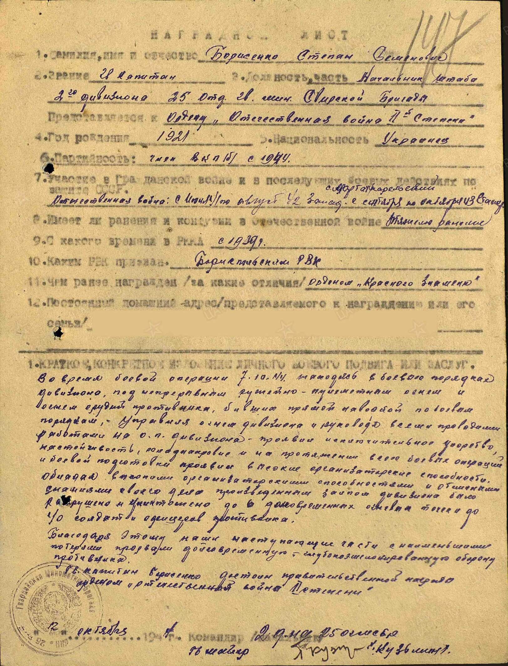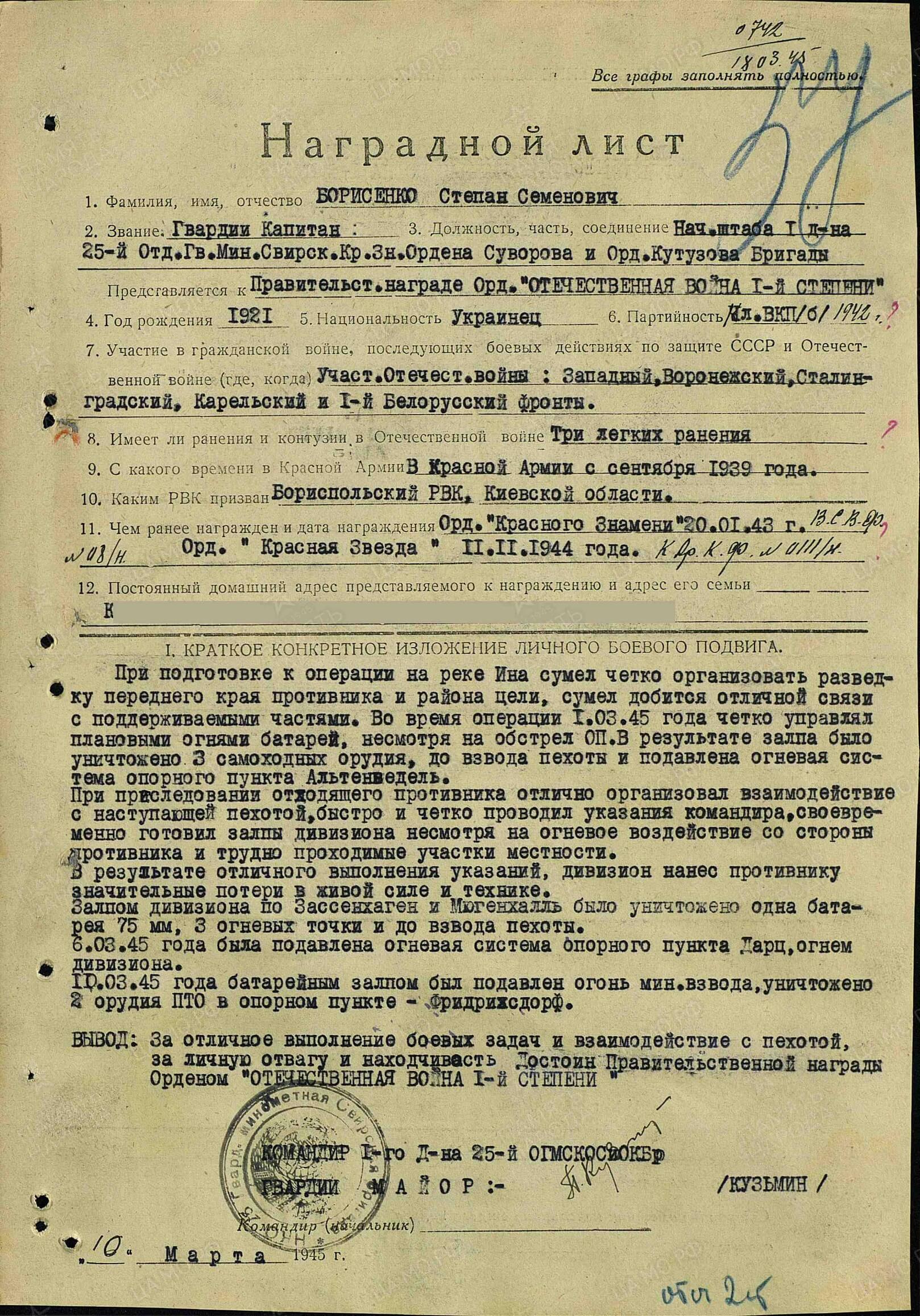 Awarded to Guards Captain Stepan Semenovich Borisenko (Степан Семёнович Борисенко)