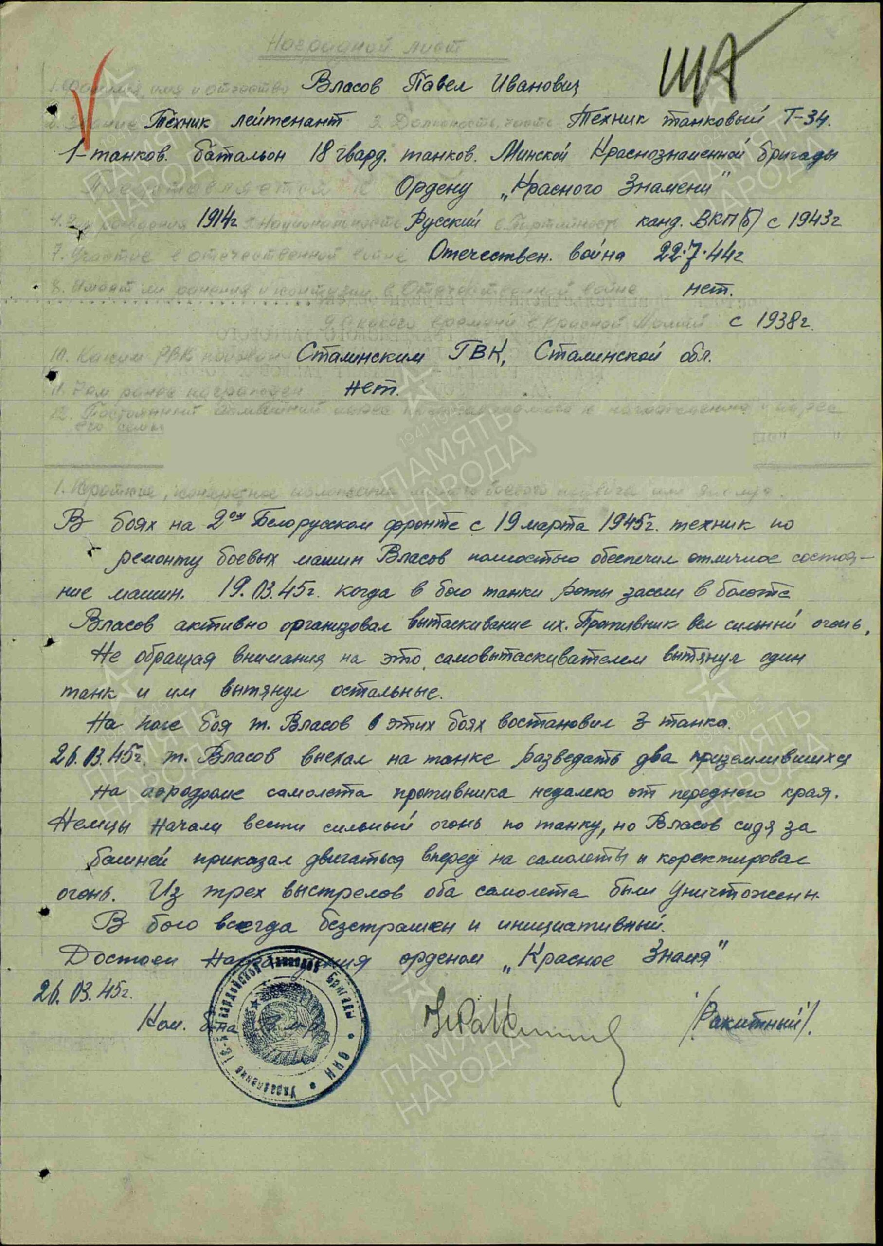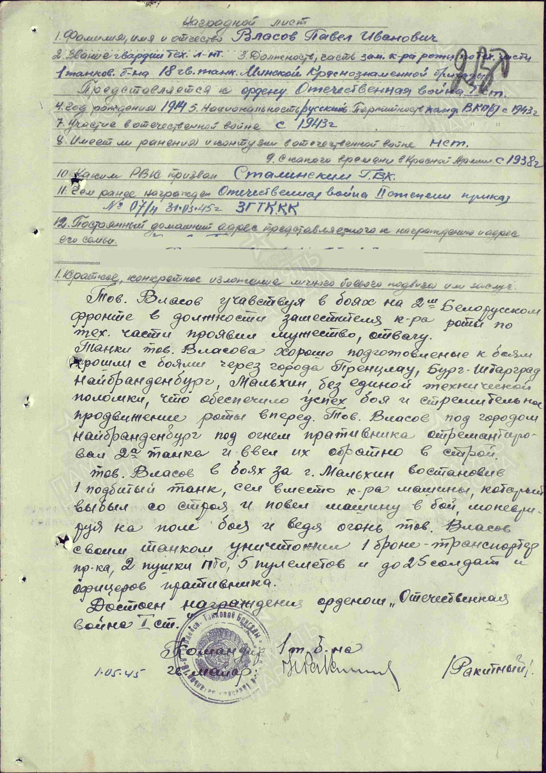 Awarded to Guards Lieutenant Pavel Ivanovich Vlasov (Павел Иванович Власов)