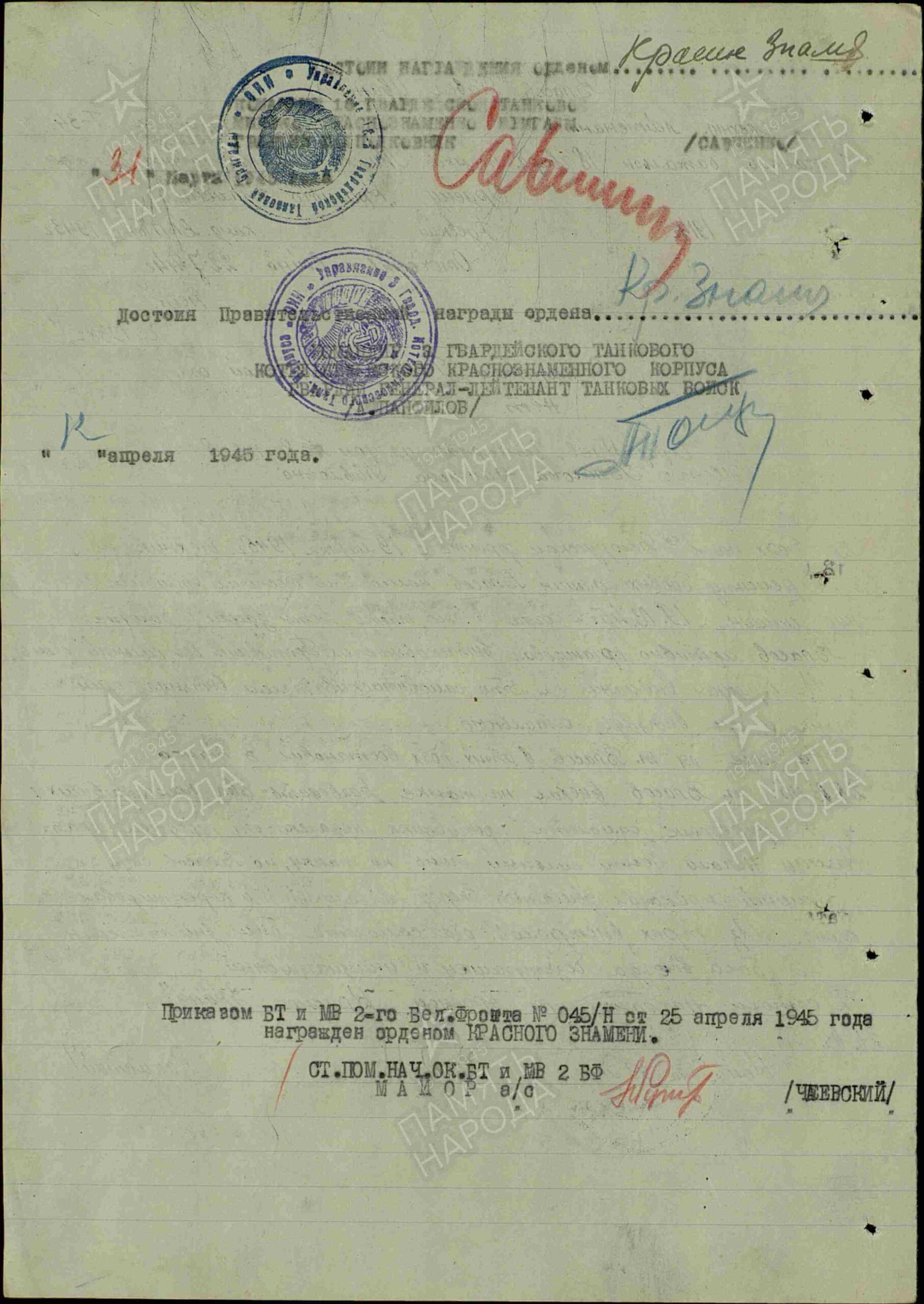 During the battle for Malchin, he restored one damaged tank, replaced the wounded tank commander, and personally led the tank into combat. Maneuvering across the battlefield and firing, he destroyed one armored personnel carrier, two anti-tank guns, five machine-gun positions, and eliminated 25 enemy soldiers and officers.