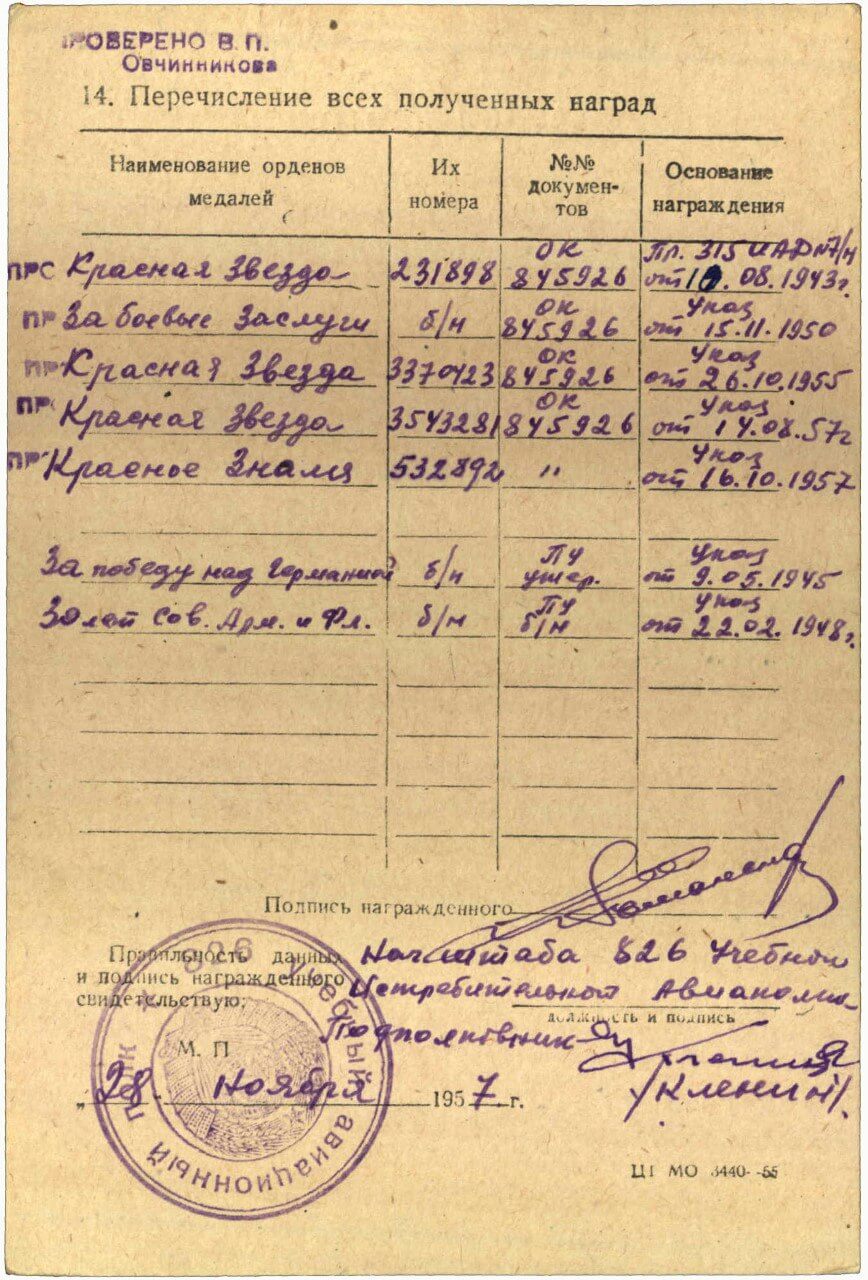 For proving himself a bold and skilled combat pilot. He flew 15 missions escorting attack aircraft, successfully repelling all enemy fighter assaults. On July 30, 1943 [at the Battle of Kursk], he personally shot down a German FW-190 in a fierce air battle. In one mission, upon spotting two FW-190s attacking an IL-2, he fearlessly rushed into the fight. With sharp maneuvers, he outflanked the enemy, and sent one burning German plane crashing to the ground while the other fled