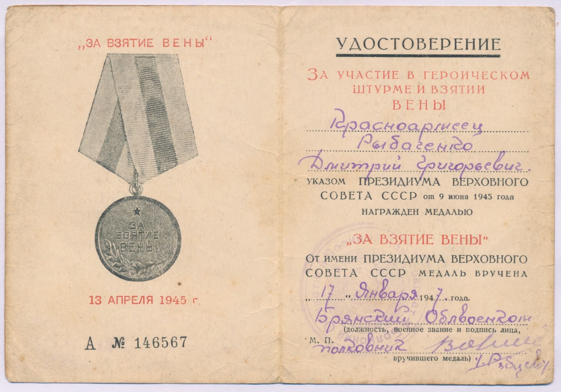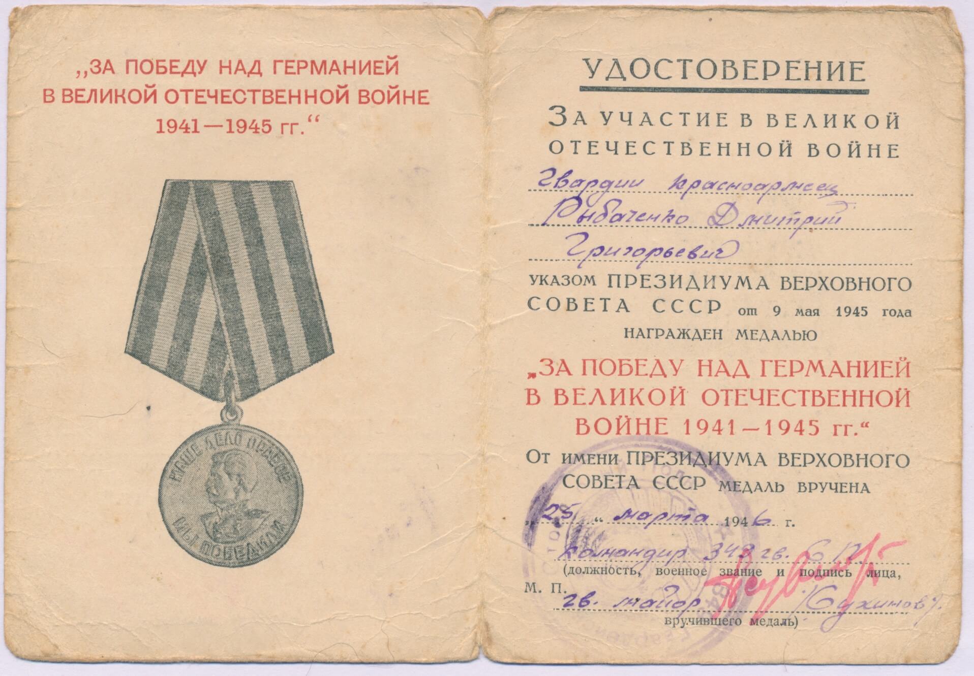 Awarded to Guards Private Dmitry Grigorievich Rybachenko (Дмитрий Григорьевич Рыбаченко)