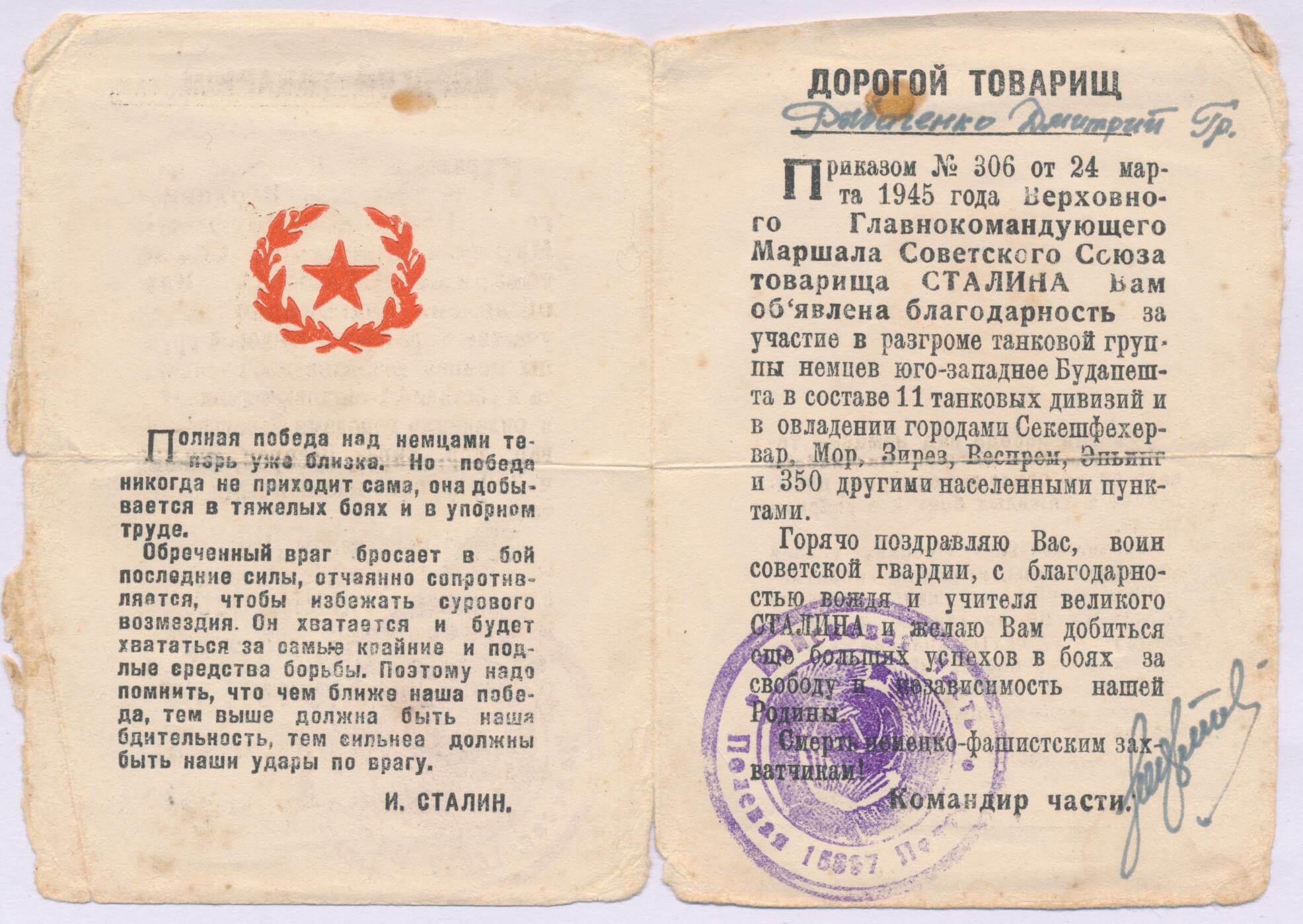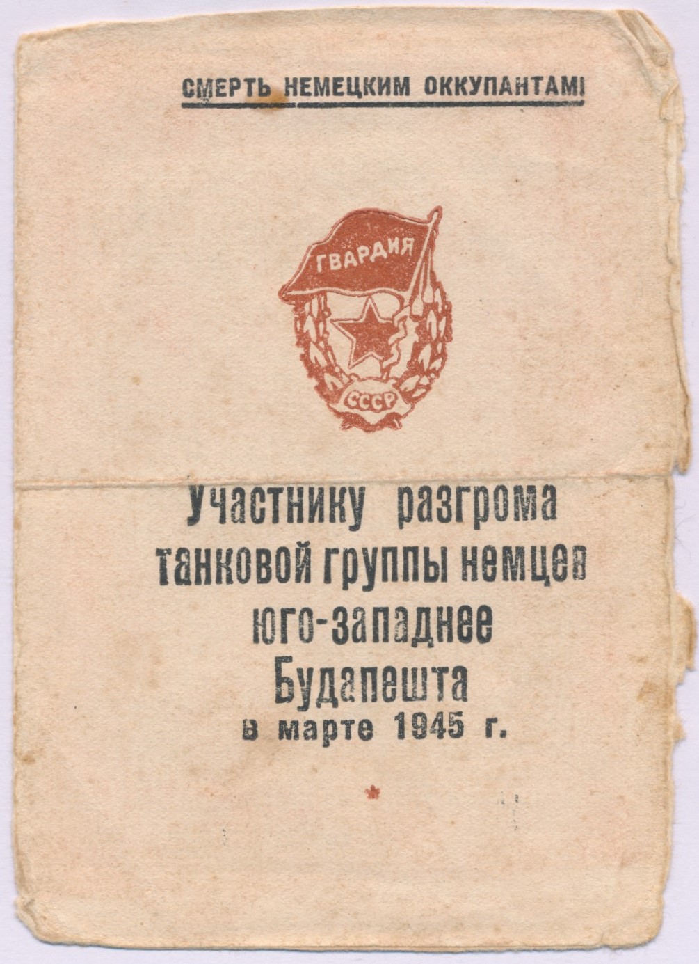 1945 Soviet commendation certificate awarded to soldiers for defeating German tank forces southwest of Budapest