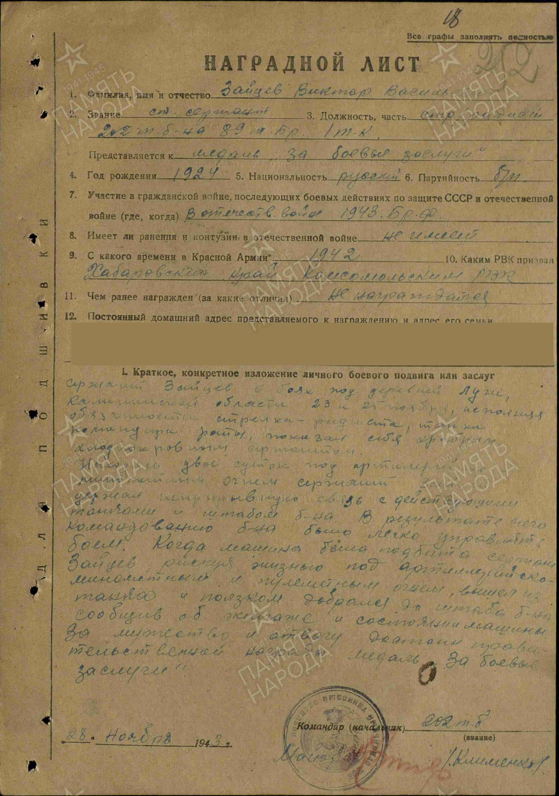 Fighting near the village Lugi (Kalinin region) during 23-25 November, Sergeant ZAITSEV performed duties of a machine-gunner, radio operator, and also as a company commander. He proved himself as a brave and cool NCO.