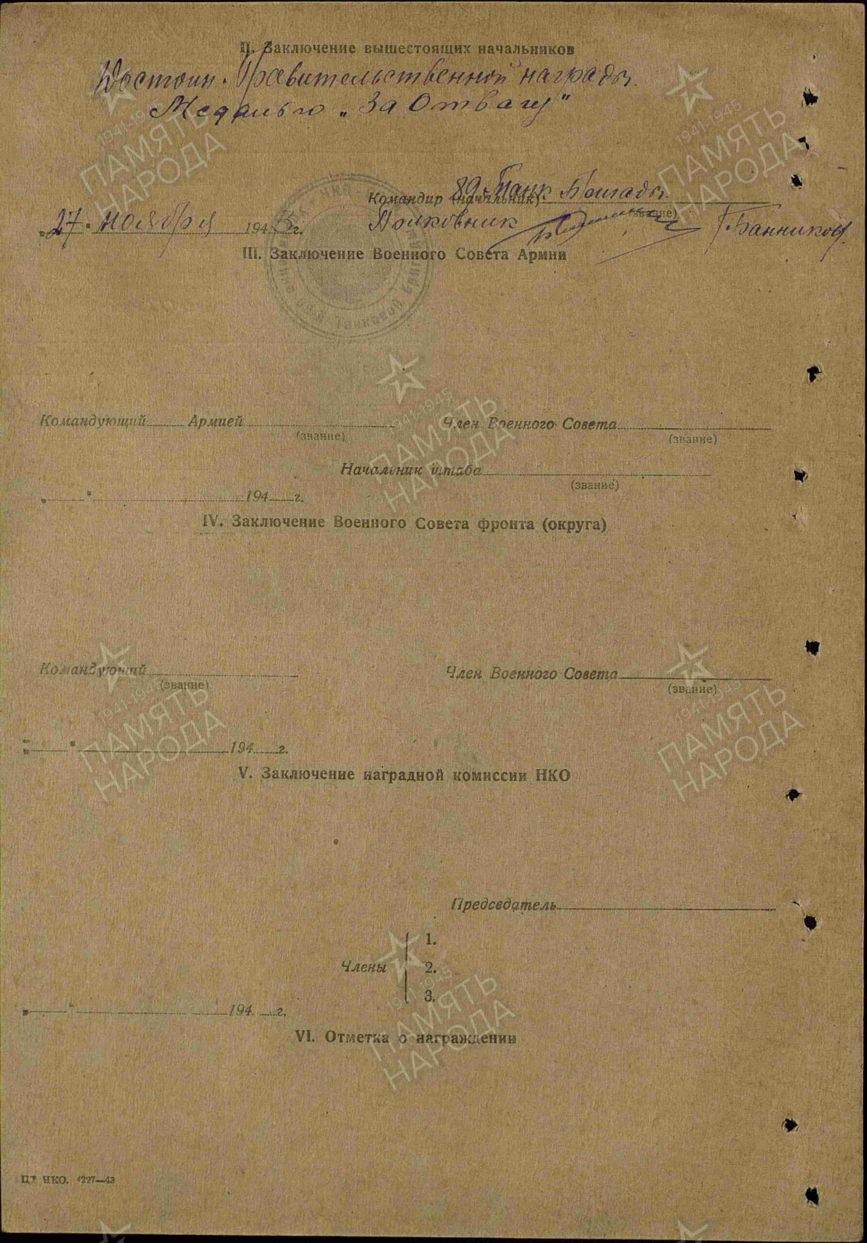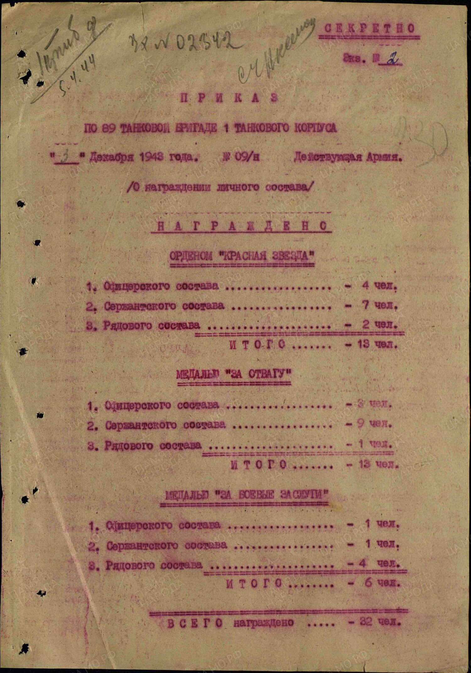 For bravery and dedication in the Kalinin region in 1943, serving on a T-34 as machine-gunner, radio operator, and company commander. He maintained vital communications under heavy fire for two days, ensuring effective command of combat assets, and risked his life when reporting on his tank and crew after his tank was hit
