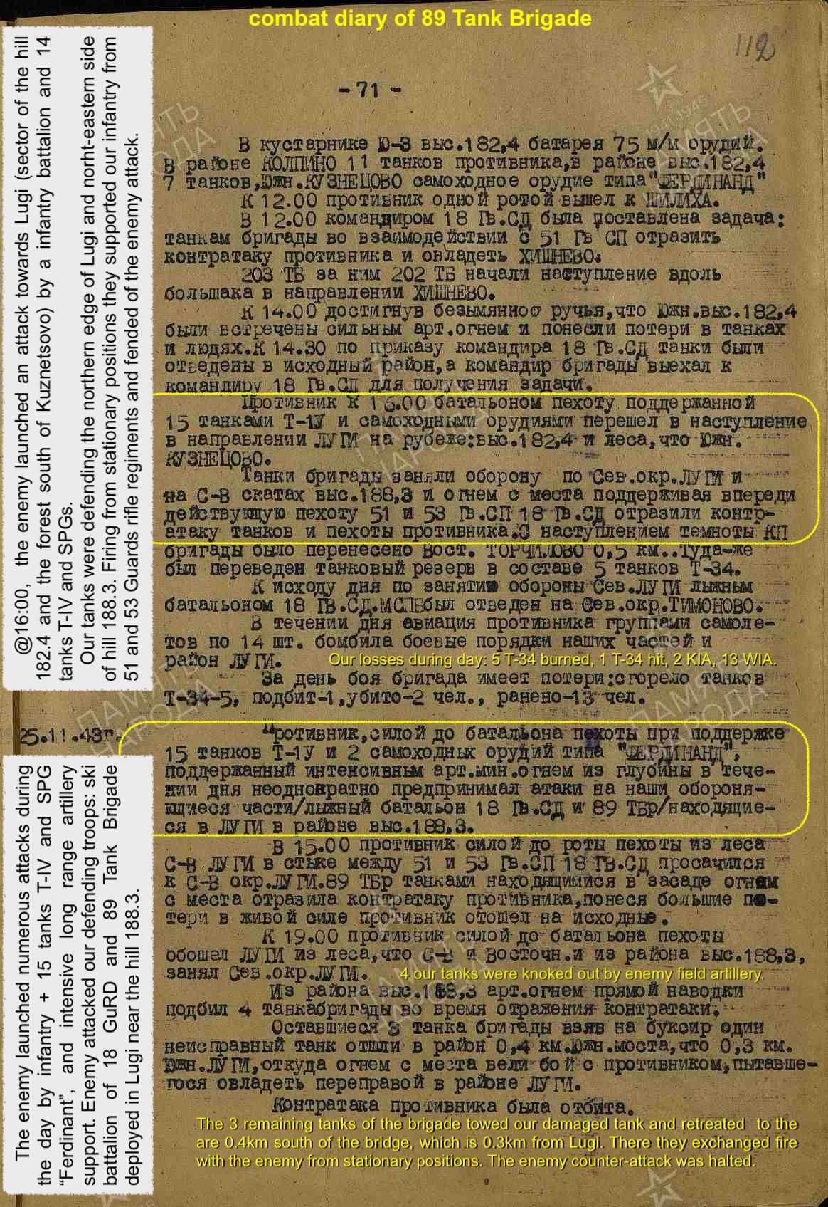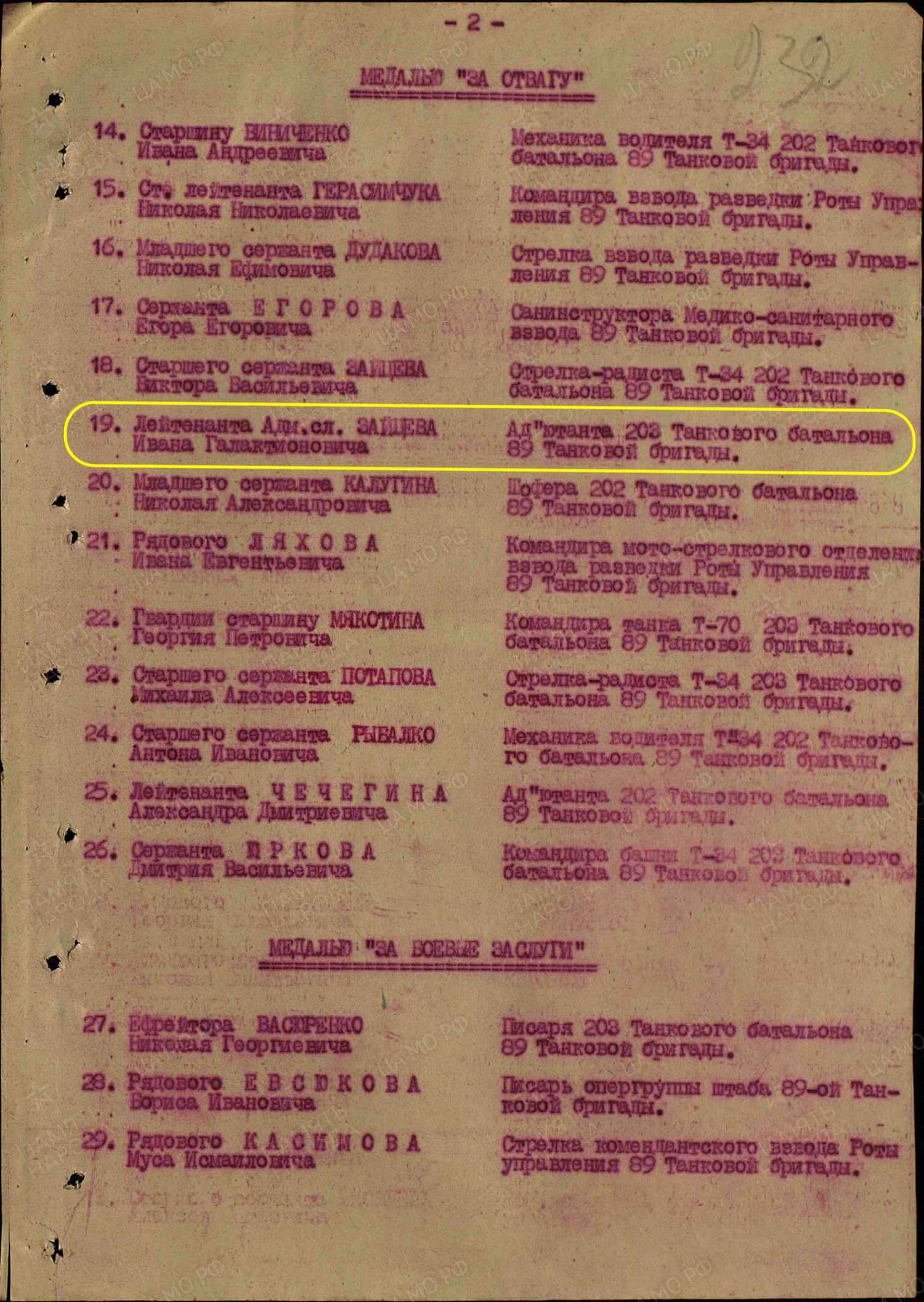 Being subjected to enemy artillery and mortar fire for 2 days, Sergeant ZAITSEV maintained uninterrupted communication link between the battalion headquarters and the tanks active on the battlefield. As the result of this effort, the battalion commanders had easy control of their combat assets on the battlefield. When his tank was hit, Sergeant ZAITSEV exited his tank. Risking his life under artillery-mortar and automatic fire, he crawled to the headquarters and reported on the conditions of the crew and the tank. For courage and bravery, he deserves state award medal “FOR COMBAT MERITS”. [later upgraded to a Medal for Bravery]