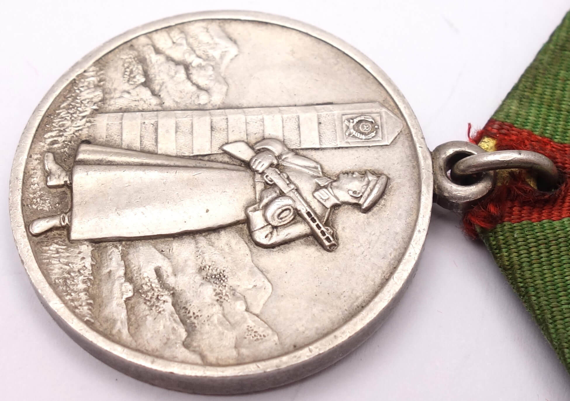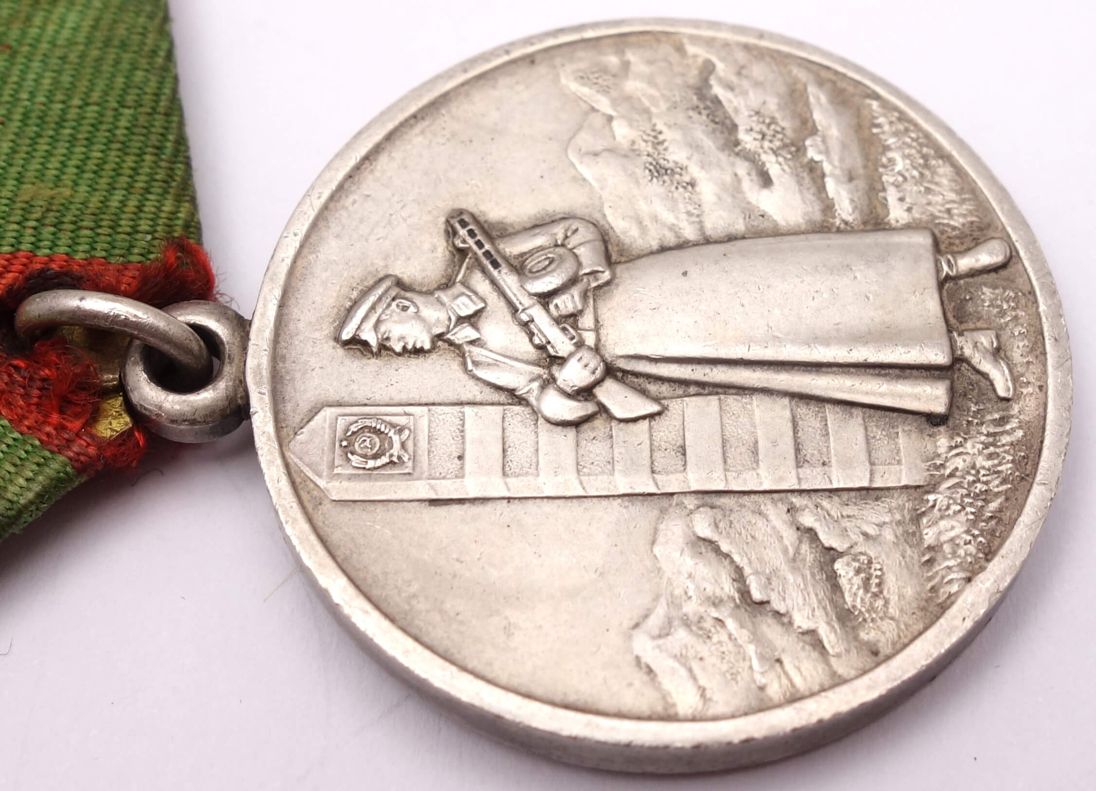 In nice condition with crisp details. It shows several small dings and scratches on both sides but its details are still perfectly visible. Both sides show a light patina to the silver and its connection ring has not been cut. The medal comes with its time period brass suspension and ribbon.