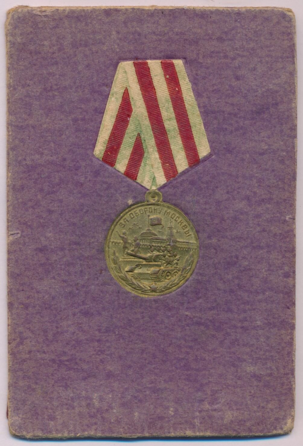 The document is housed in an original and rarely seen booklet featuring a colorized embossed image of the medal. Available sources suggest these covers were produced specifically for Moscow residents, defenders of the capital.