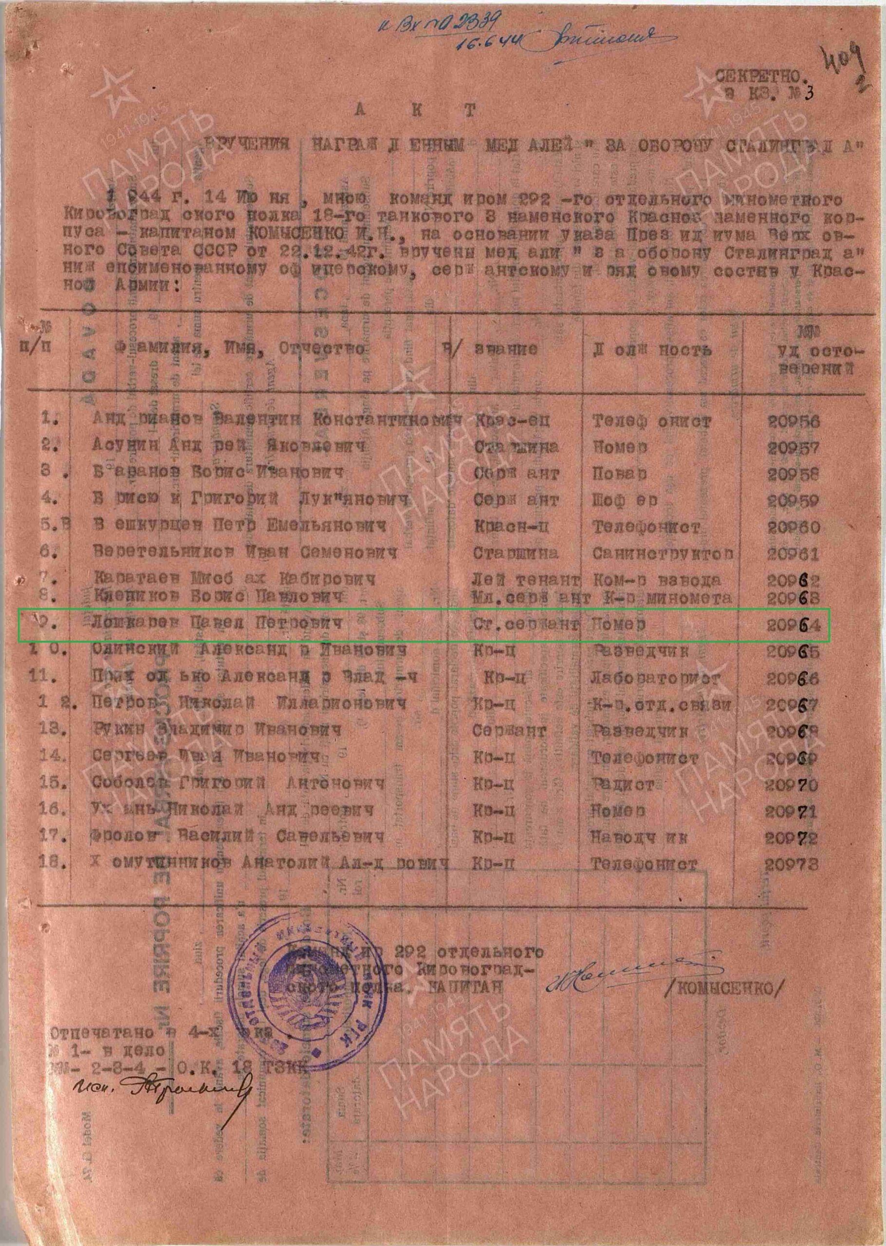 Its accompanying document is in used condition and enforced/repaired with tape. It is dated 14 June 1944 and numbered Ф 20964.The decree we found on Paymyat matches the details perfectly (see picture gallery).