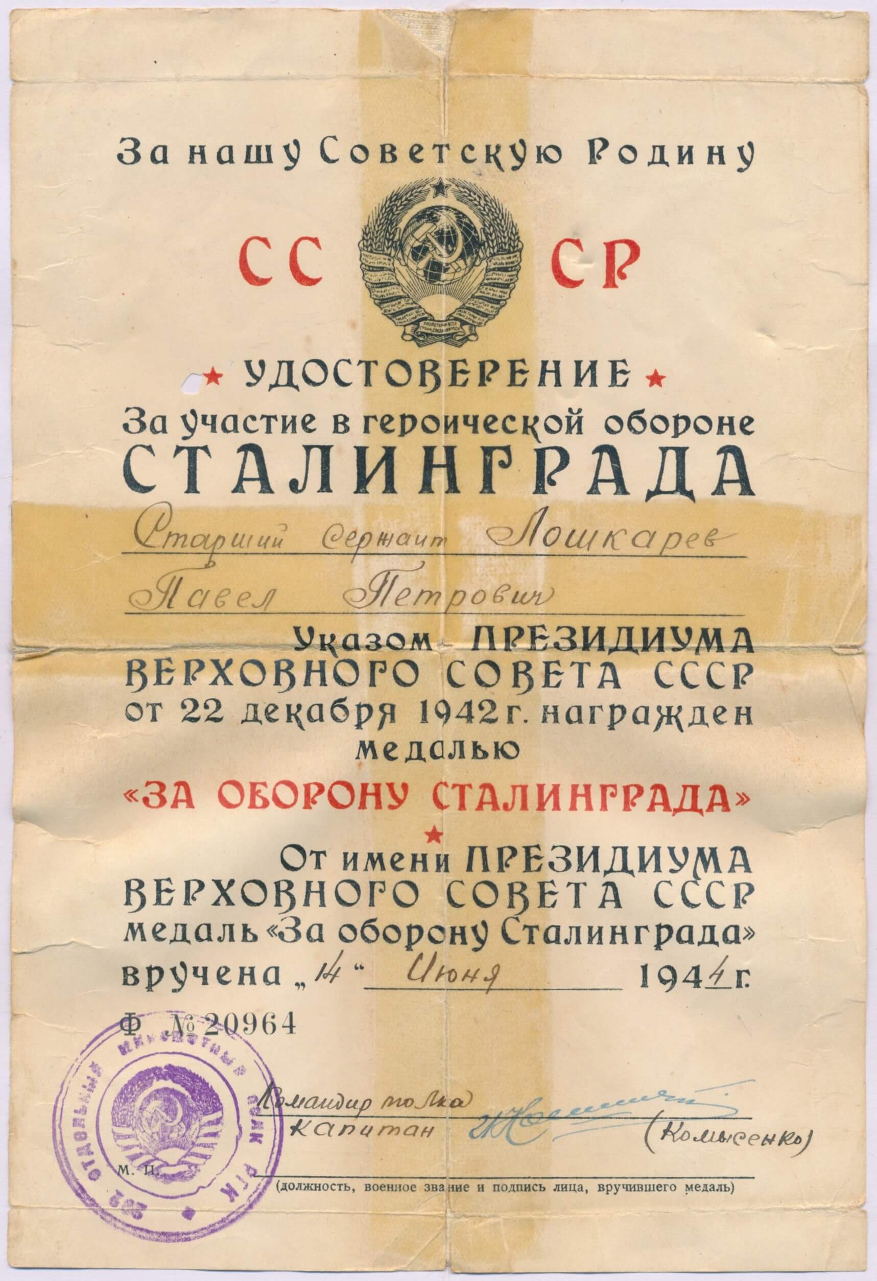 Awarded to Sergeant Pavel Petrovich Loshkarev (ŠŠ°Š²ŠµŠ» ŠŠµŃŃŠ¾Š²ŠøŃ ŠŠ¾ŃŠŗŠ°ŃŠµŠ²)