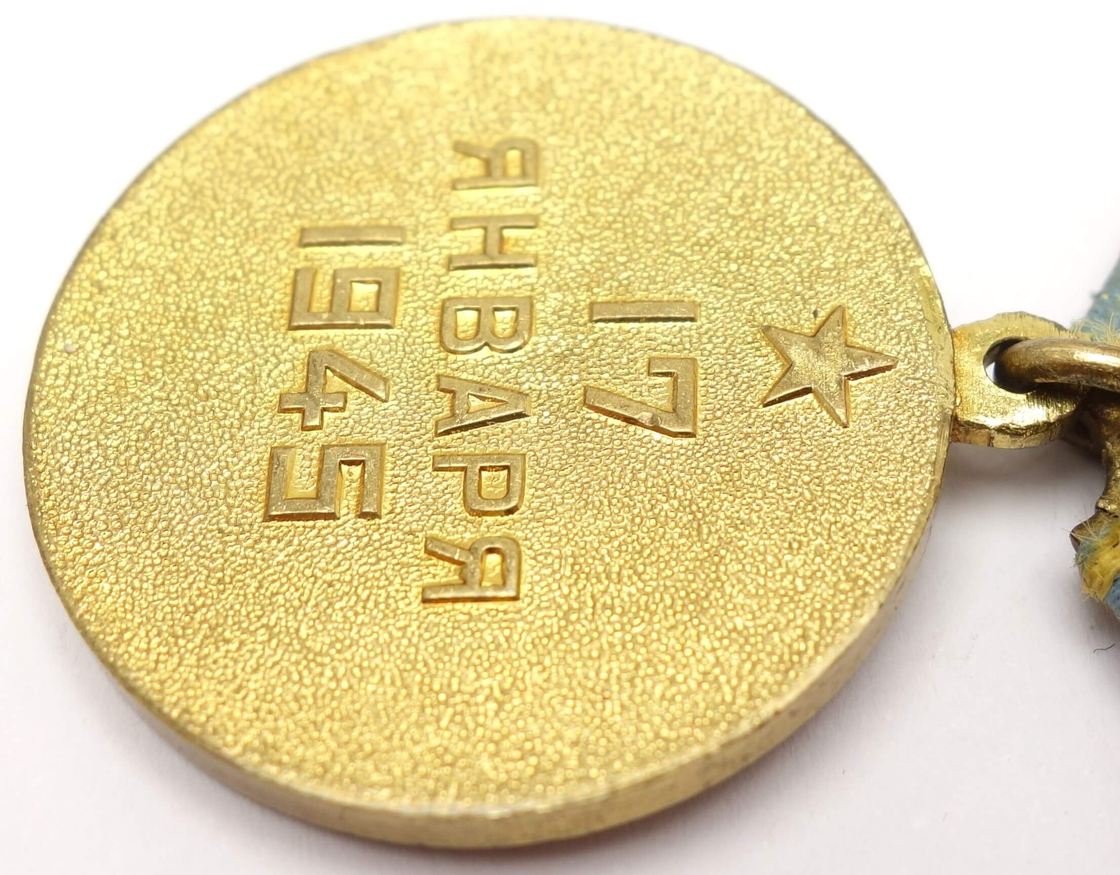 The medal is in great condition with crisp details and most of the original gold-like luster still present. The medal shows light overall wear and few tiny dings and scratches only. It comes with a time period brass suspension.