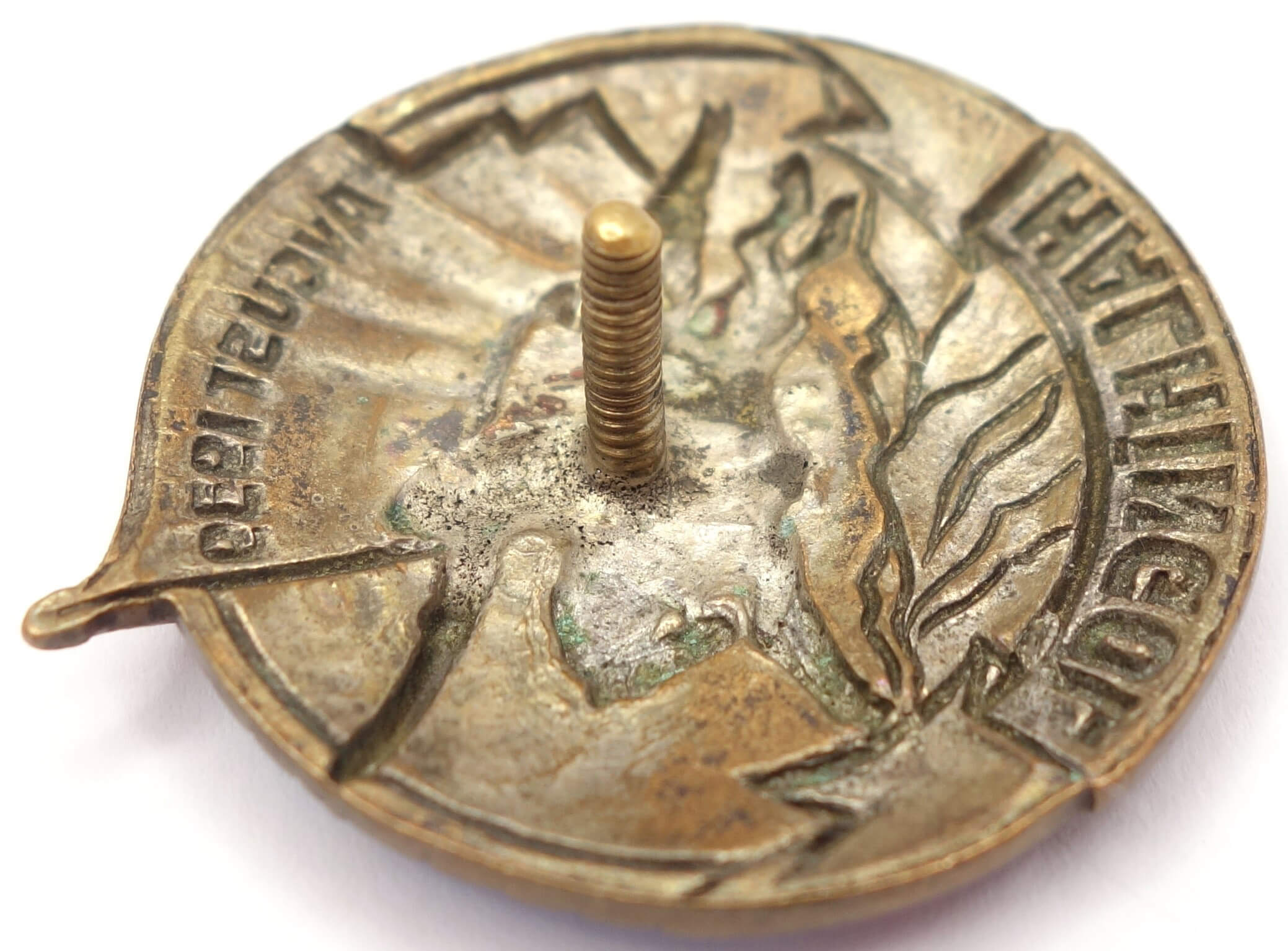 In nice condition with light to medium overall wear. Most details are crisp and some of the original silver plating is still present on its reverse. The enamels are generally well preserved and without repairs but show a small chip to the blue area left of the top banner. The badge comes with its well fitted and original screwplate and full length screwpost.