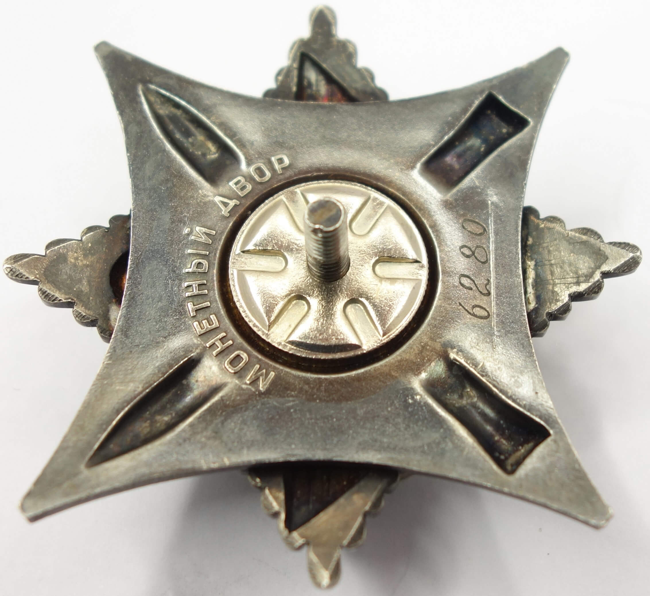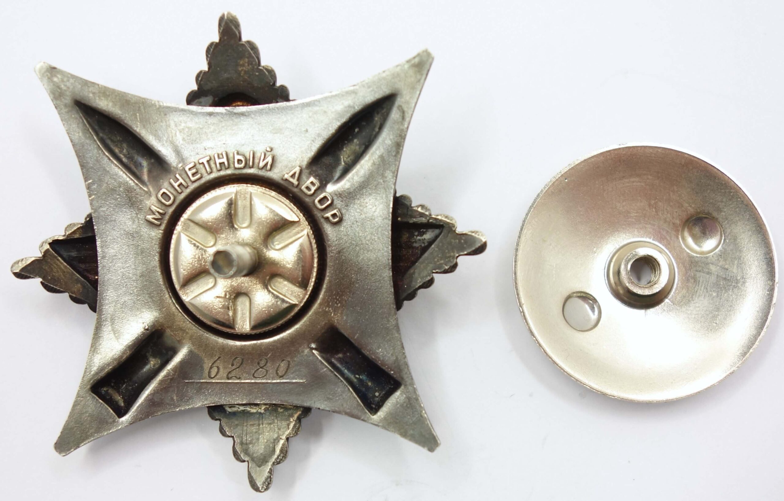 Made of silver and enamels. Measures 57.47 mm in width, 57.46 mm in height and weighs 62.9 grams without its screwplate. The mint mark “Monjetnij dvor” is located above the screw post in one curved line and the serial number “6280 ” is positioned at the bottom of its reverse. This early piece features a semi-mirror reverse which can be seen on the bottom part of the top part by the thin vertical lines.