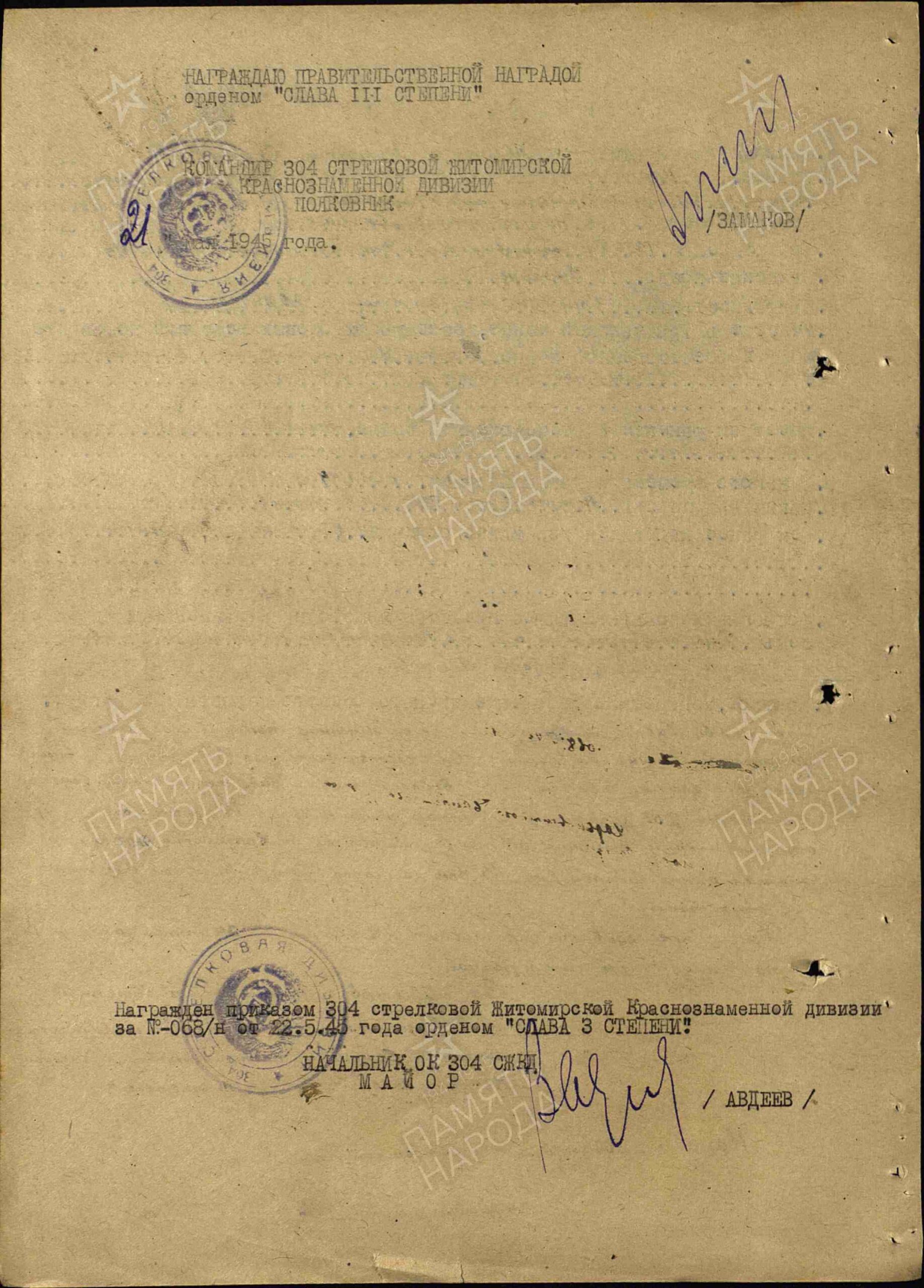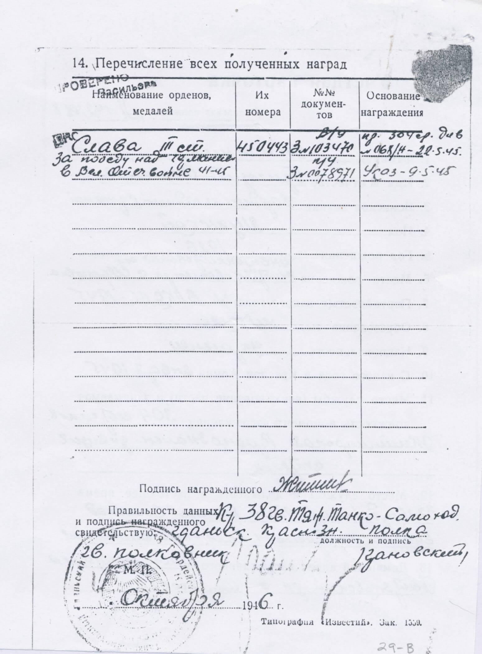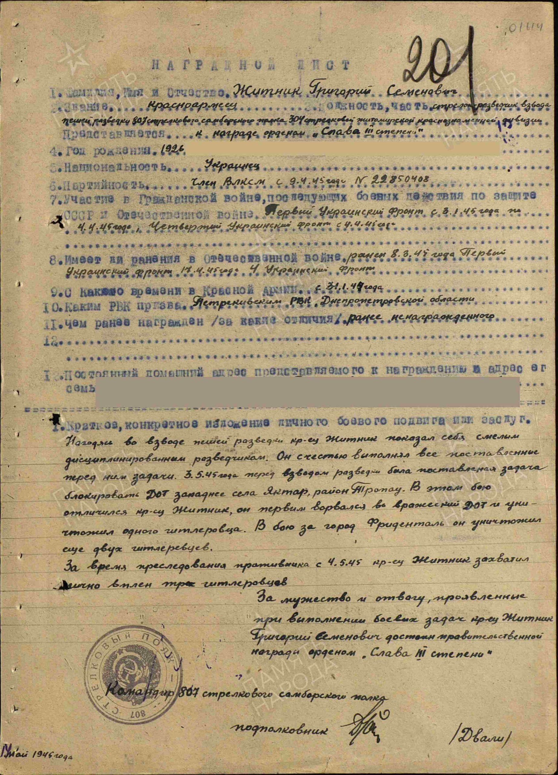 He honorably executed all his assigned tasks. On 3.5.45, the platoon was assigned the mission to block(?) a bunker west of the village of Jaktar, near Tropau. In this battle, Private Zhitnik distinguished himself by being the first to rush into the bunker and kill one Hitlerite. In fighting for Friedenstal, he killed another two Hitlerites.