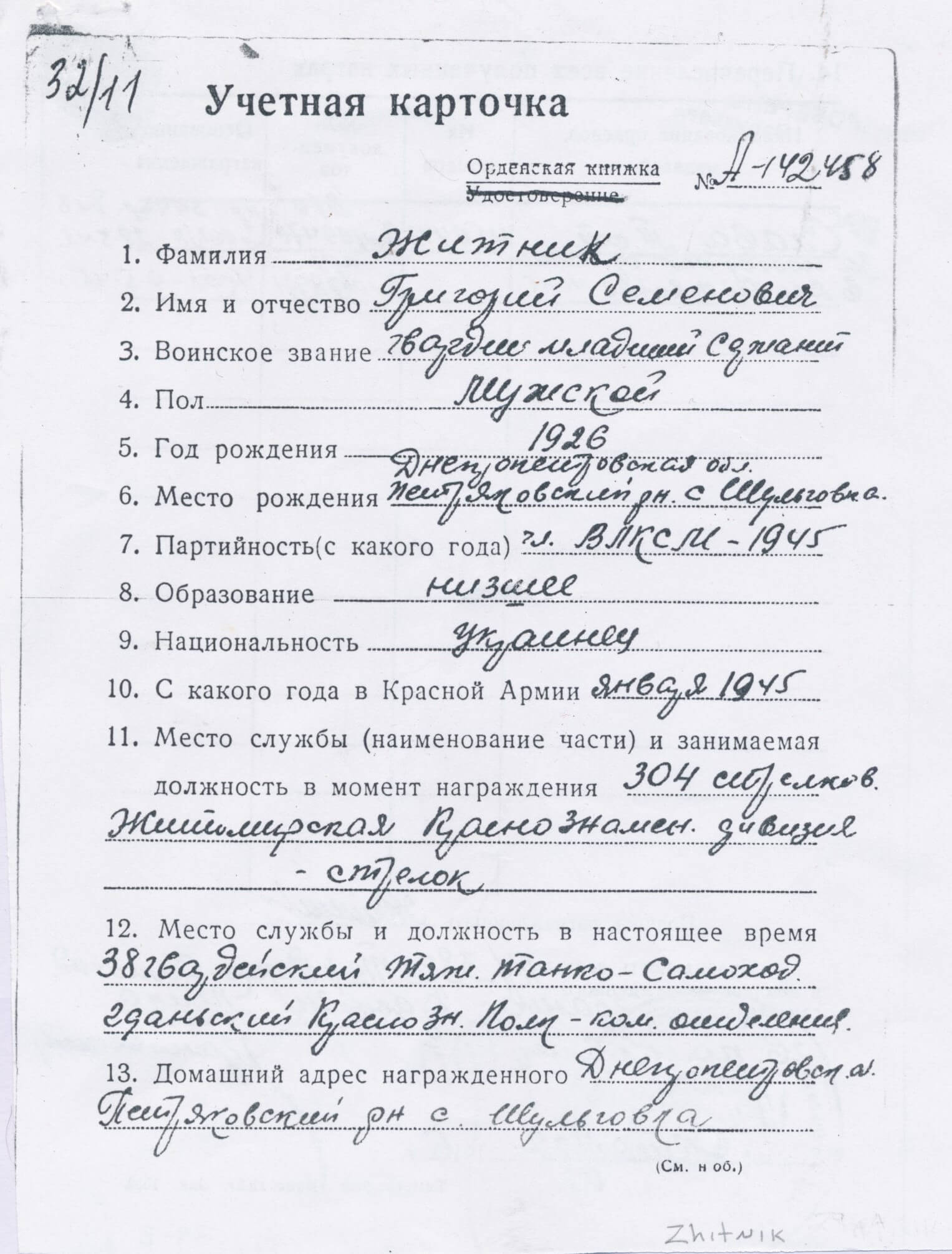 Awarded to Sergeant Grigorii Semenovich Zhitnik (Григорий Семенович Житник)