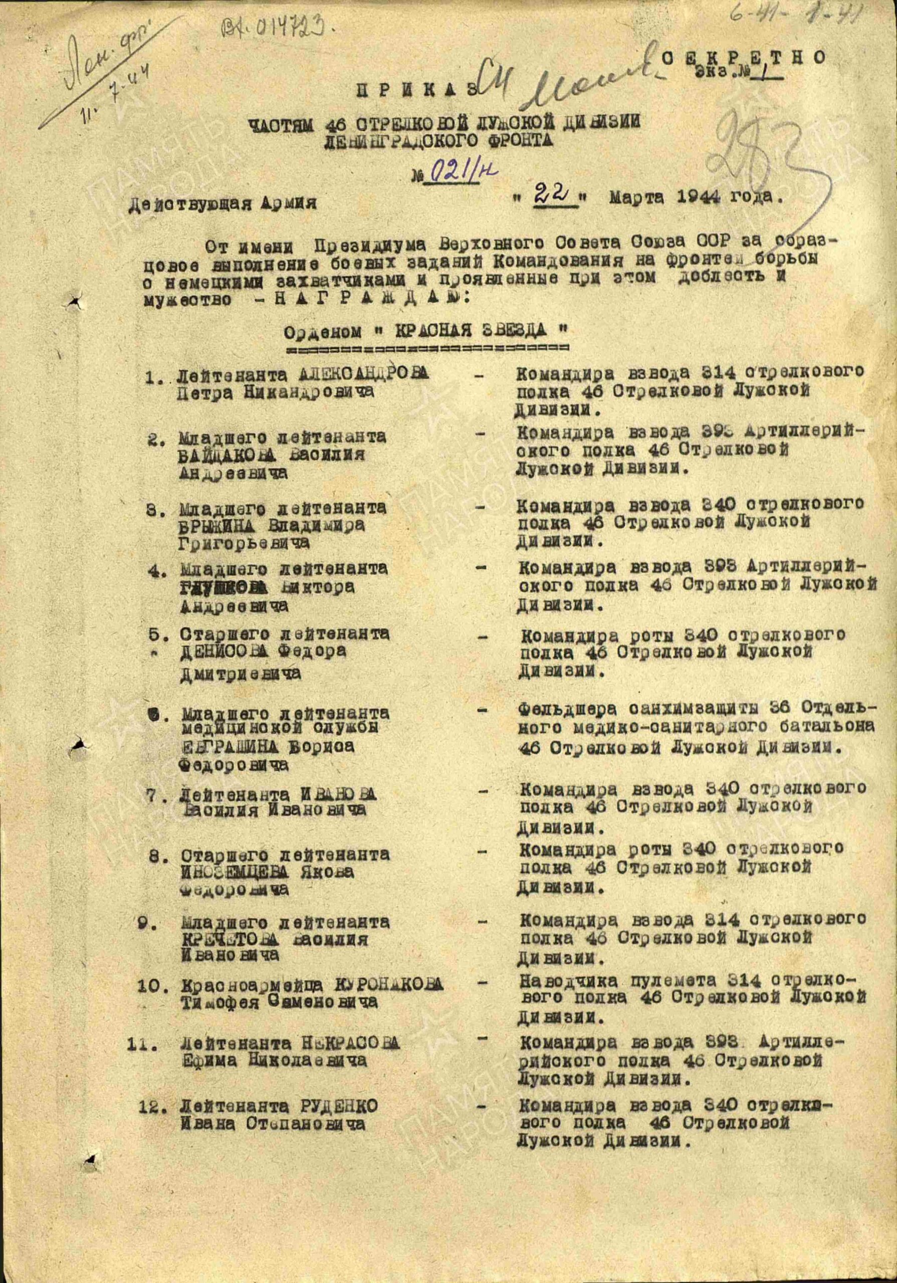 By order of the 46th Rifle Division (No. 21/n) on March 22, 1944, Sergeant Aleksey Petrovich Rogov was awarded the Order of Glory, 3rd Class.