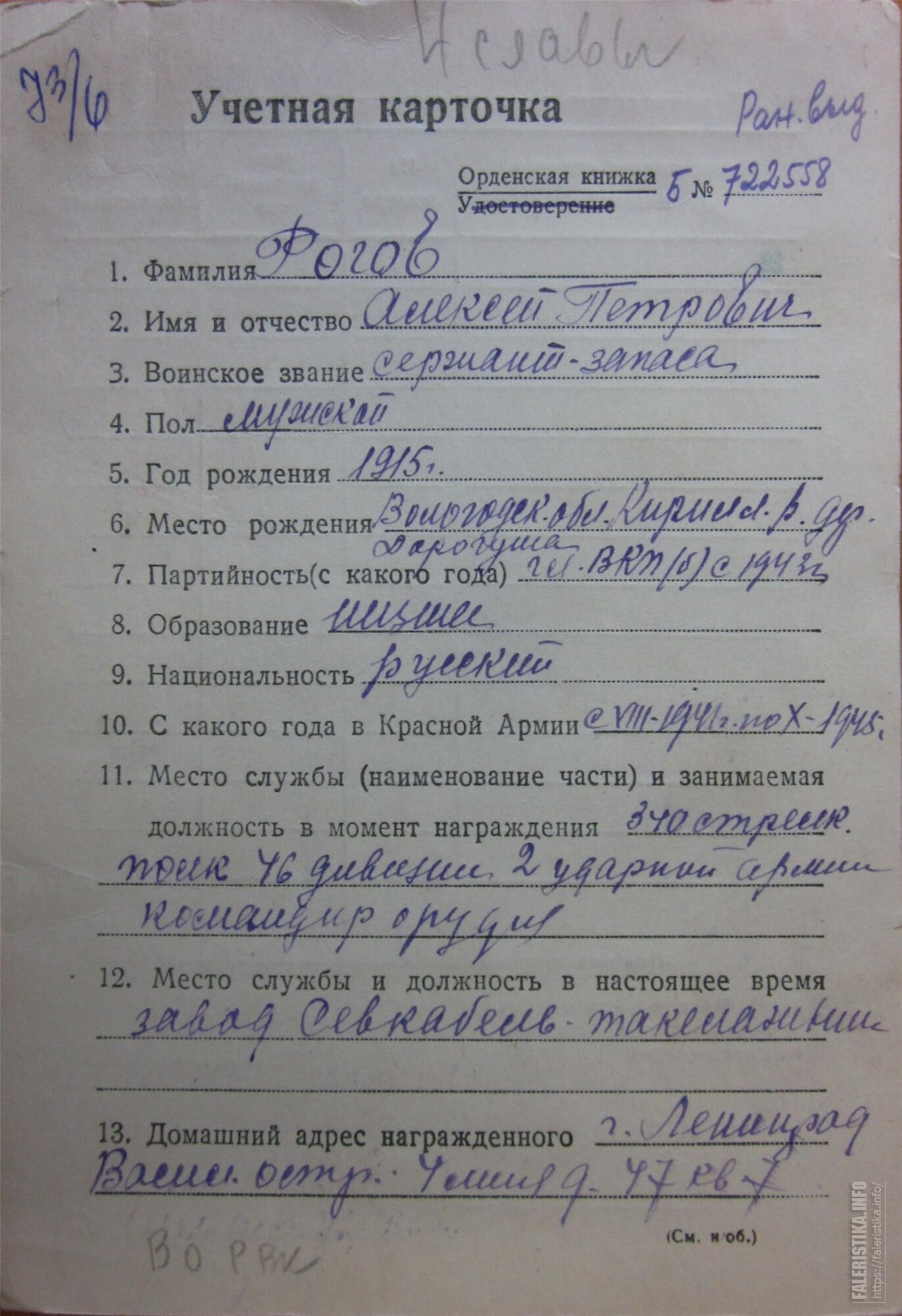 By order for units of the 46th Rifle Division (No. 56/n) dated June 29, 1944,Sergeant Aleksey Petrovich Rogov was awarded a second Order of Glory, 3rd class. Both orders were awarded at the front. Two months later, in September of that year, he and his division participated in the Tallinn Offensive Operation on the Leningrad Front, where he distinguished himself again.