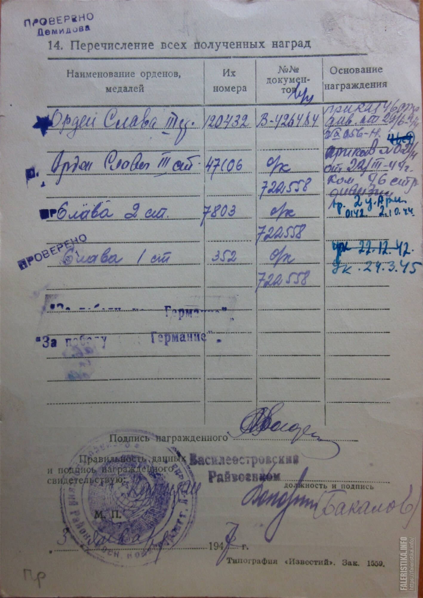 (the award sheet indicates a previous award of two Orders of Glory, 3rd Class).