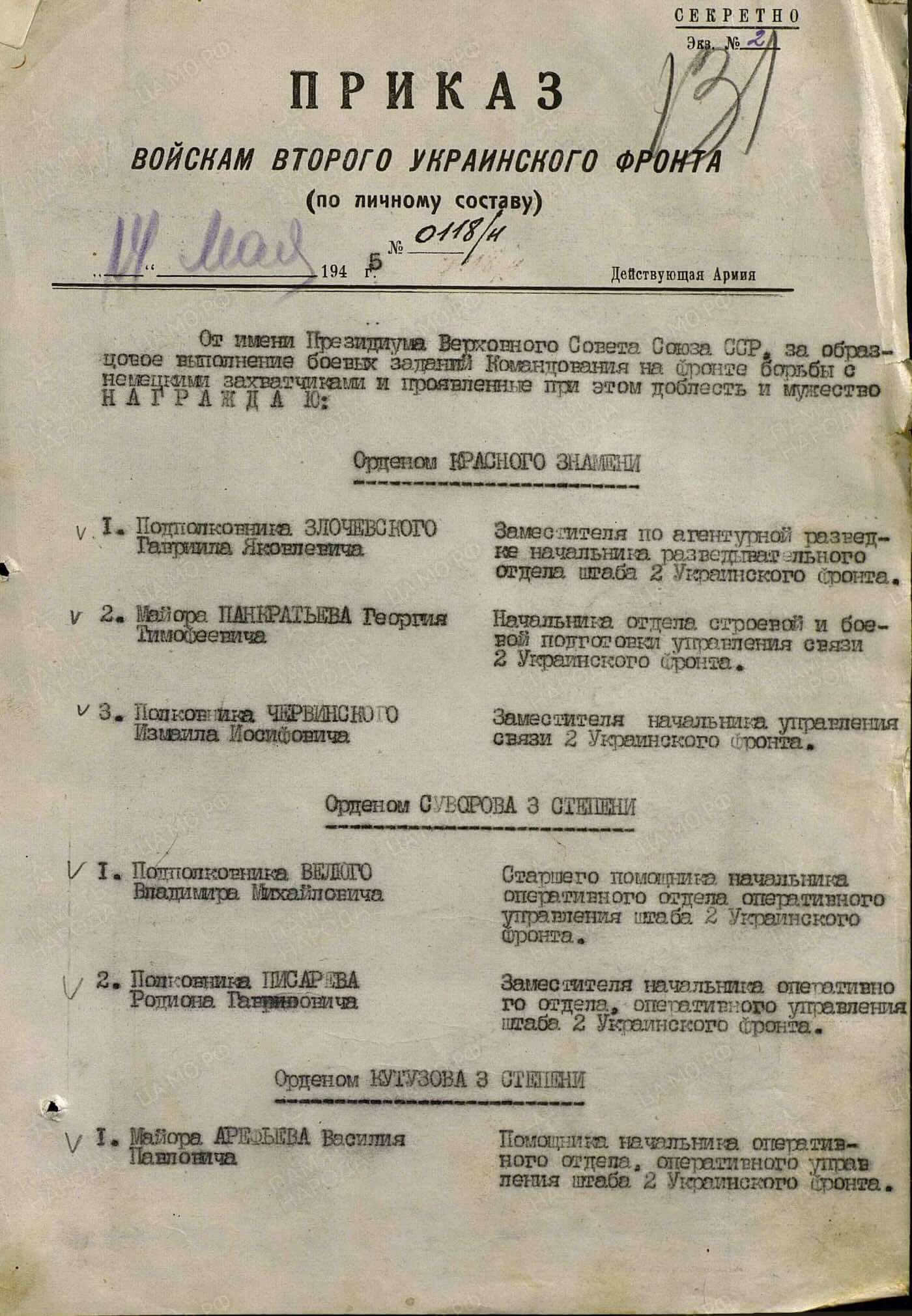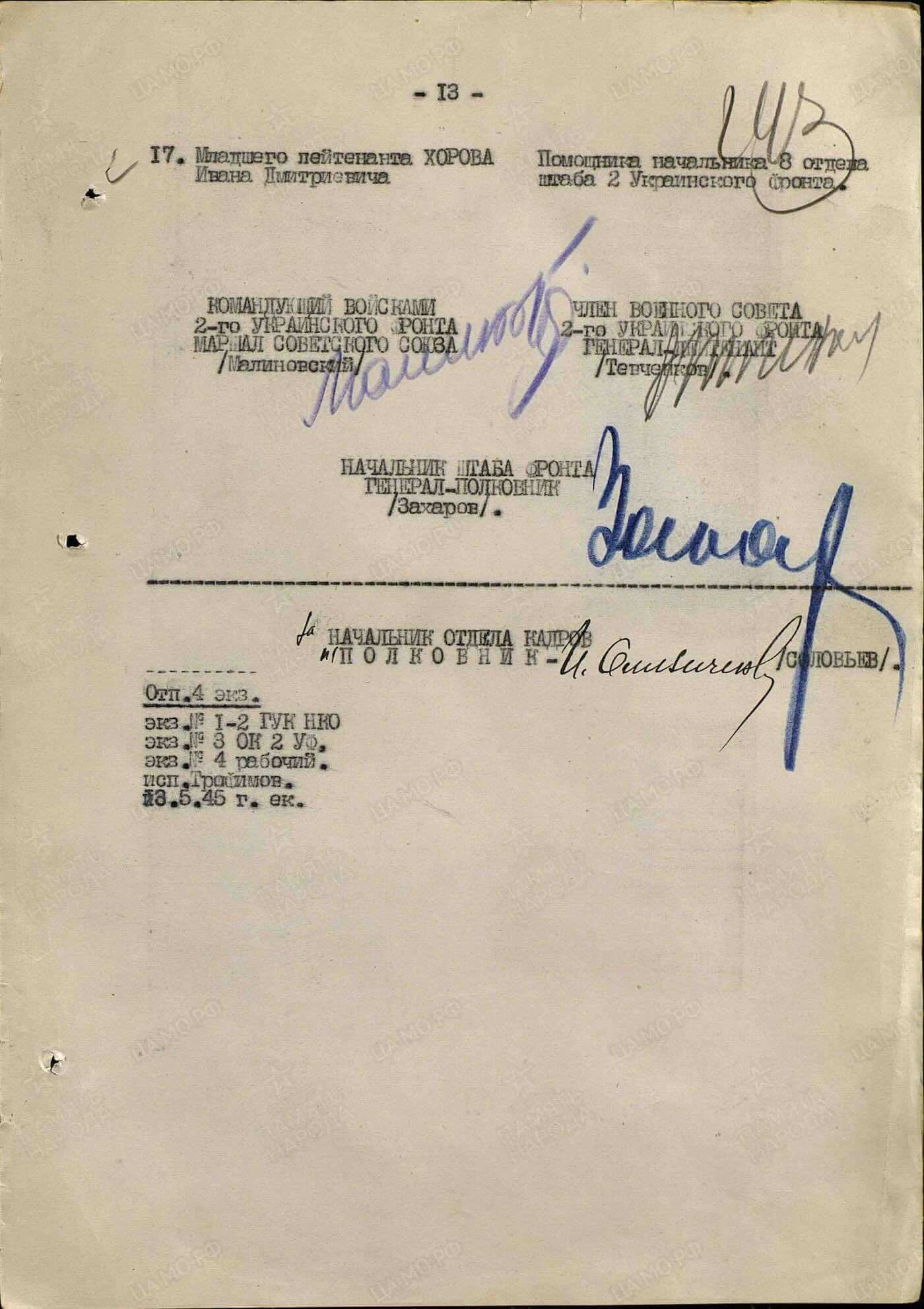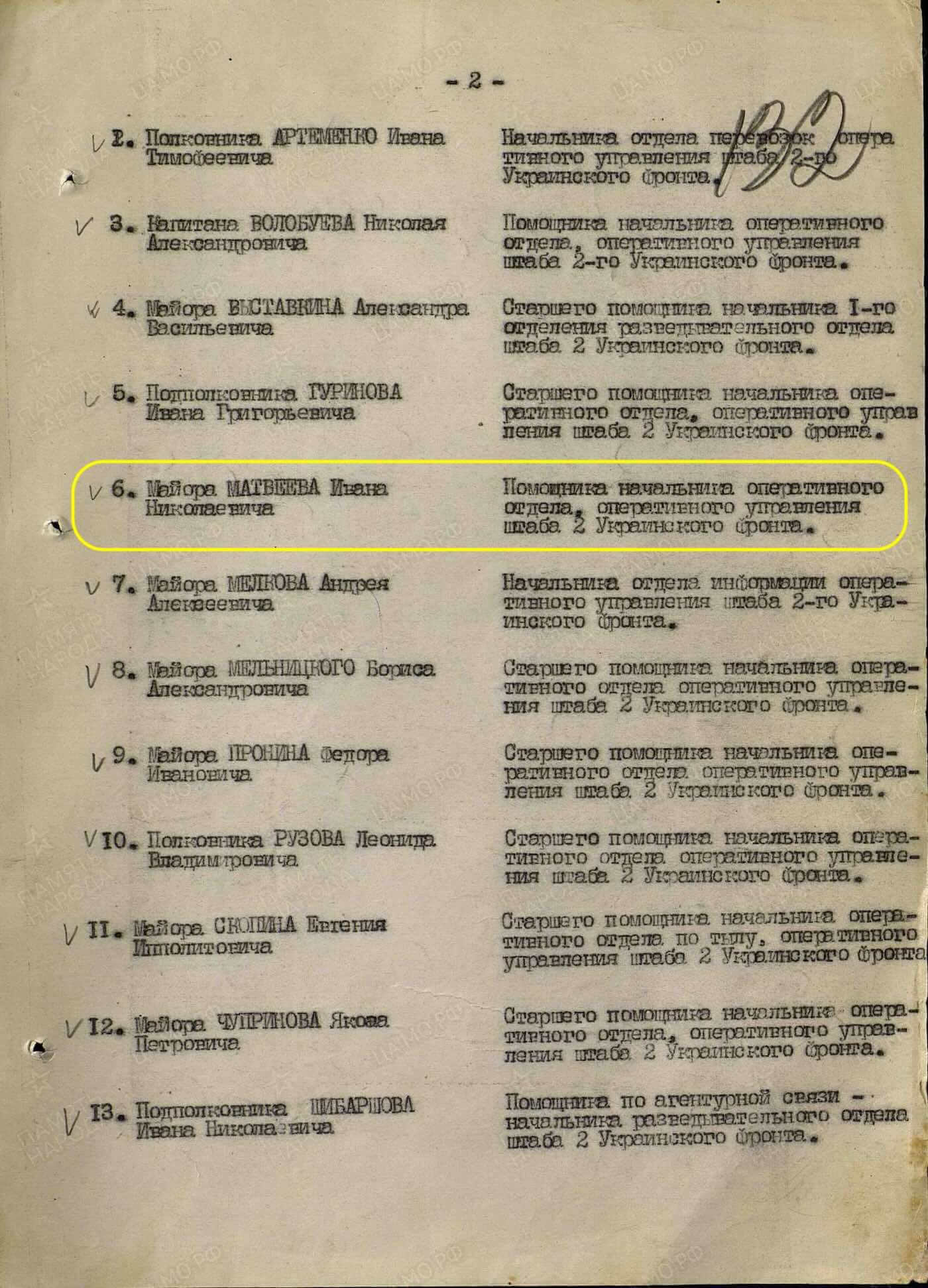 6. Major Matveev, Ivan Nikolayevich — Assistant to the Chief of the Operations Department of the Operations Directorate of the Staff of the 2nd Ukrainian Front.