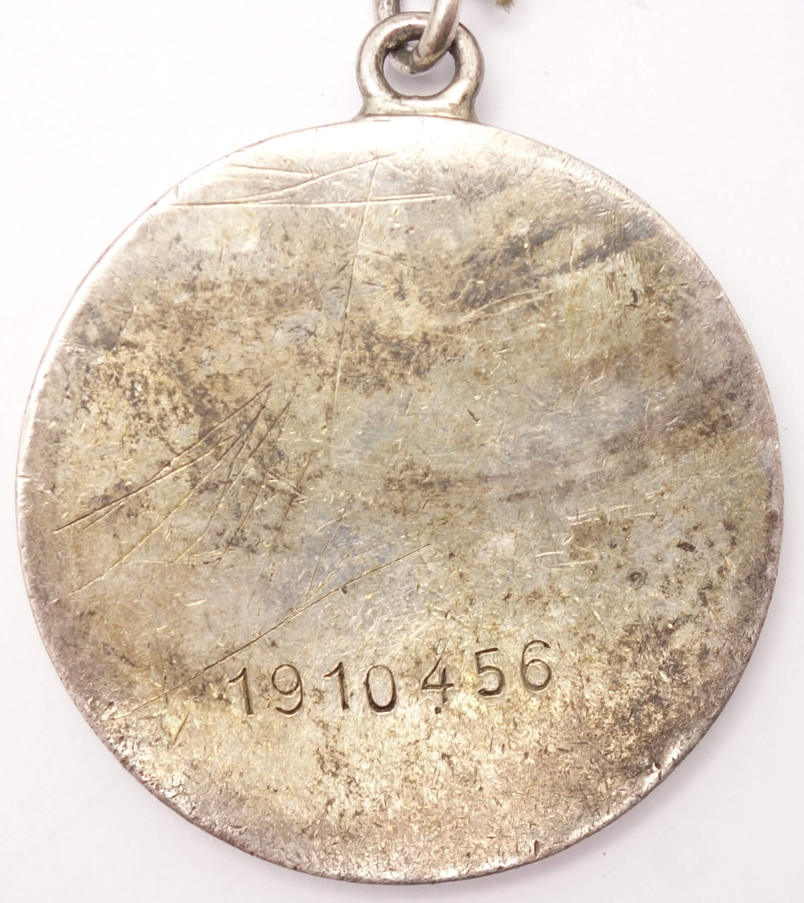 In worn but presentable condition with most details visible and several dings and scratches on both sides. The red lacquer which was originally filling the lettering is worn off and its connection ring has not been cut.