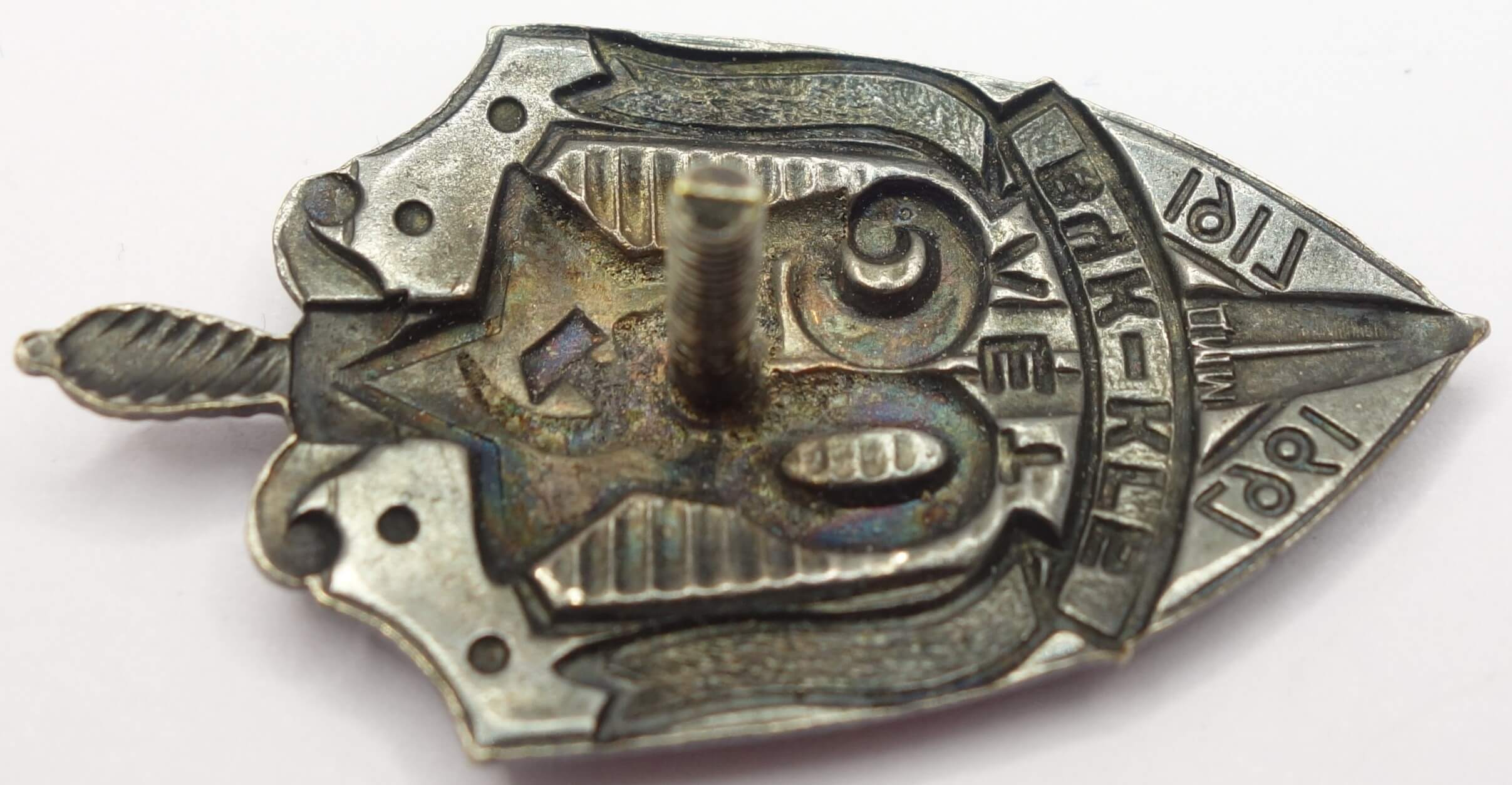 This badge is in excellent condition with its enamels well-preserved and a dark toning on both sides. There are few dings, scratches only and a fair amount of the silver and gold plating is still present. The raised details are crisp and its screw has not been shortened. The badge comes with its well fitted screwplate and there have been no repairs.