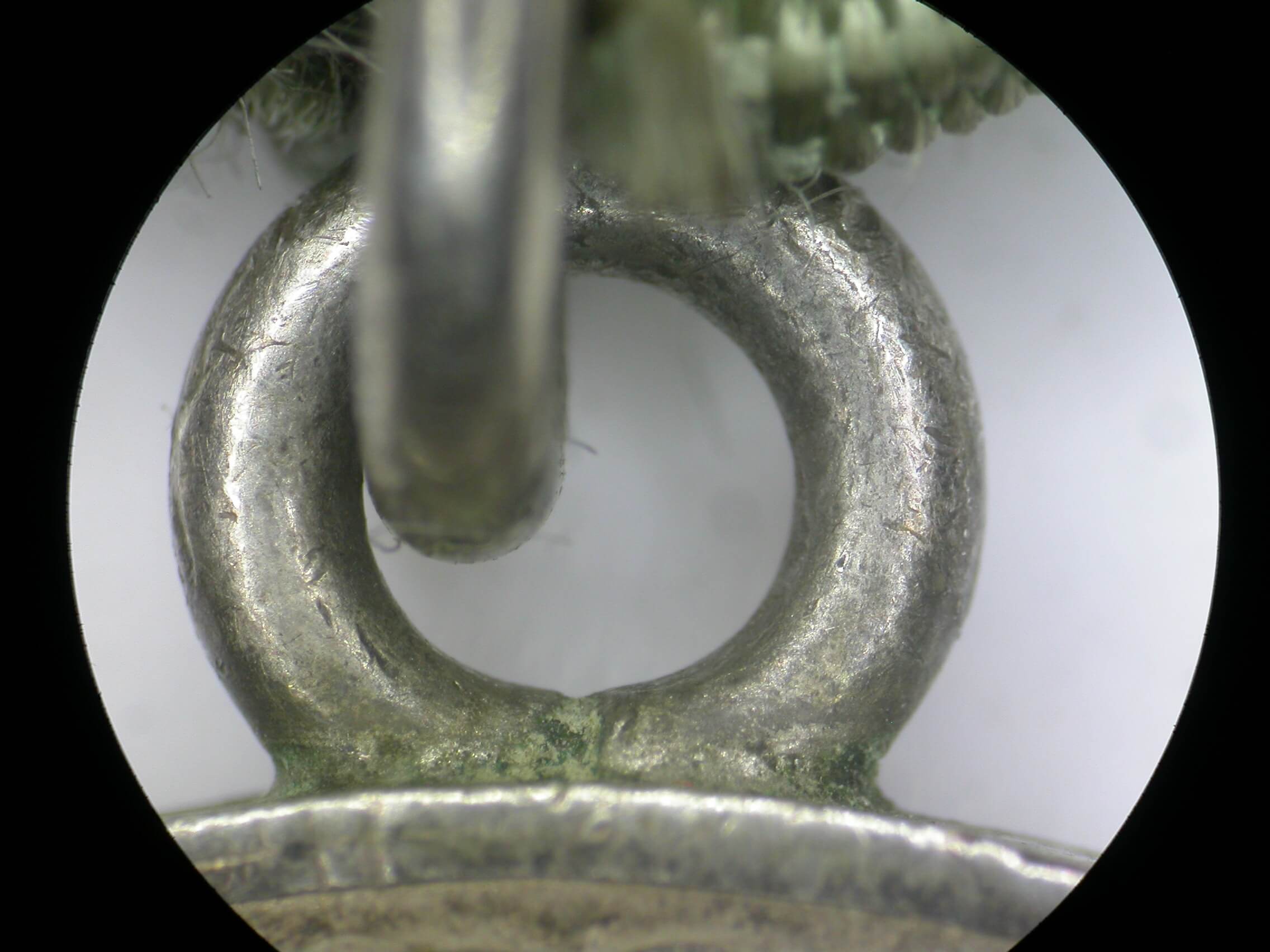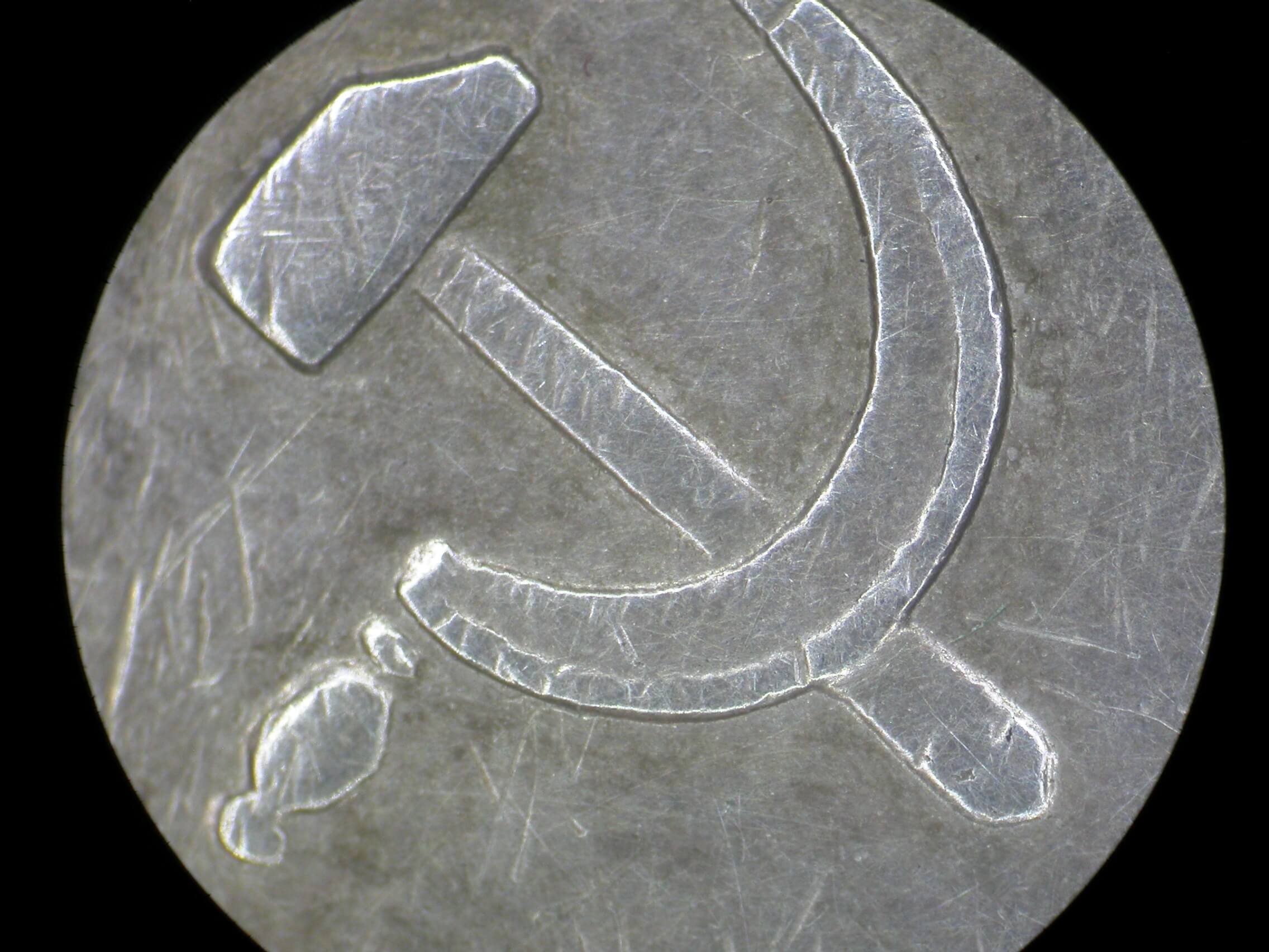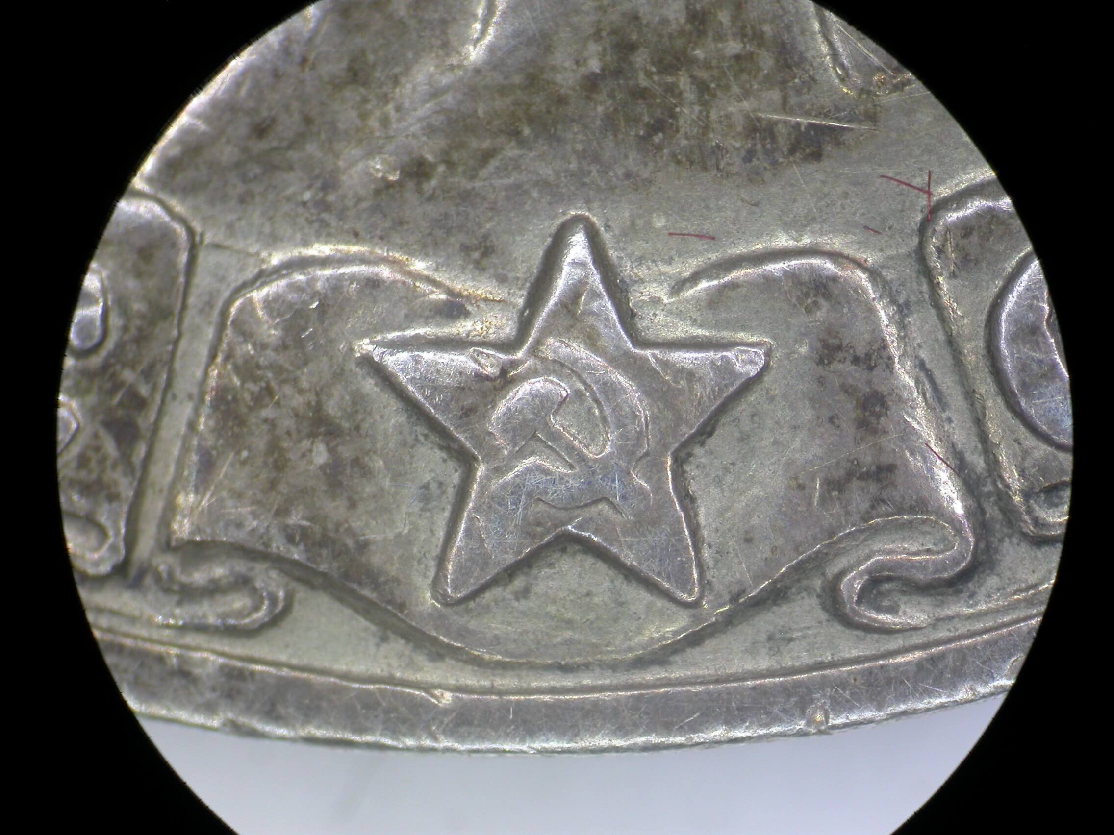 In excellent condition with a light patina to the silver on both sides. The usually worn down hammer and sickle on the lower obverse is still visible, and the lettering on the reverse remains sharp. Both sides show several small dings and scratches. The silver suspension ring is intact, and the double-layer steel suspension is period-correct.