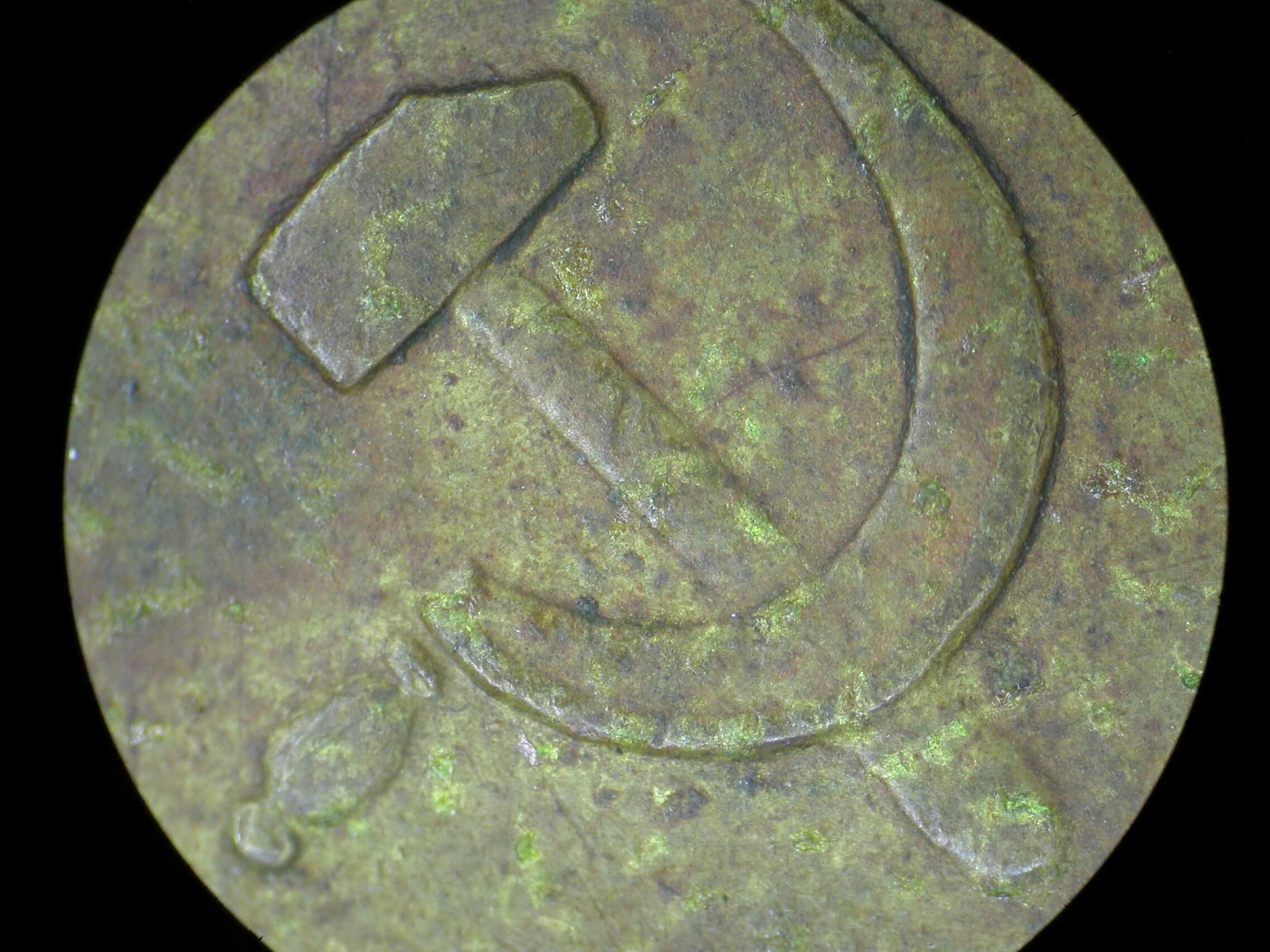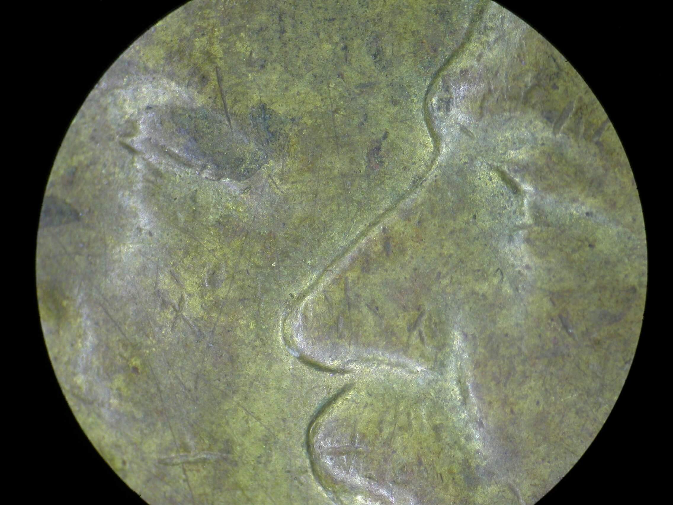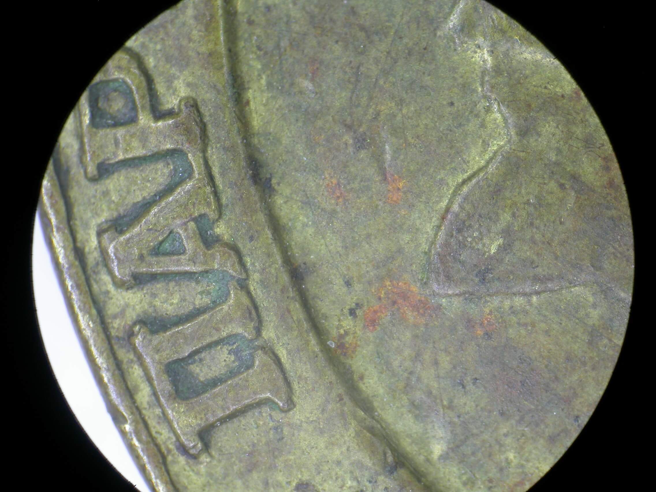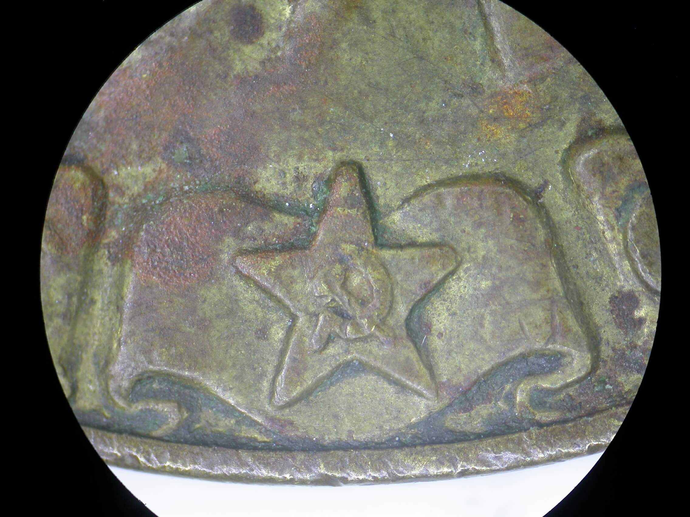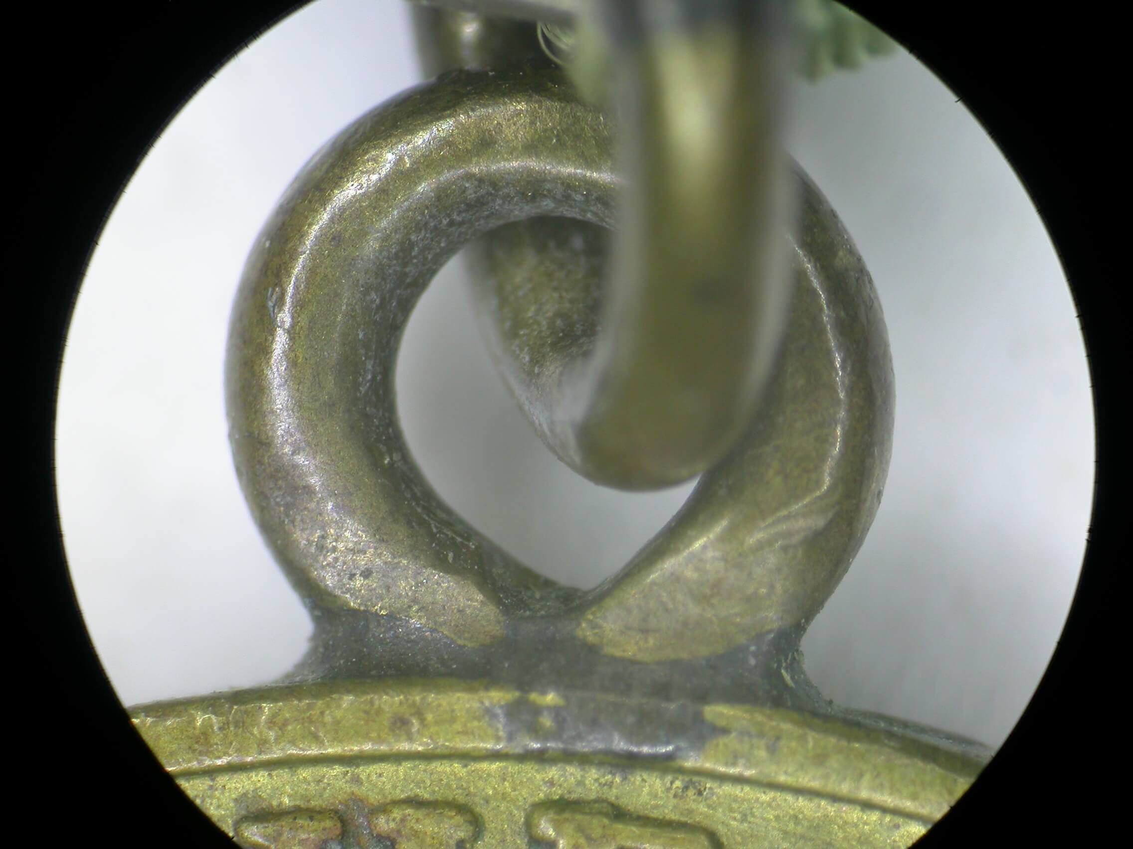 Made of brass. Measures 37.47 mm in height including its eyelet, 32.21 mm in width and weighs 16.1 grams without suspension.
