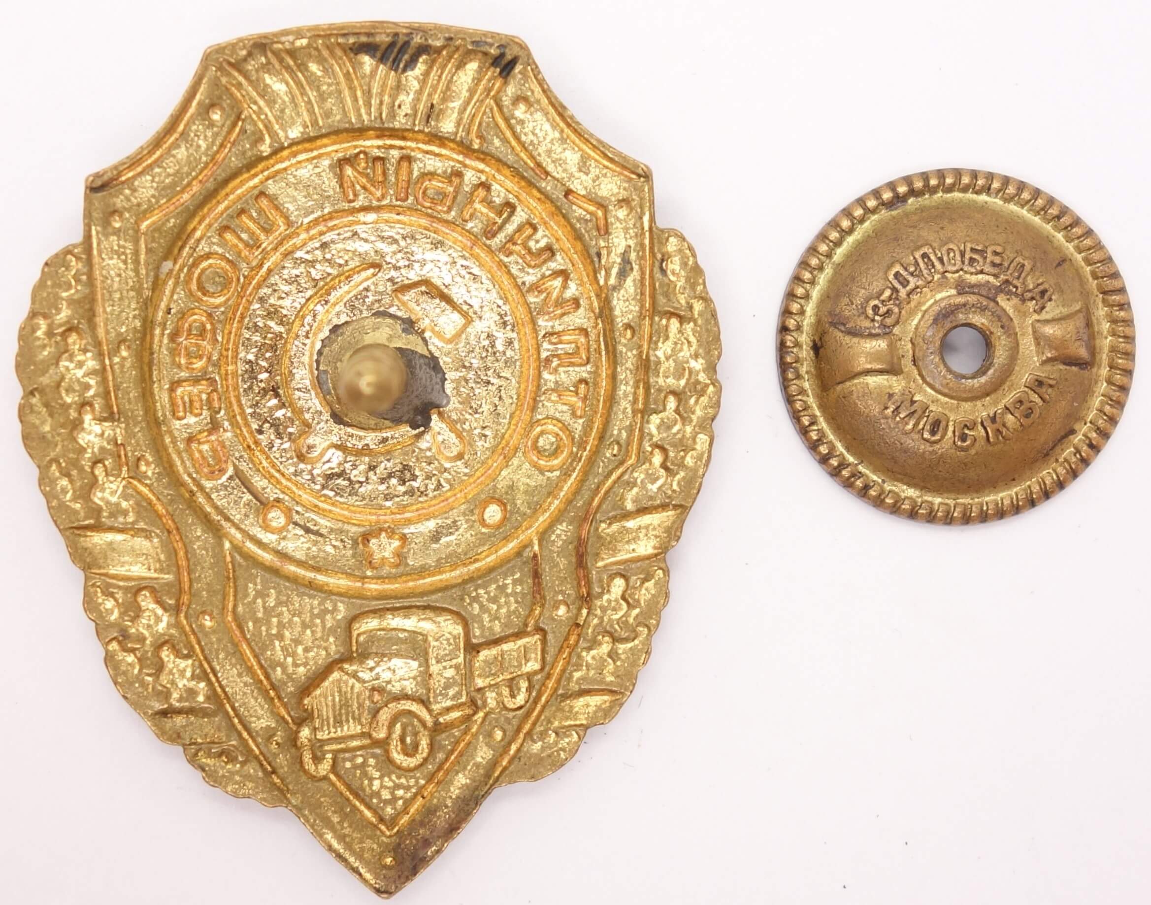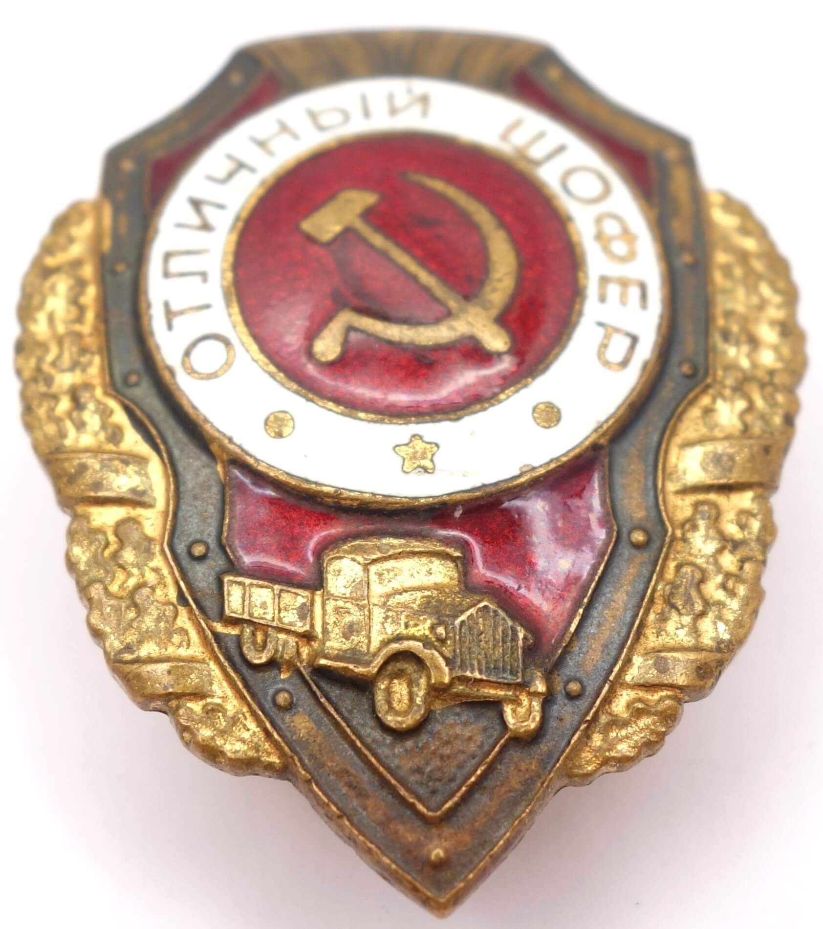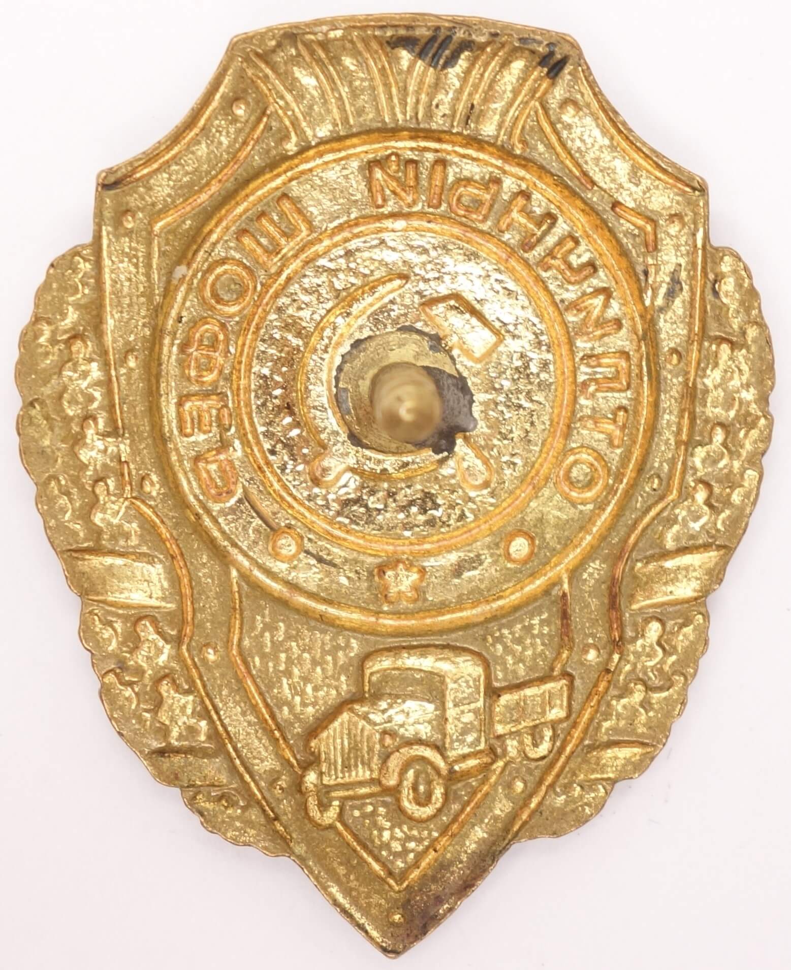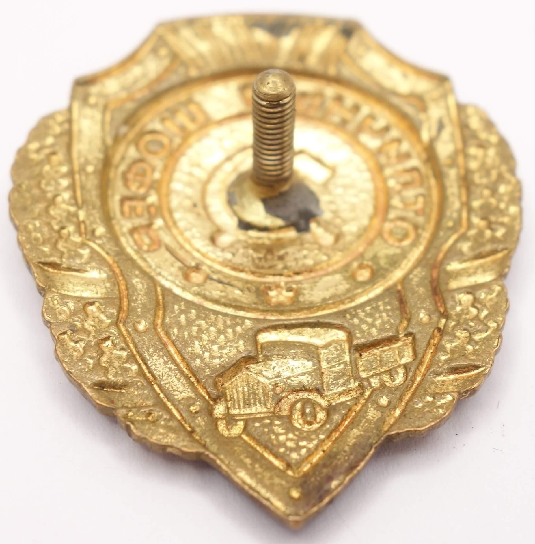 In great condition with sharp details and full gold plating. Even the raised areas, such as the truck, show minimal wear. The red and white enamels are well preserved. The dark red line between the hammer and sickle is not a chip or repair but an internal crack. The badge comes with its original screwplate, and the screw has not been shortened.