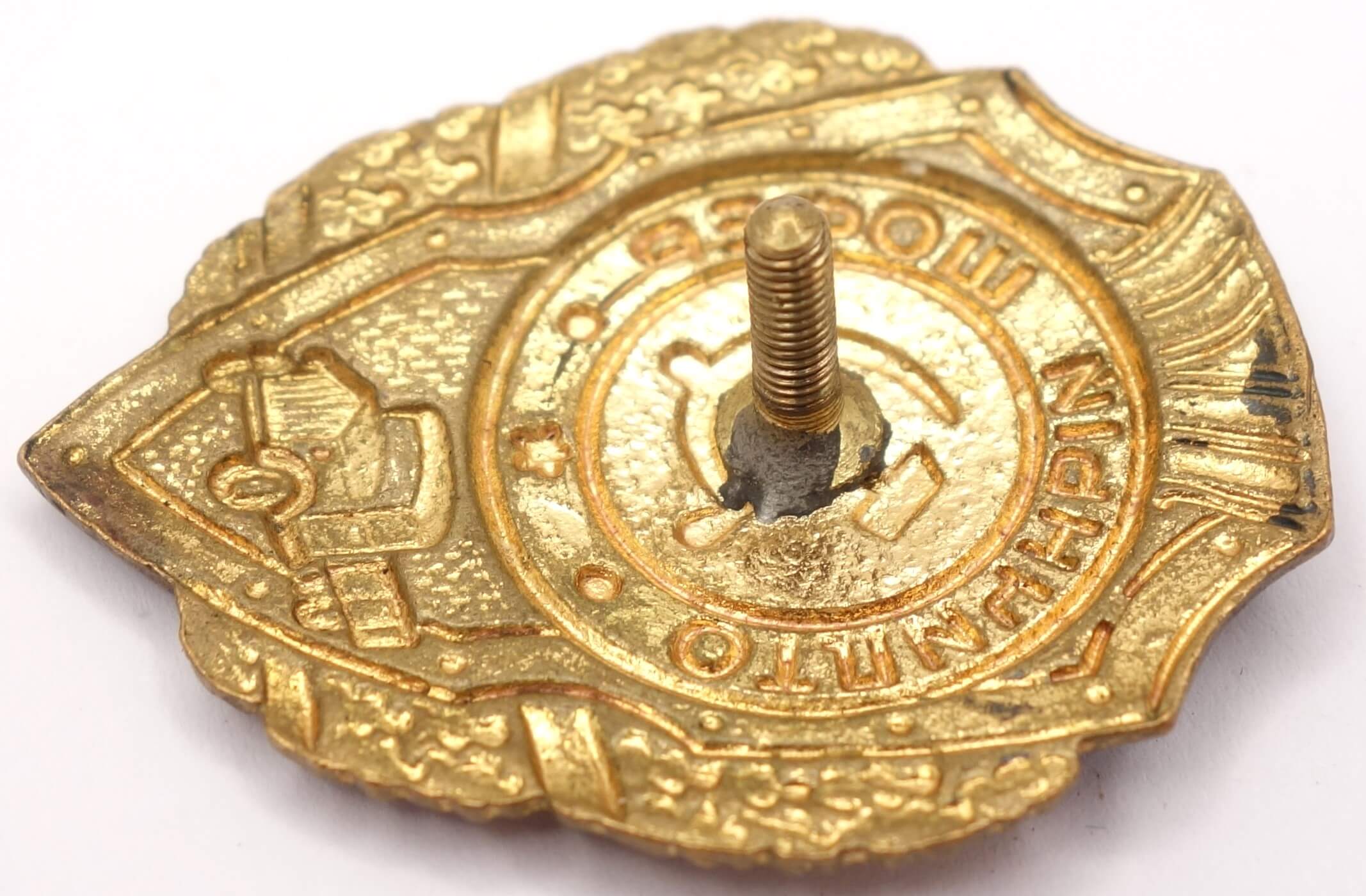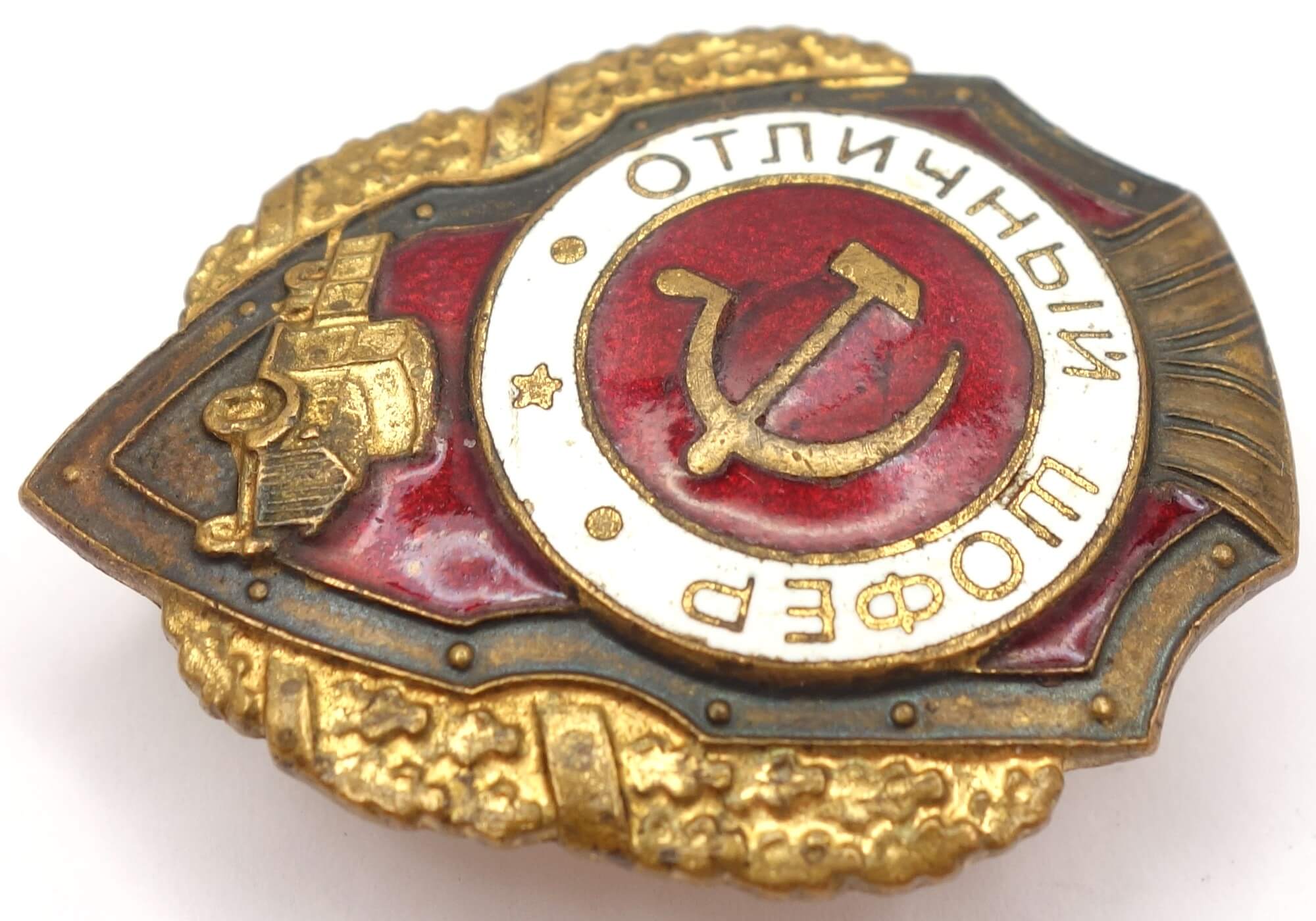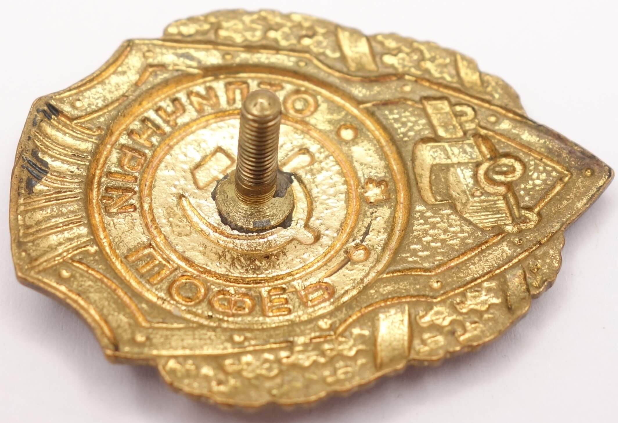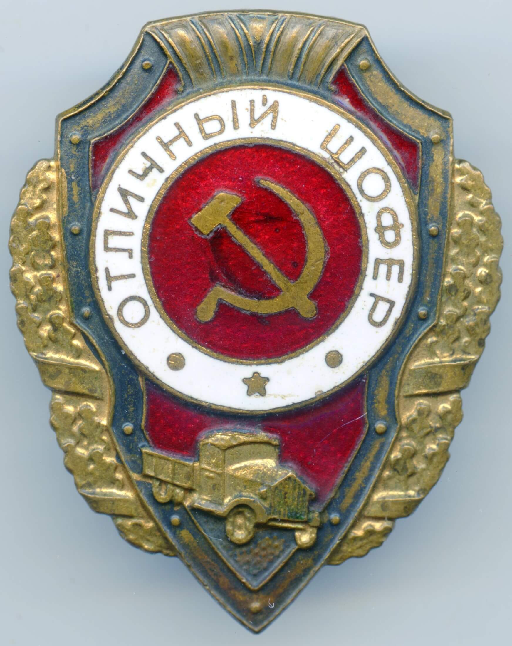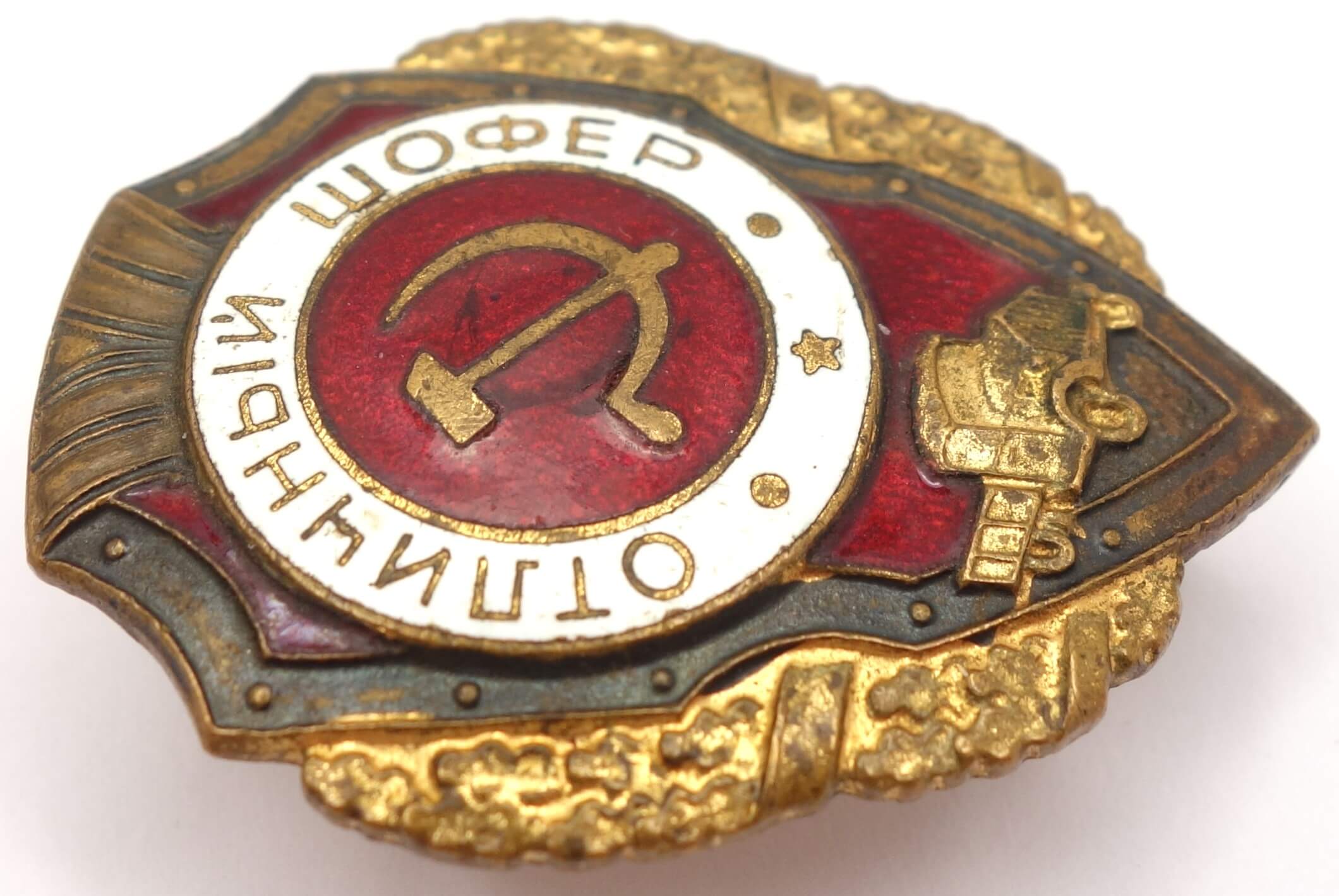 In great condition with sharp details and full gold plating. Even the raised areas, such as the truck, show minimal wear. The red and white enamels are well preserved. The dark red line between the hammer and sickle is not a chip or repair but an internal crack. The badge comes with its original screwplate, and the screw has not been shortened.