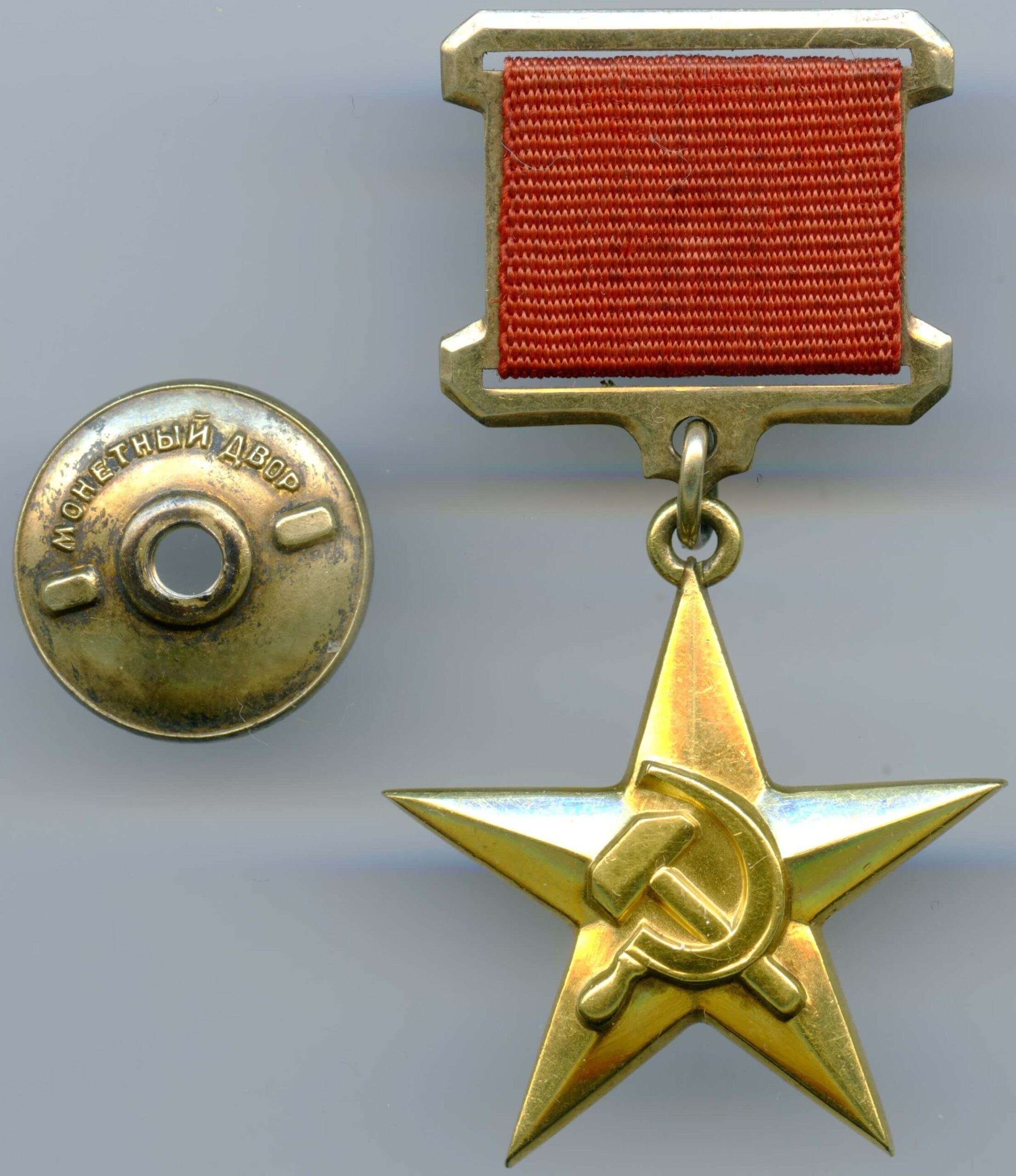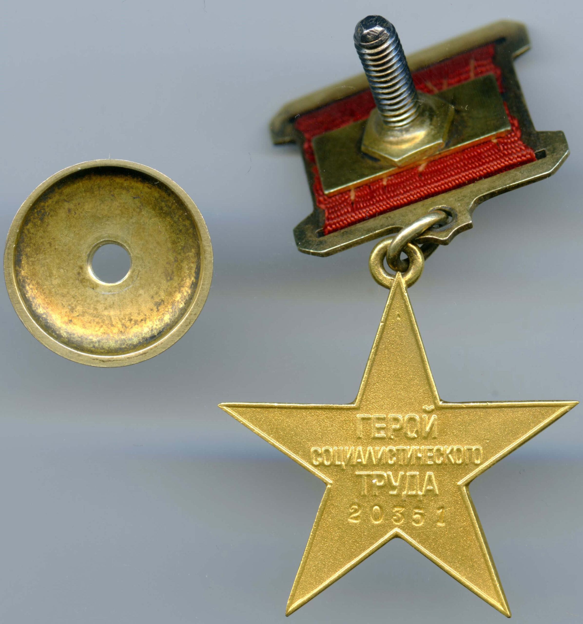Made of solid 23 carat gold. It measures 33.3 mm in height including the eyelet, 30.3 mm in width and weighs 14.8 gram without its suspension. The text Герой Социалистического Труда (Hero of Socialist Labor) is located at the center of the reverse. This early variation has the serial number with large numbers at the 12 o’clock position. The suspension is authentic to the medal and measures 26.3 mm in width at his widest point and 21.4 in height at its narrowest point.
