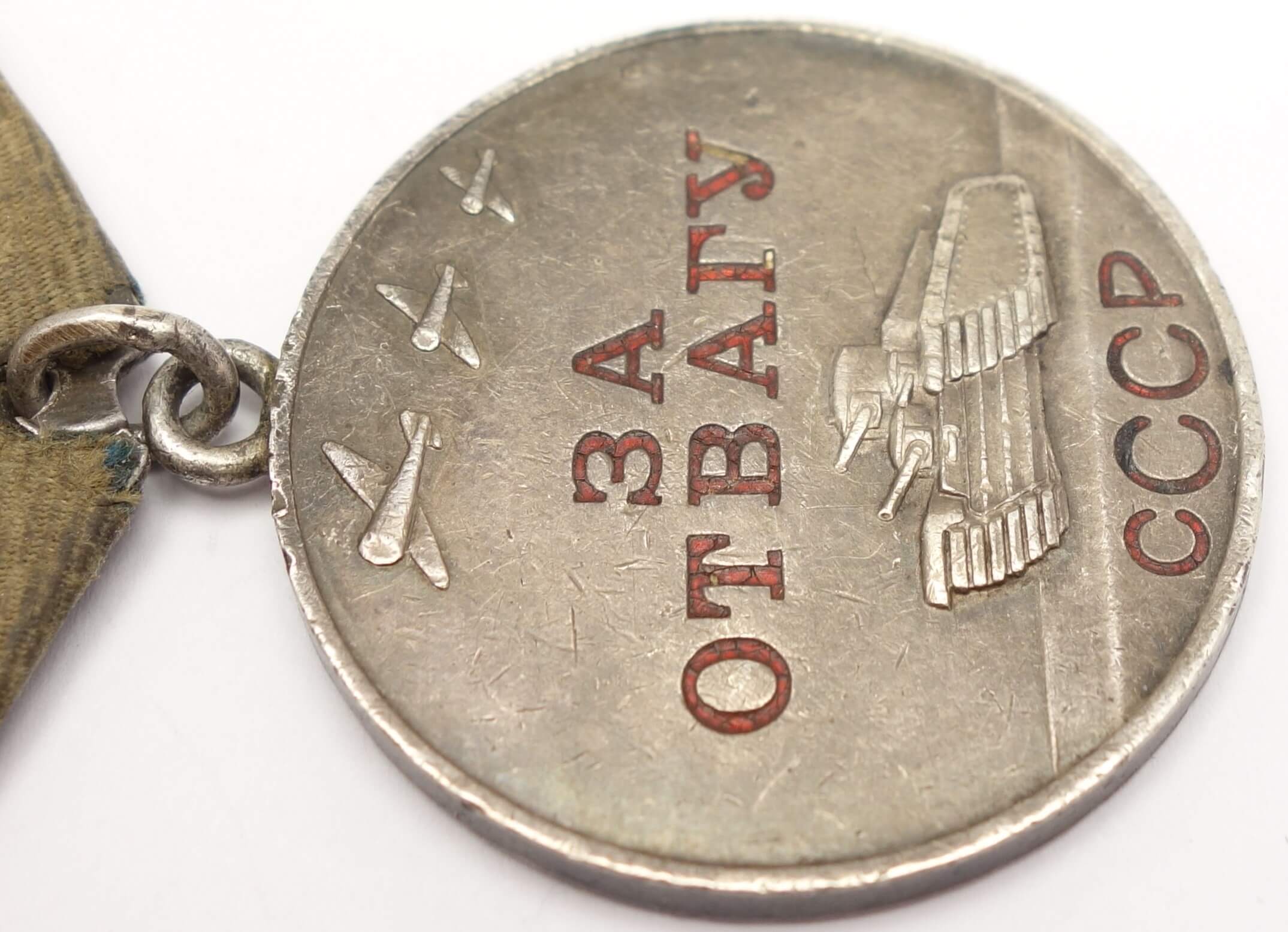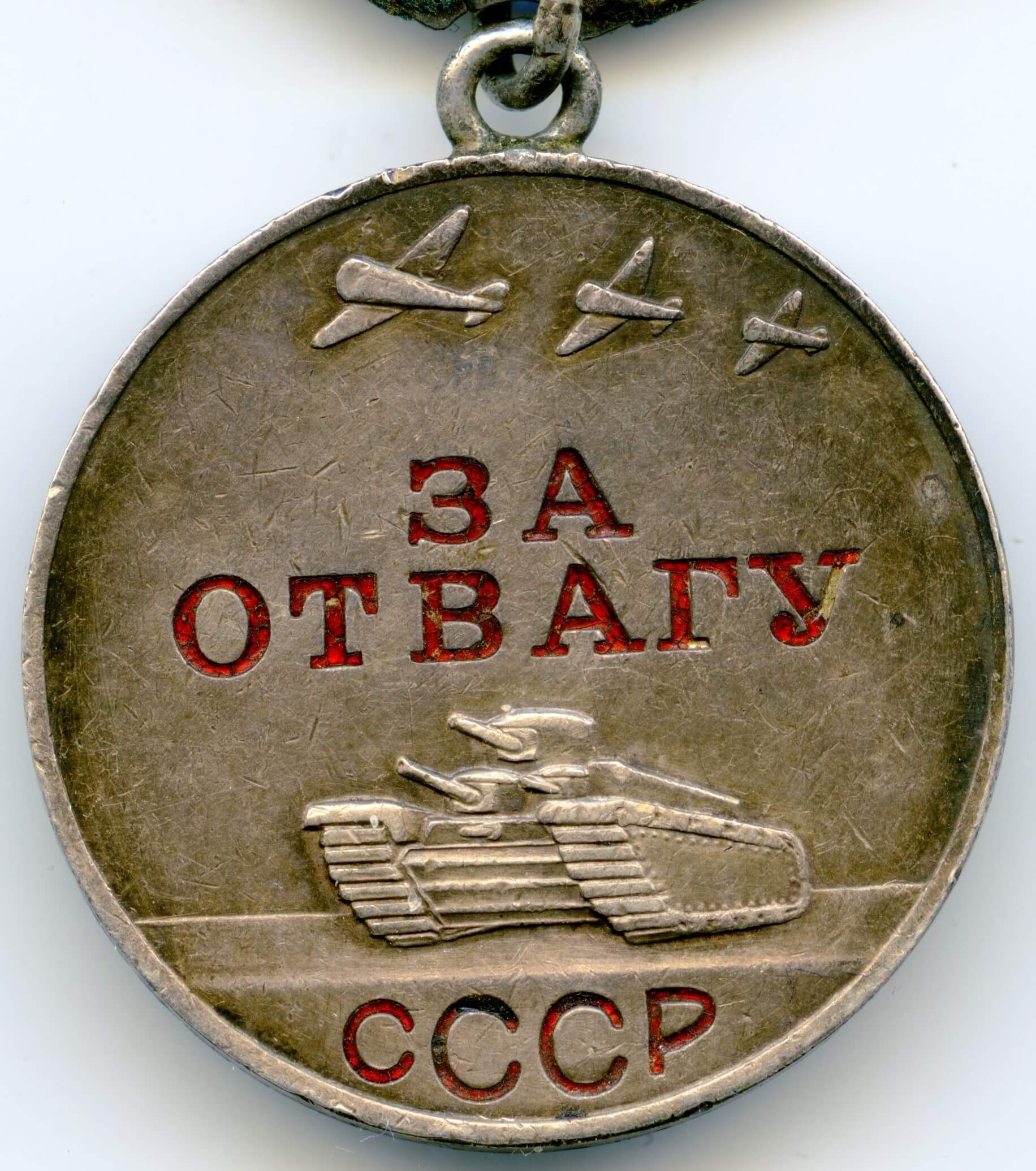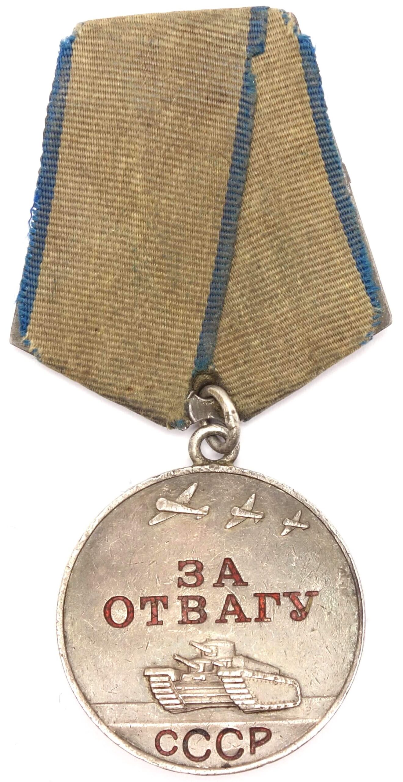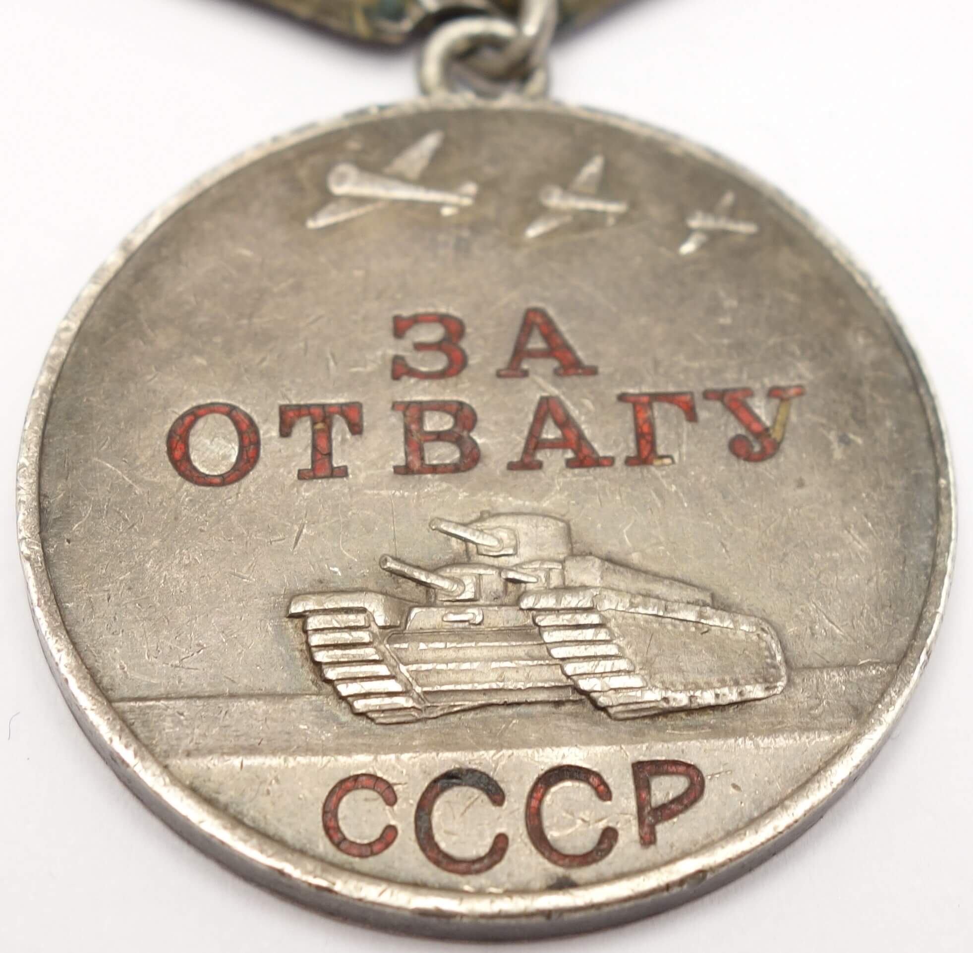 In excellent, above average condition with its details perfectly visible. Even the raised areas like the rivets on the side of the tank and the canons are perfectly visible. Almost all of the original red lacquer is still present which is unusual for war time Bravery Medals. The medal comes with its time period suspension and old, worn ribbon. Its connection ring has not been cut.