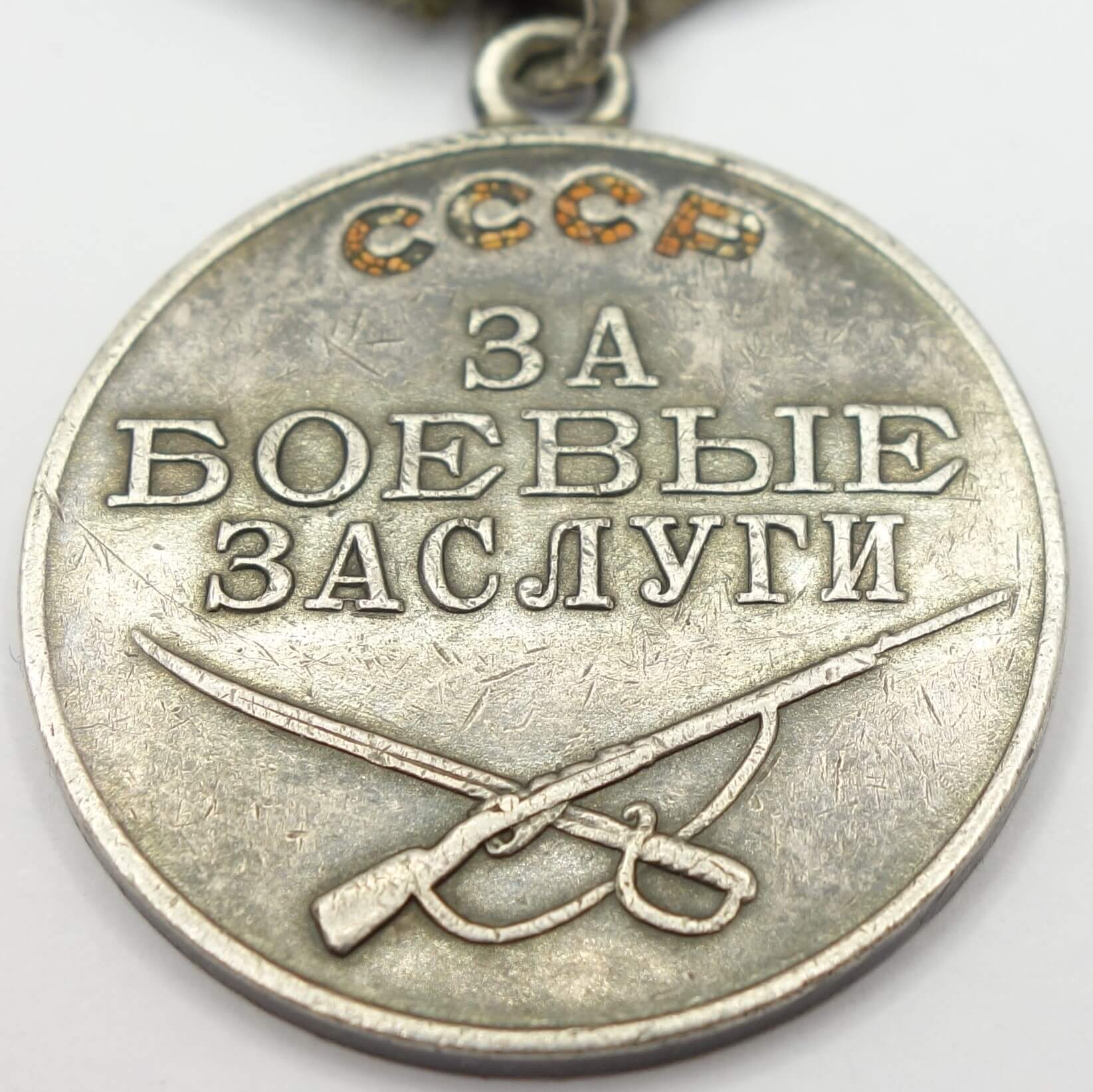 Made of solid silver. The medal for Combat Merit measures 32.11 mm in diameter and 2.18 mm in thickness. The height of the medal is 36.90 mm (including the eyelet) and it weighs 17.4 gram without its suspension.