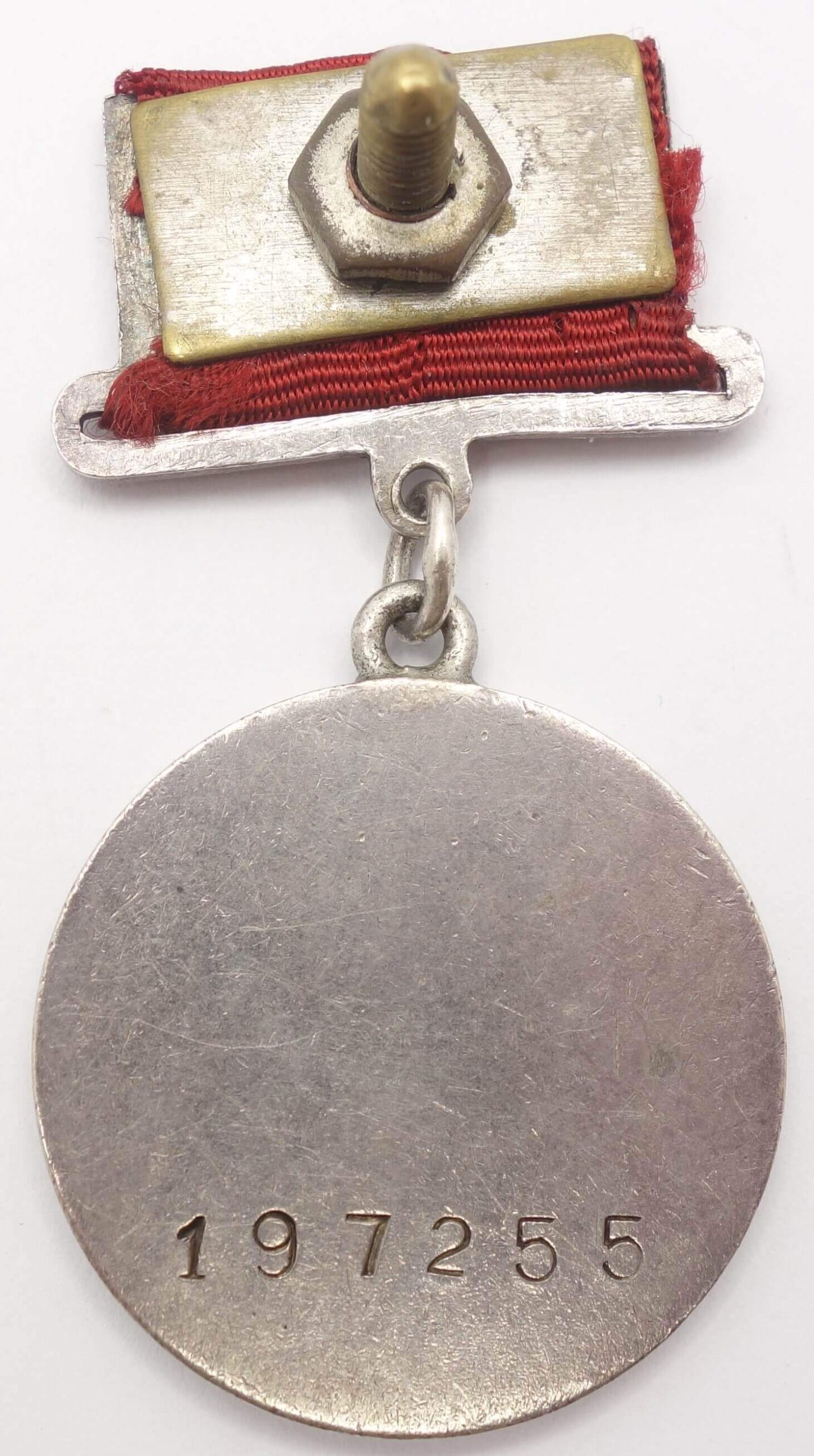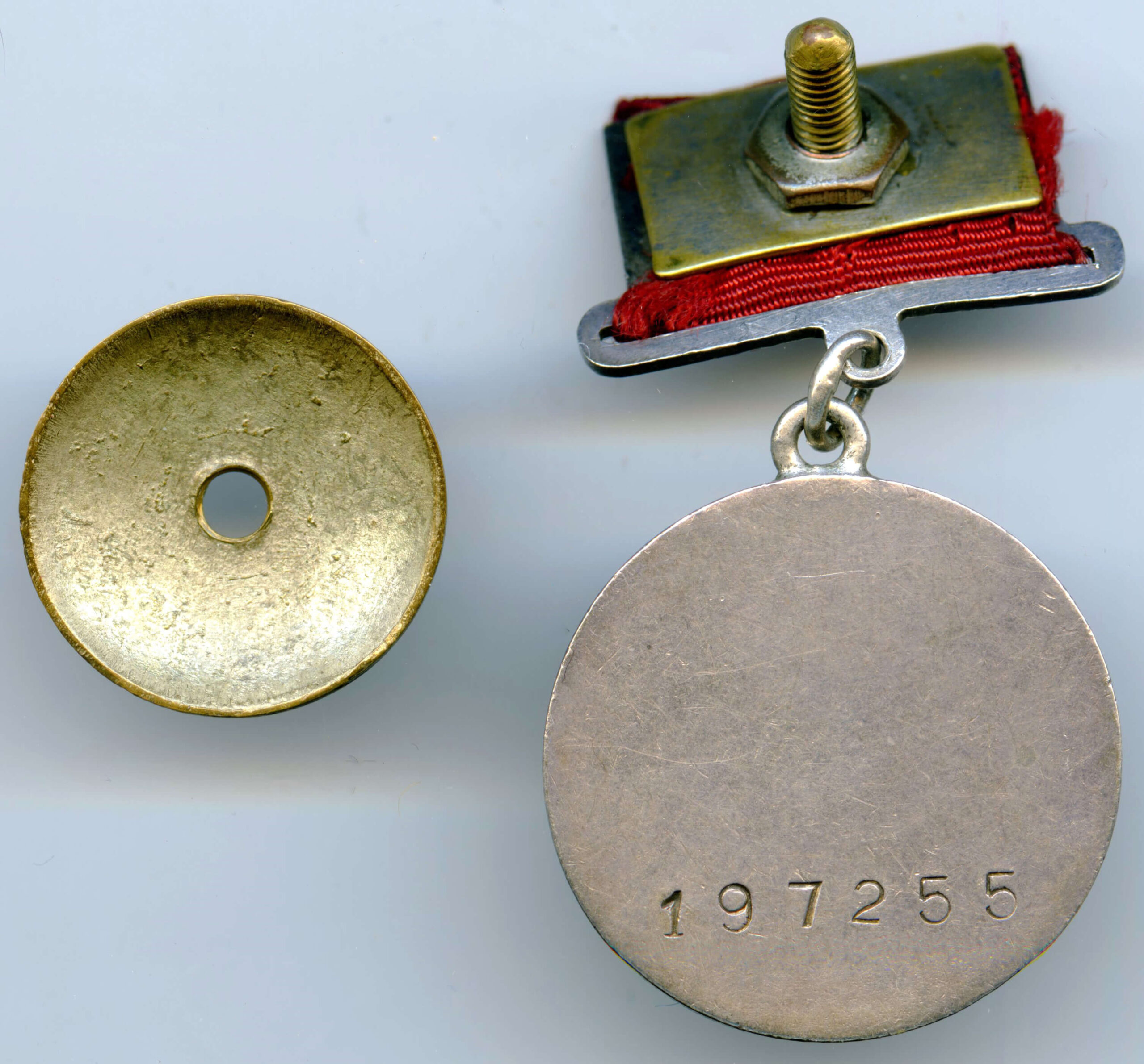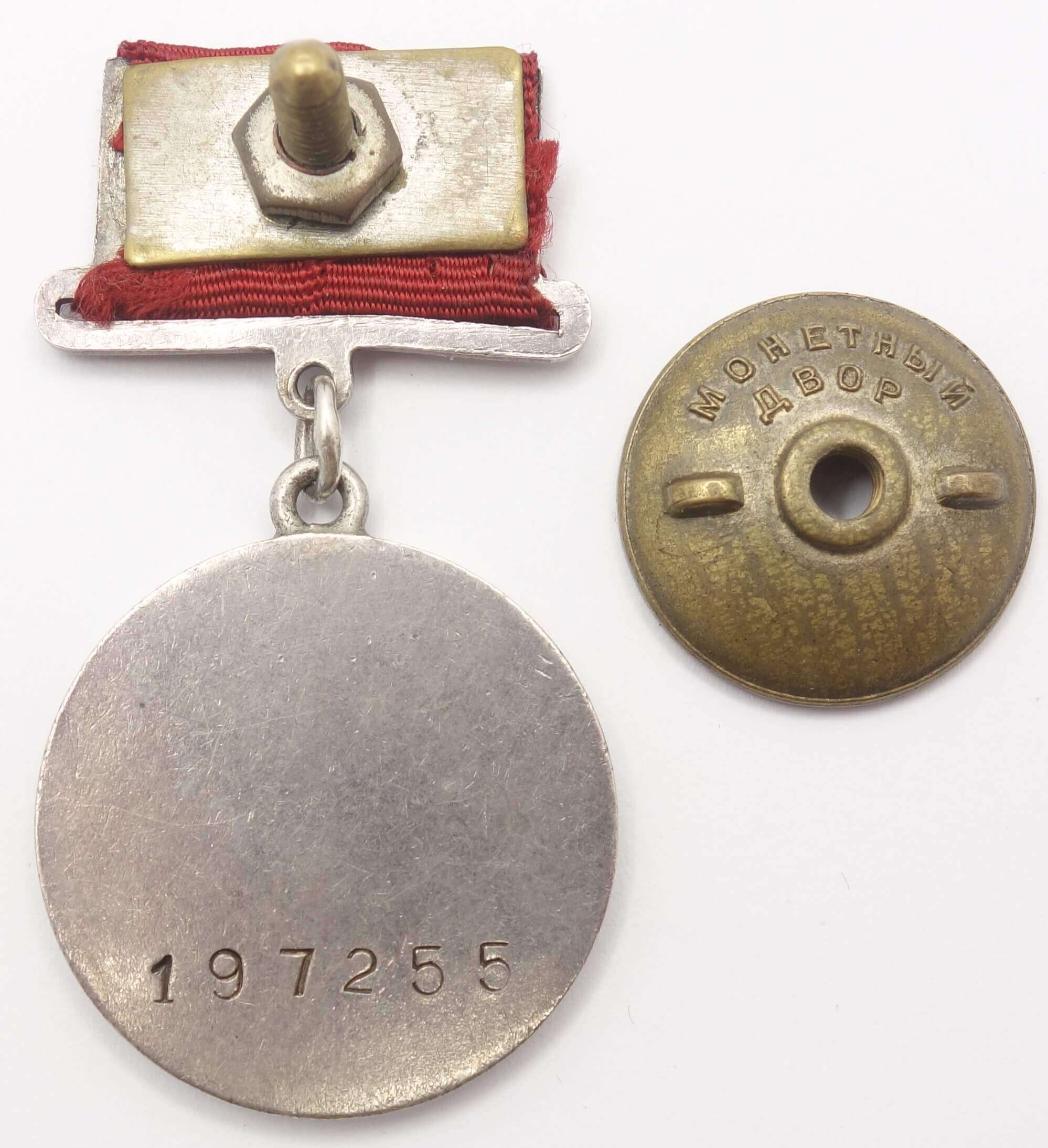 The medal is in excellent, above average condition with several small dings and scratches and most details still visible. The lacquer filling the letters ‘CCCP’ is mostly present and original although some of it is covered with some dirt. The silver suspension is original as is the brass screwpost, hexagon nut, the brass screwplate containing the text ‘Monetnij Dvor’ and the plate holding the ribbon. Its connection ring has not been cut and its ribbon appears to be original as well.