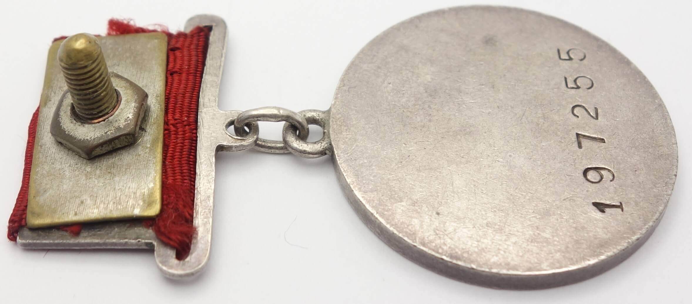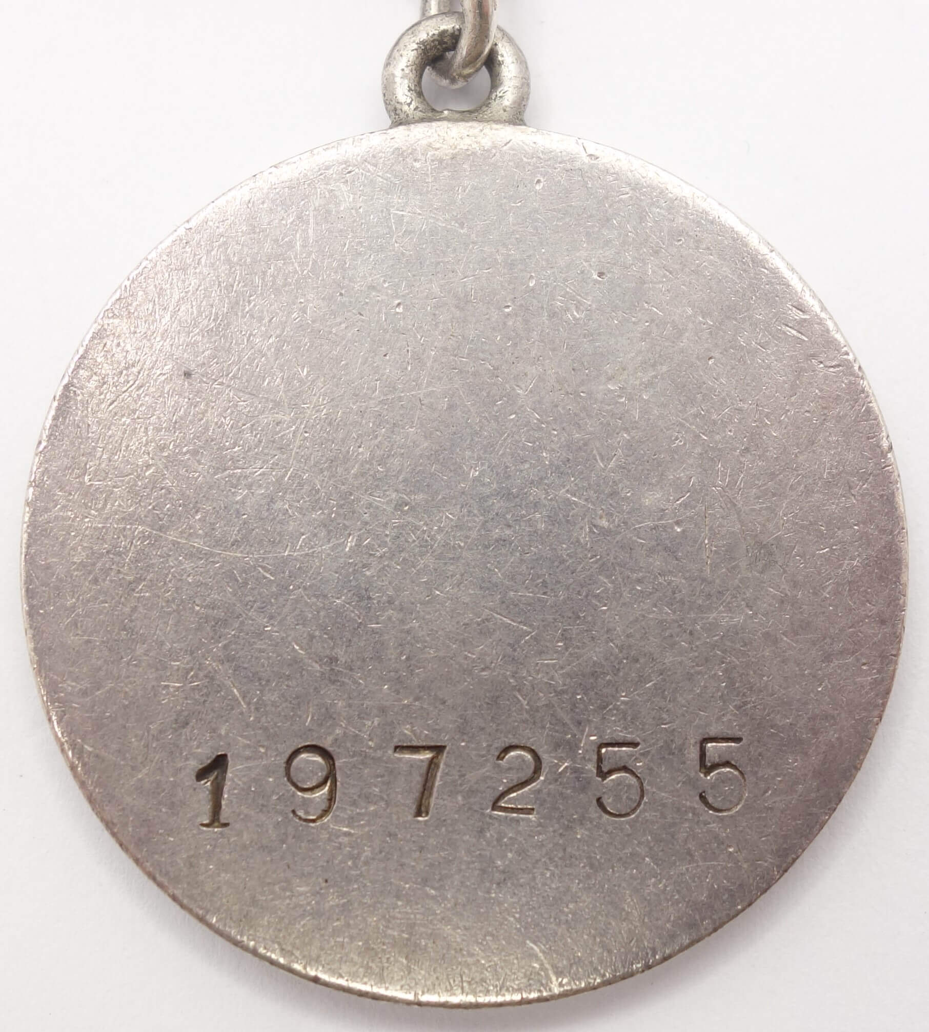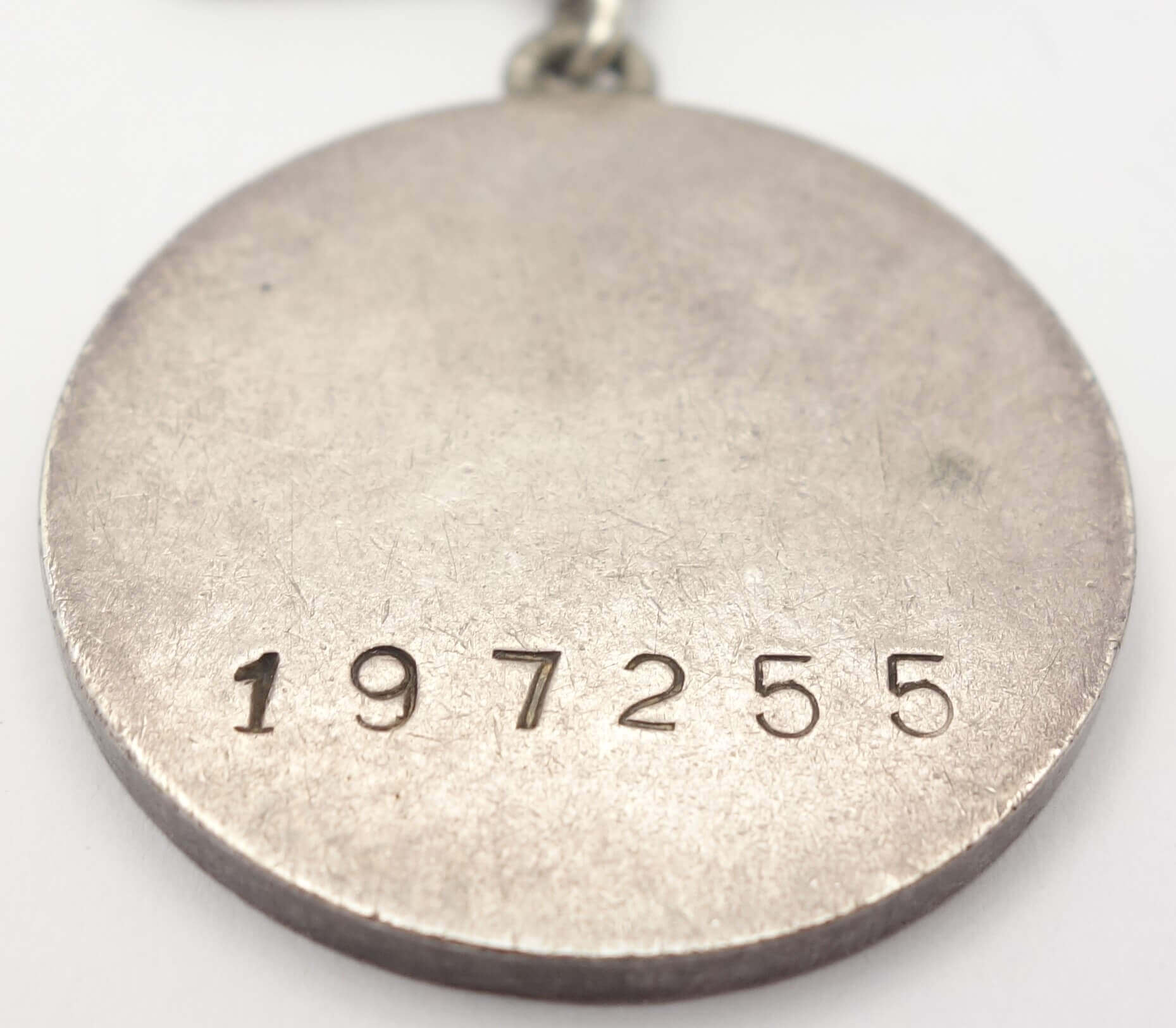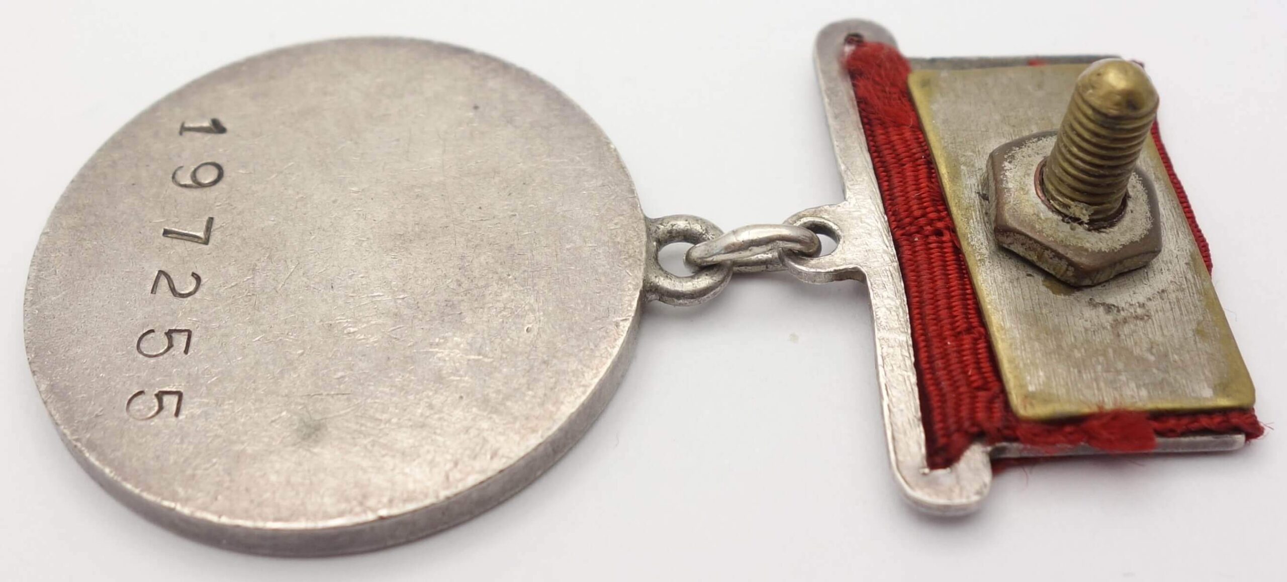 The medal is in excellent, above average condition with several small dings and scratches and most details still visible. The lacquer filling the letters ‘CCCP’ is mostly present and original although some of it is covered with some dirt. The silver suspension is original as is the brass screwpost, hexagon nut, the brass screwplate containing the text ‘Monetnij Dvor’ and the plate holding the ribbon. Its connection ring has not been cut and its ribbon appears to be original as well.