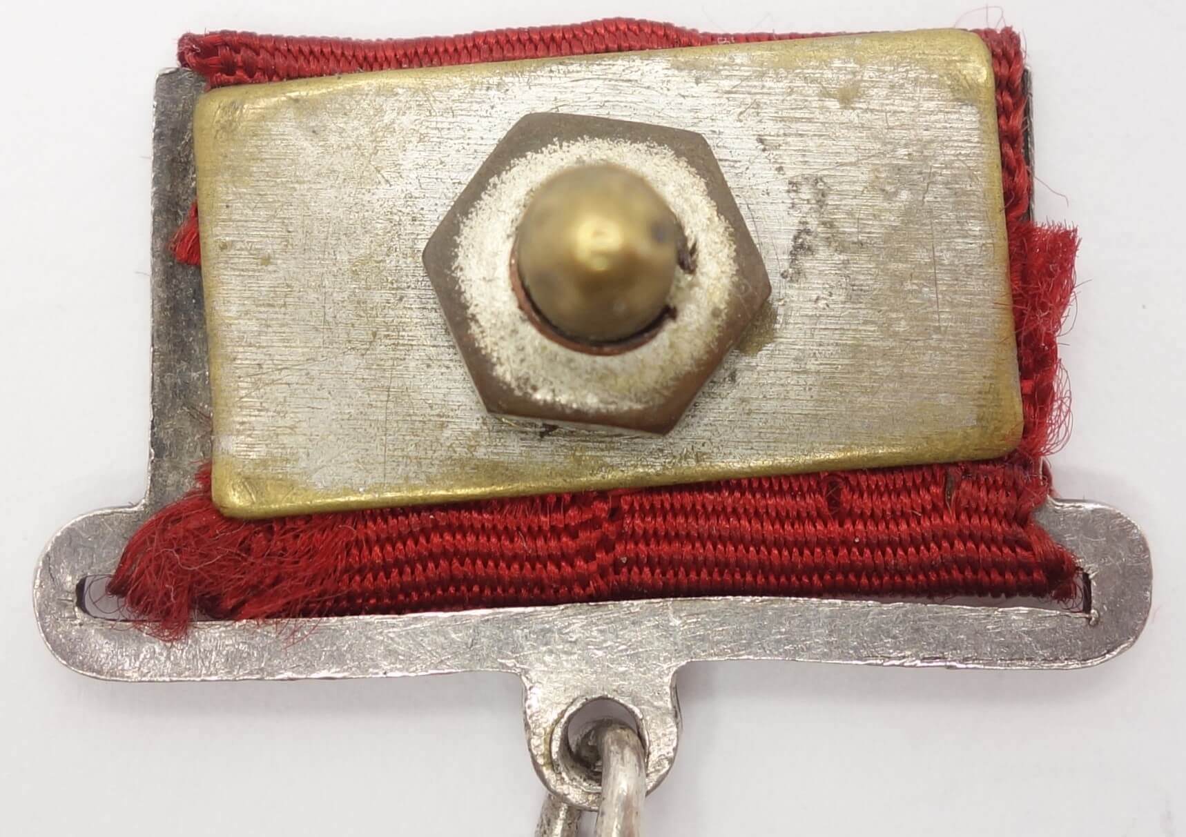Made of solid silver and lacquer. The medal itself measures 32.36 mm in diameter and 36.81 mm in height including the eyelet. It weighs 21.5 grams without its suspension and 30.0 grams with the suspension but without the nut. The eyelet is 5.53 mm in width and the suspension measures 25.29 mm in width at its narrowest point and 31.42 at its widest point.