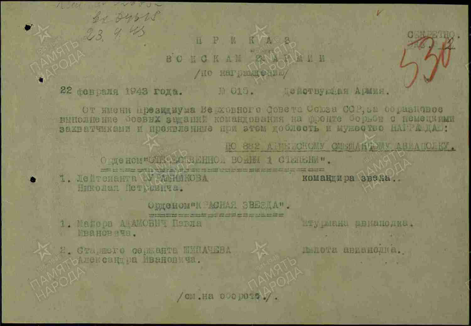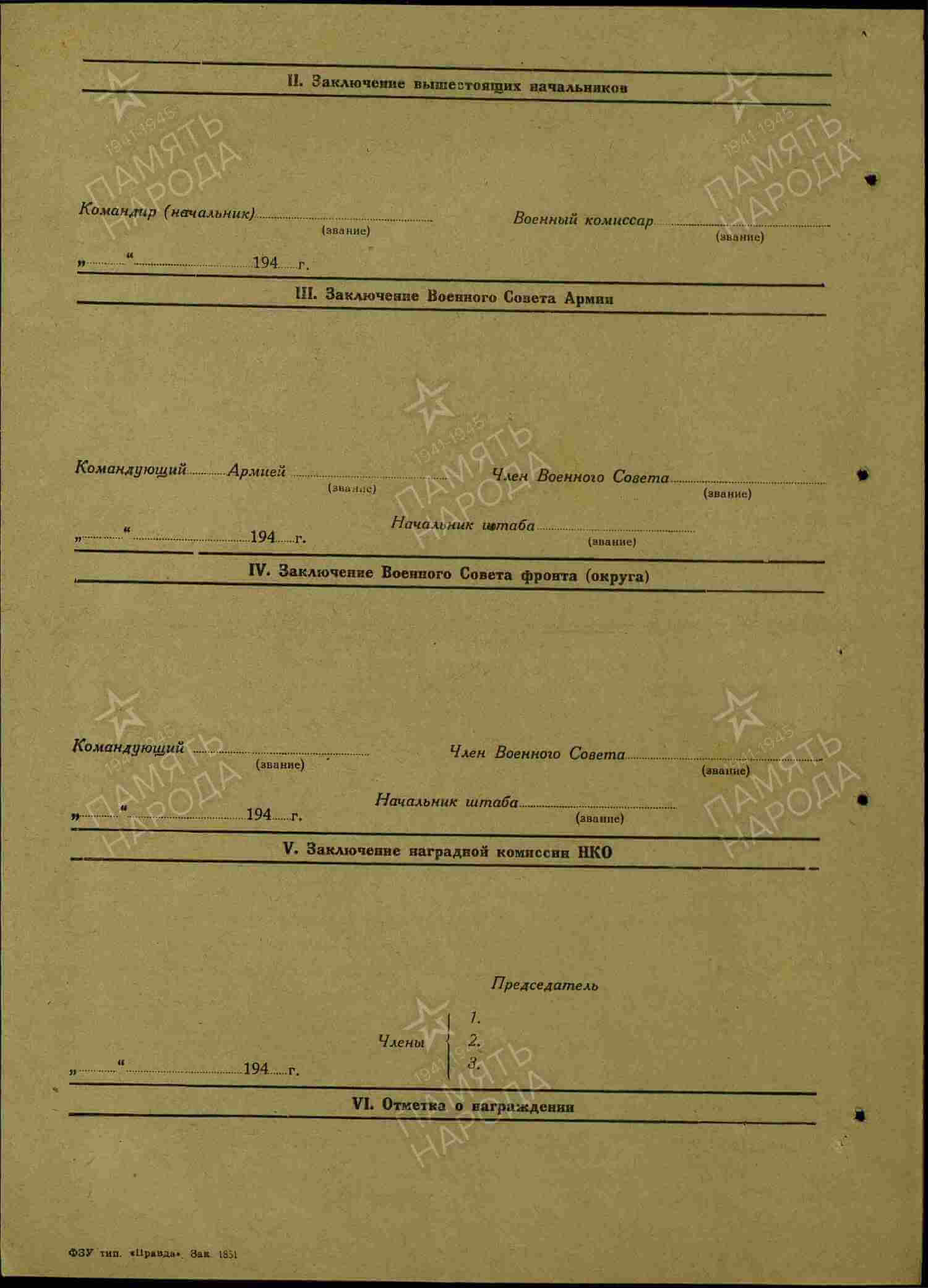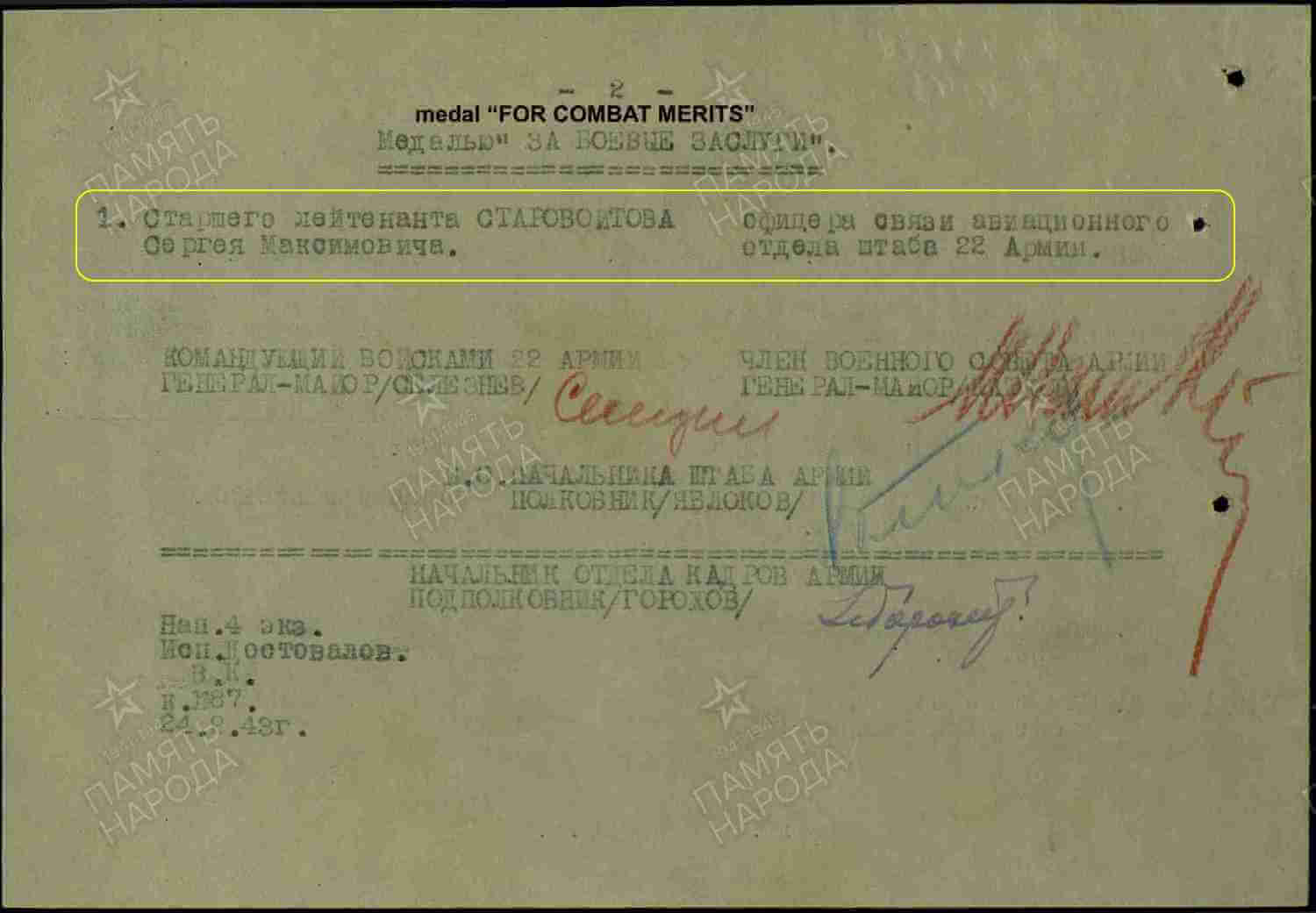 He has been serving in the field troops continuously since 15 June 1941 in the capacity of operations duty officer and liaison officer. Until the end of 1941, he was working as an operations duty officer of the airforce HQ of 22 Army. Working in difficult conditions, often several days in a row without rest, he always managed to provide the airforce HQ with precise and prompt combat reports on our airforces. On top of that, in the last 10 days of August 1941, he executed a mission assigned by the HQ of 22 Army and conducted reconnaissance of the enemy troops on the ground during the retreat of the 22 Army from the town Veliekie Luki. As the head of party of 7 servicemen, he reconnoitered advance of the enemy troops near the lake Zhizhitskoye. Fighting off the advancing enemy with rifle fire and hand-grenades, managed to take safely his party and a truck from encirclement and reported valuable intelligence to the headquarters. On 31 August, he was send by the Command to the village Mishinovo with the task to organise our retreating troops. He energetically accomplished the task collecting and organising 300 servicemen and delivering them to the rally point.