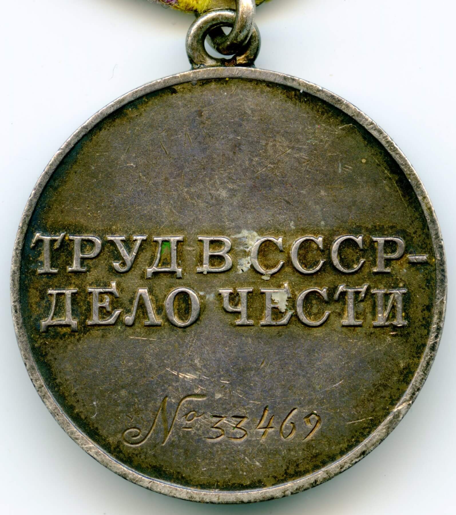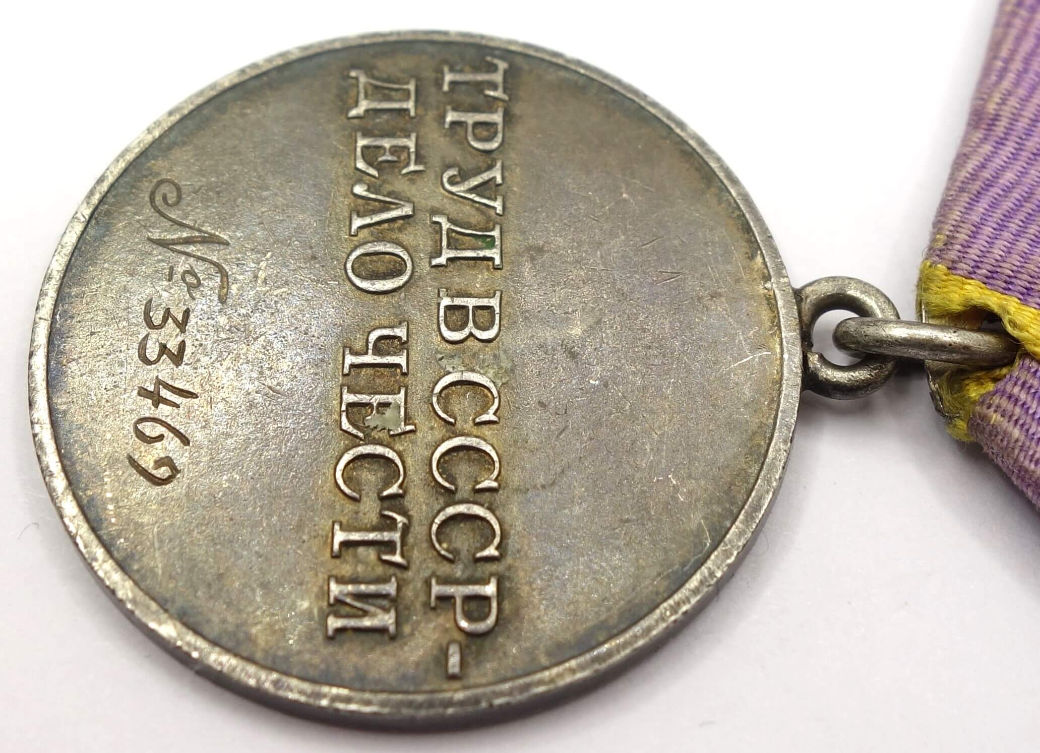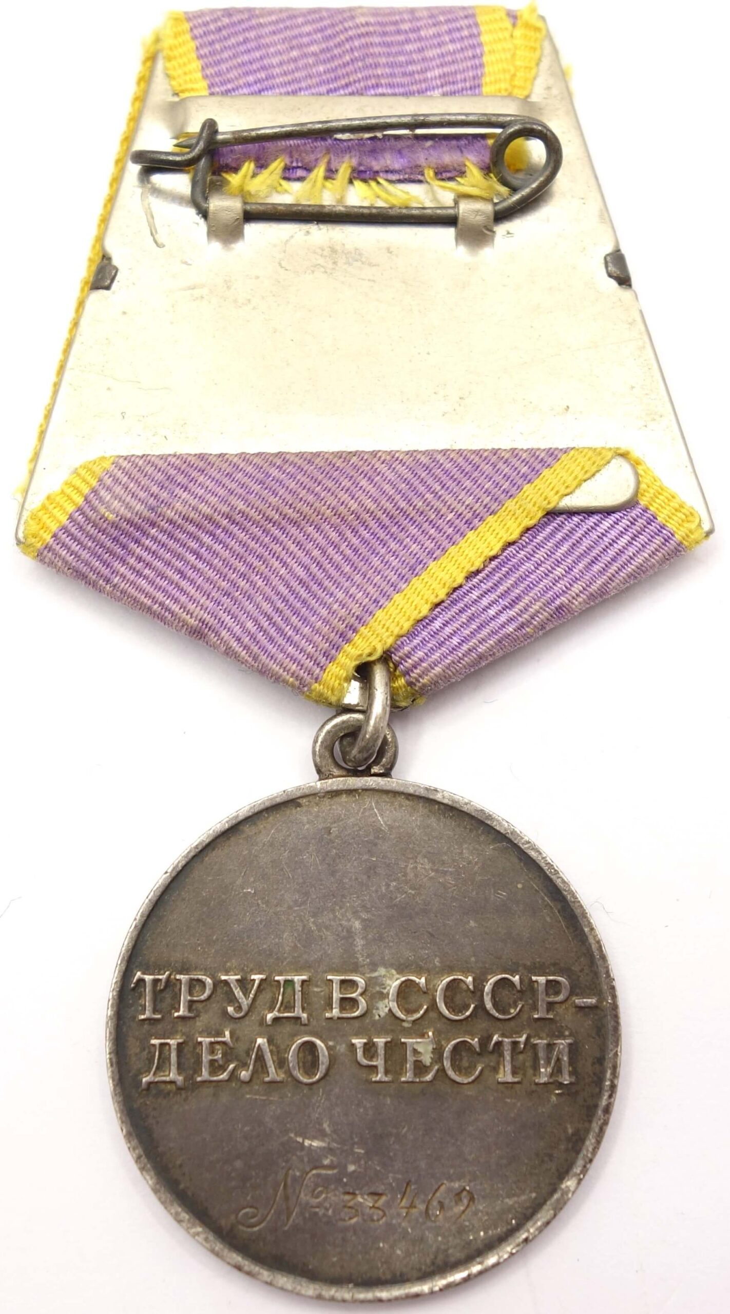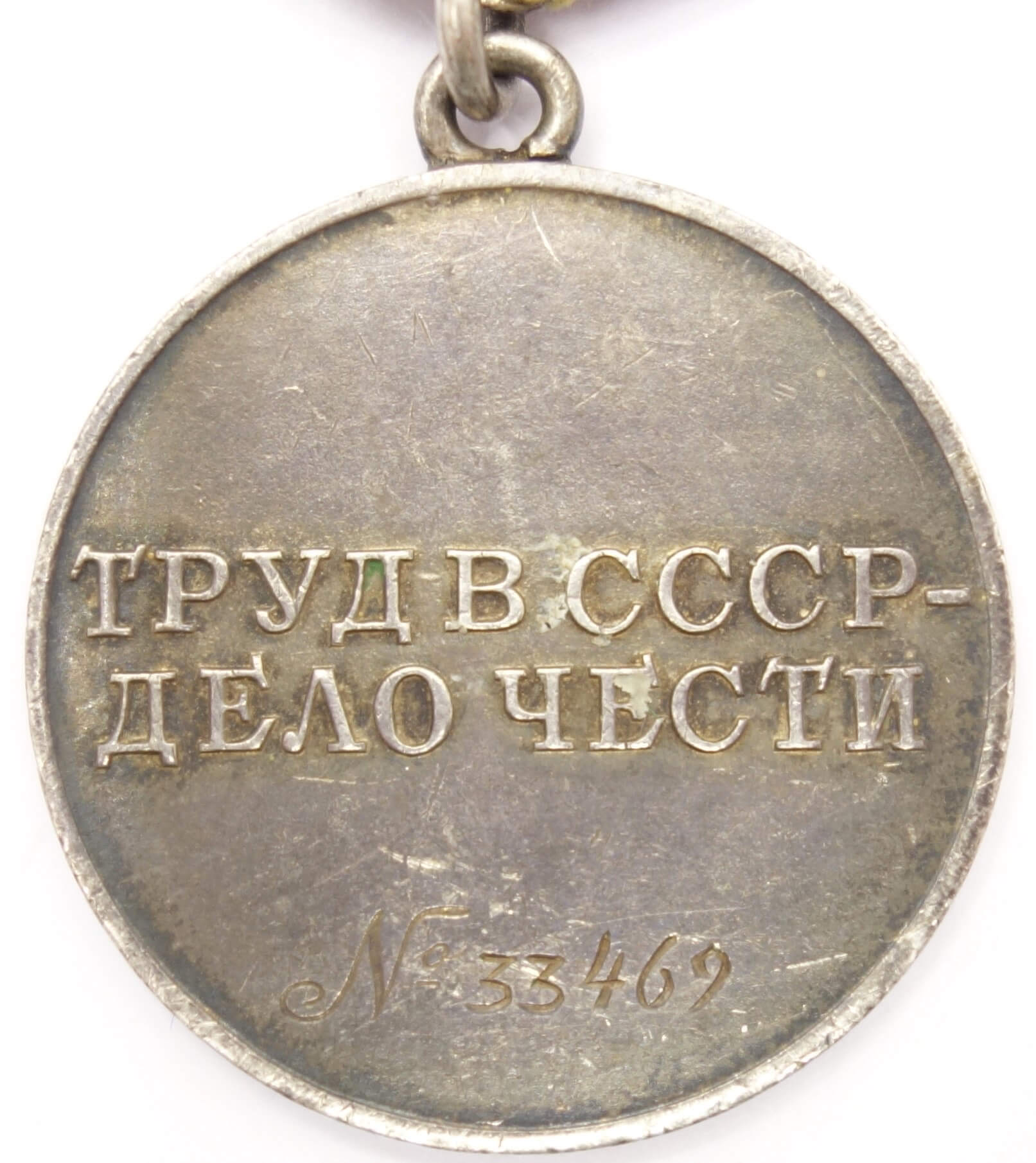 Made of solid silver and enamels. Measures 32.39 mm in diameter and 36.65 mm in height (including the eyelet). The eyelet is 5.62 mm wide and the medal weighs 15.3 grams without its suspension. The reverse shows the stamped letters ‘No’ followed by the hand engraved serial number ‘33469’. The minimum known medal number is 32652 and the maximum is 76439.