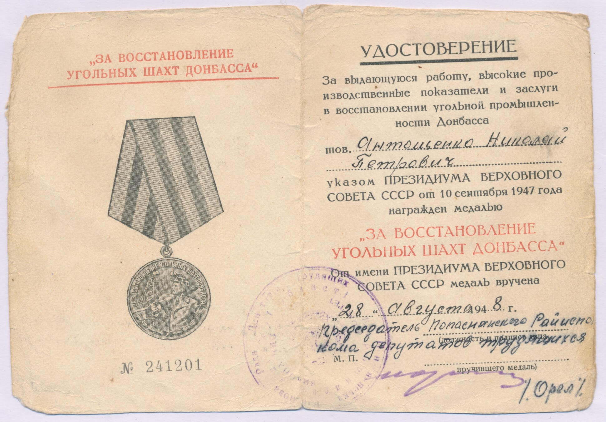 Medal for the Restoration of the Black Metallurgy Enterprises of the South with document