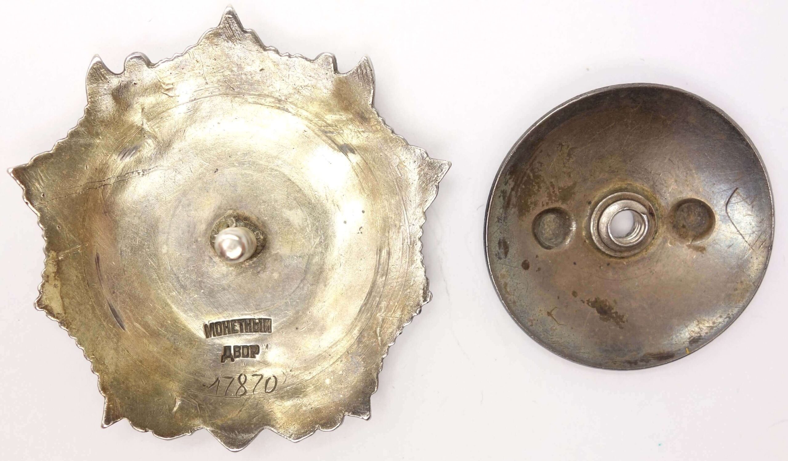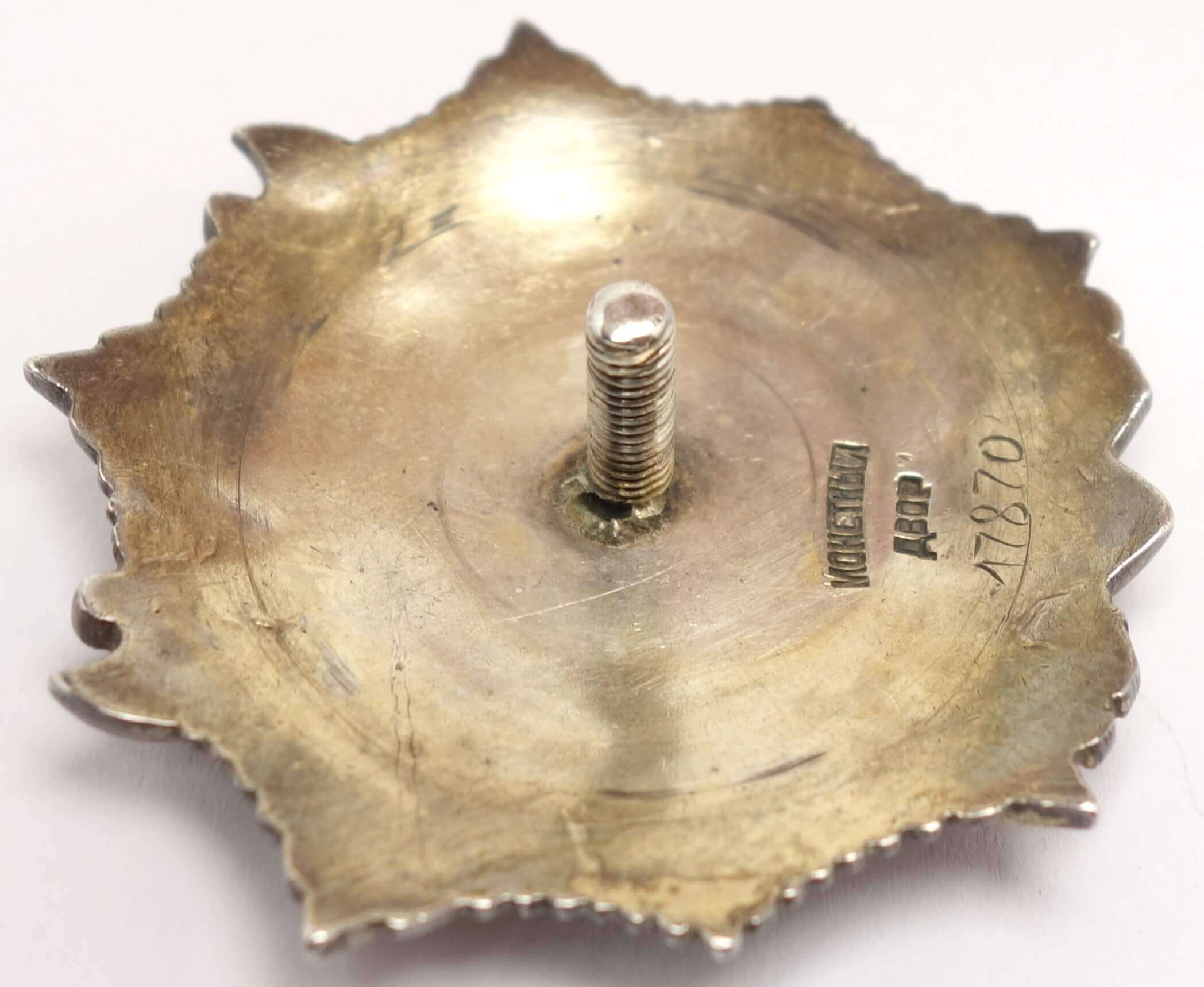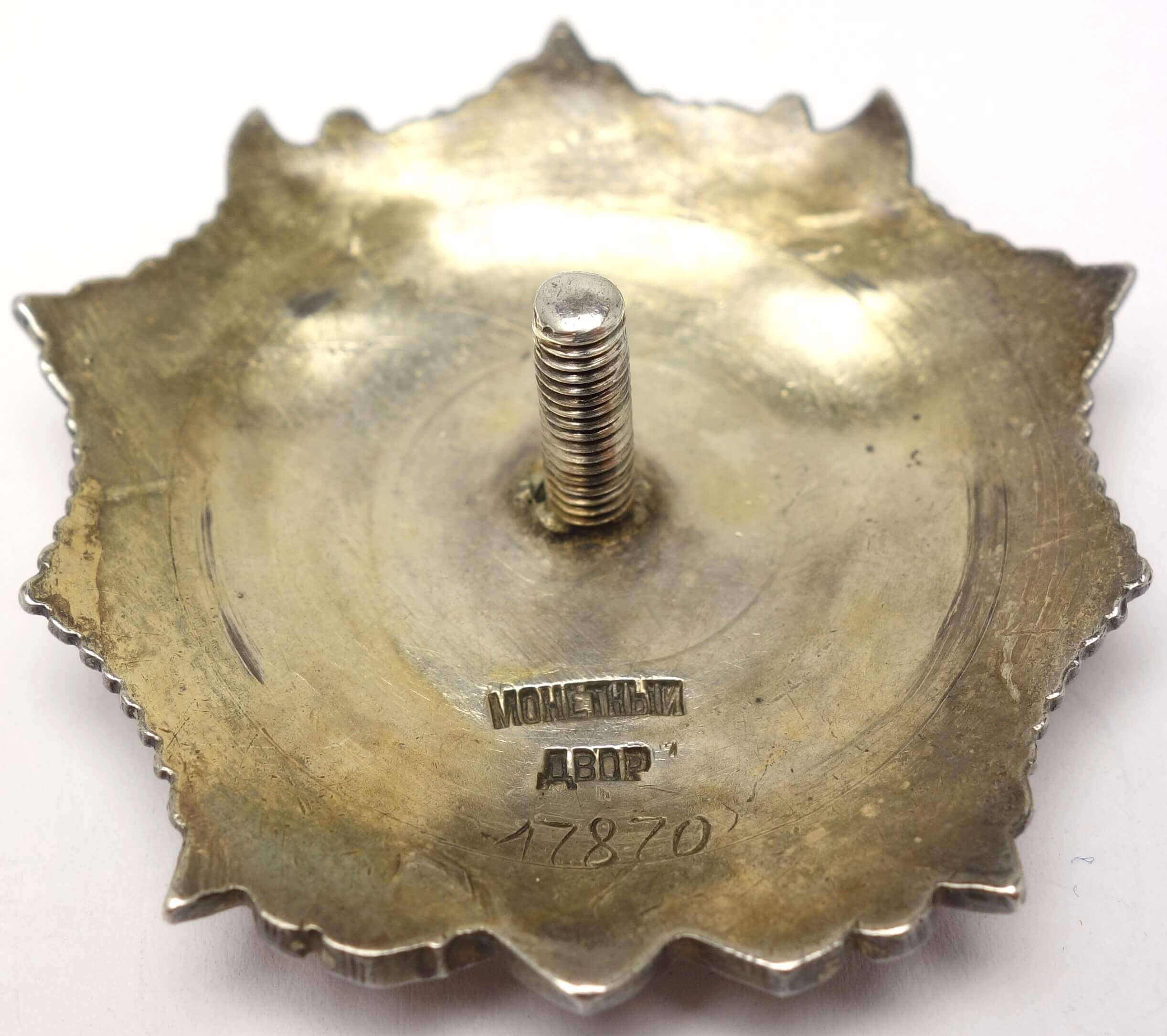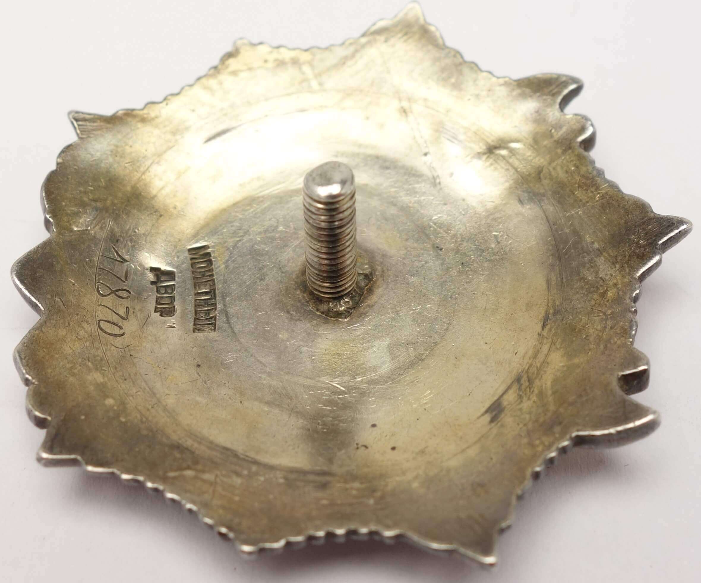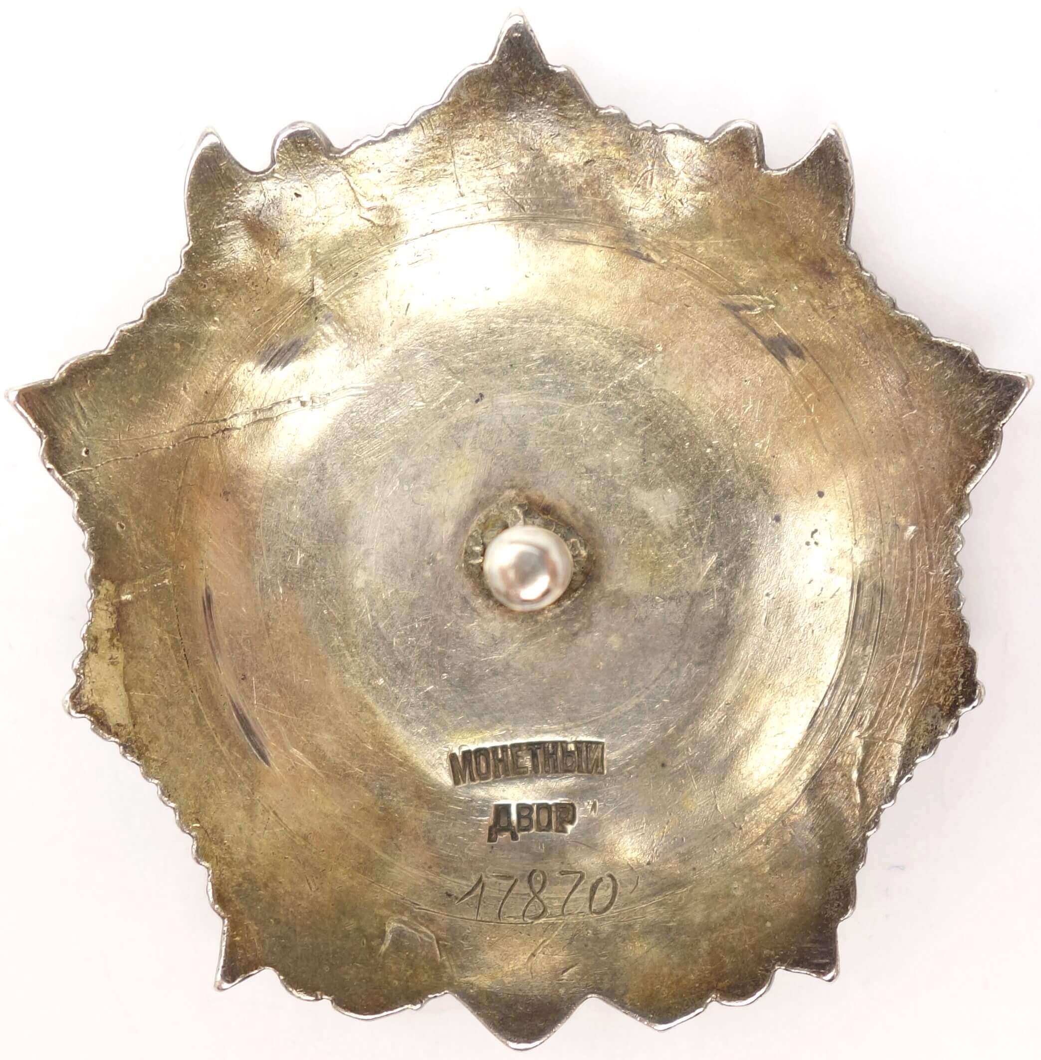 In nice condition, with the only flaw being an enamel repair to the 3 o’clock ray of the red star. This is done quite nicely and hard to detect with an untrained eye. The other rays are without repair or damage. The details remain sharp and fully defined, including raised areas such as Nevsky’s face, and a substantial amount of original gold plating is still present. Both sides display a medium dark patina. The order is fitted with a period silver screwplate and the screw retains its full length and shows no repairs.