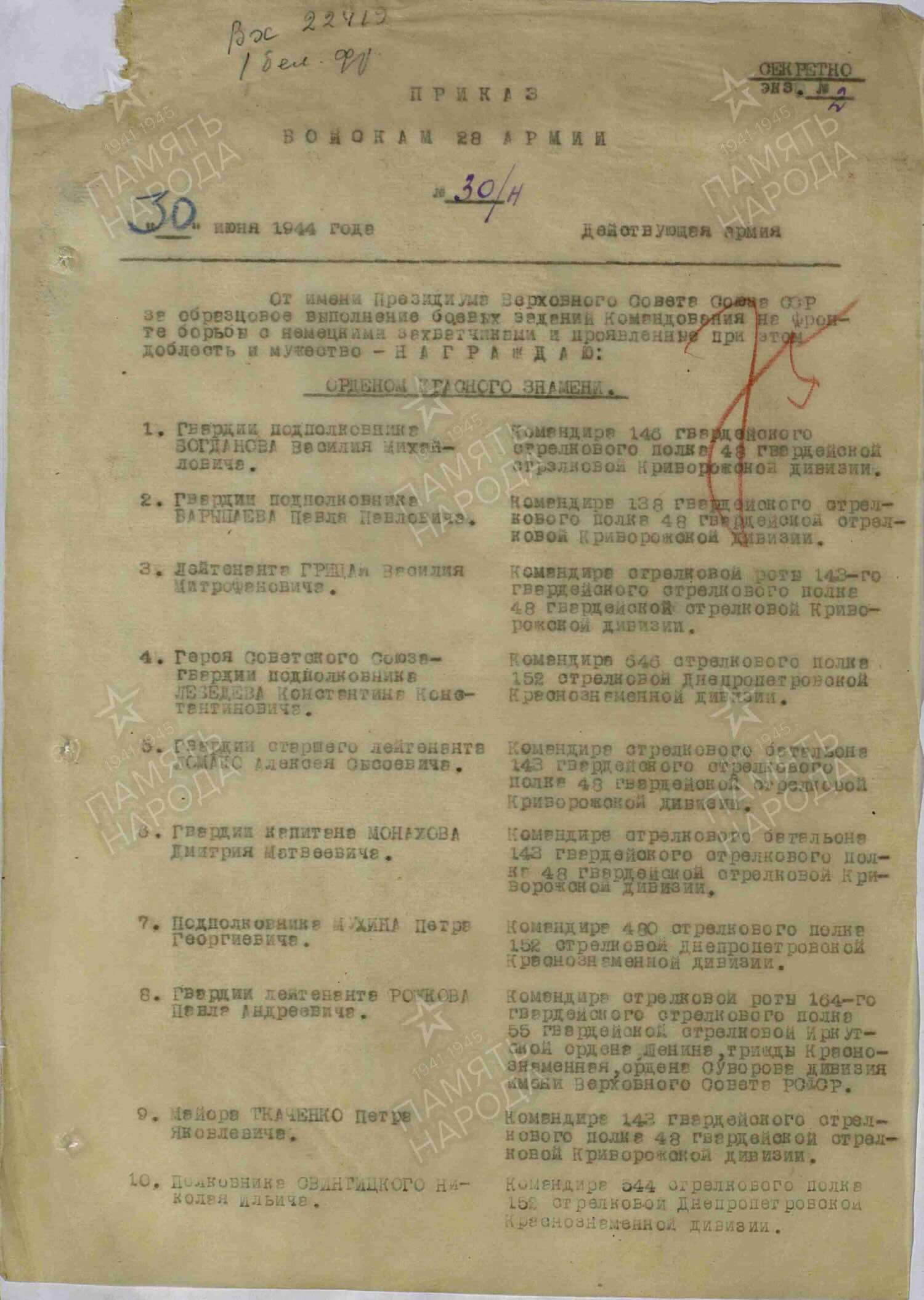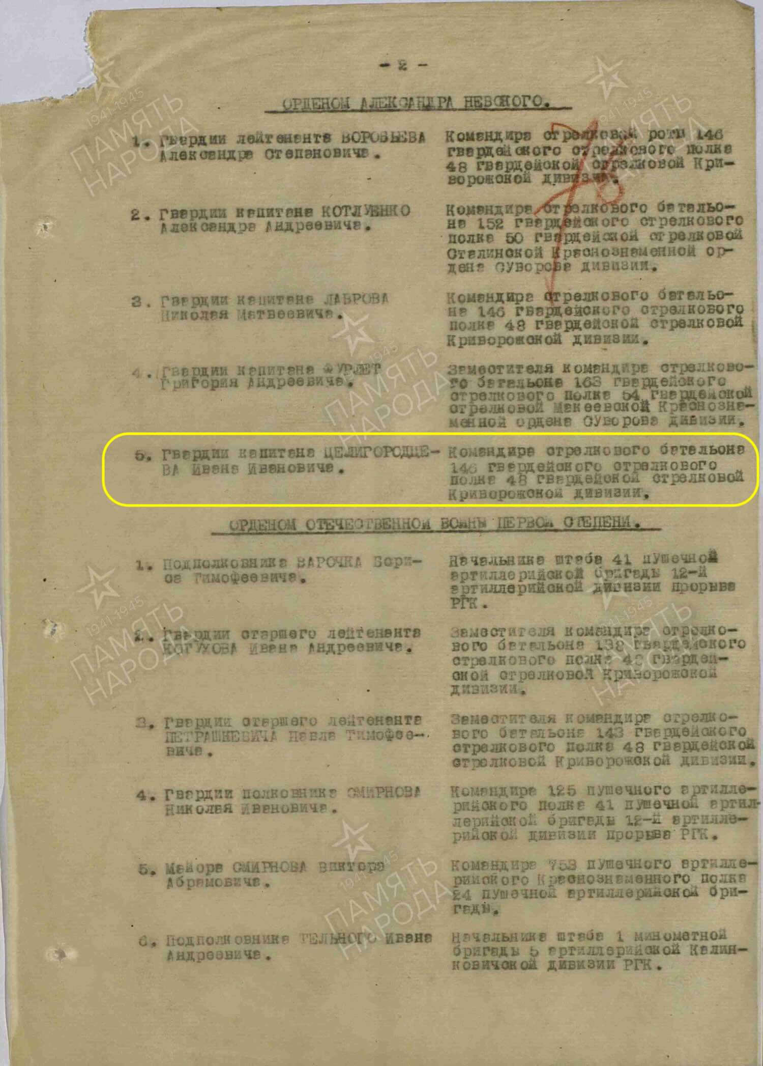 Awarded to Guards Captain Ivan Ivanovich Tseligorodtsev (Иван Иванович Целигородцев)