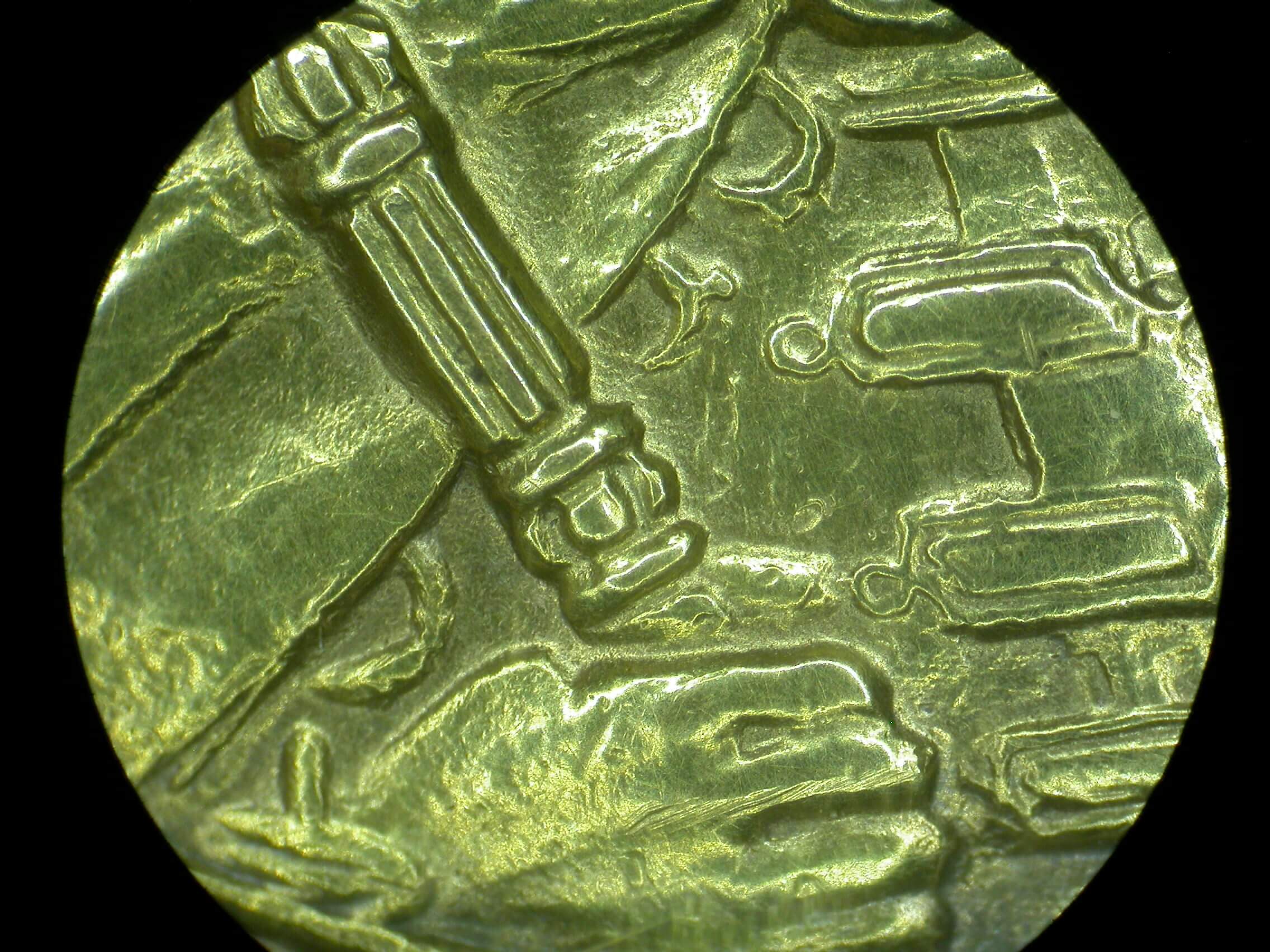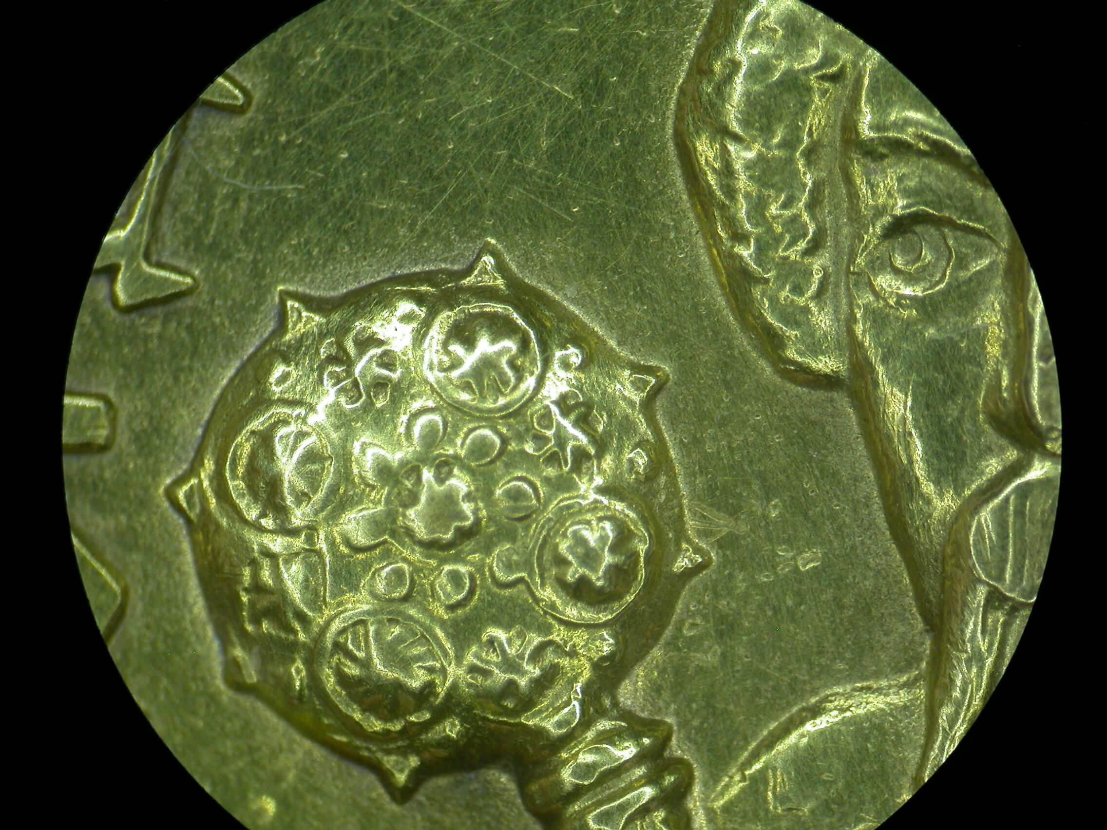 Made of solid gold and silver, it measures 56.30 mm in width, 54.82 mm in height, and weighs 36.4 grams without its screwplate. The serial number and the mint mark “Monetni Dvor” are located at the bottom of its reverse.