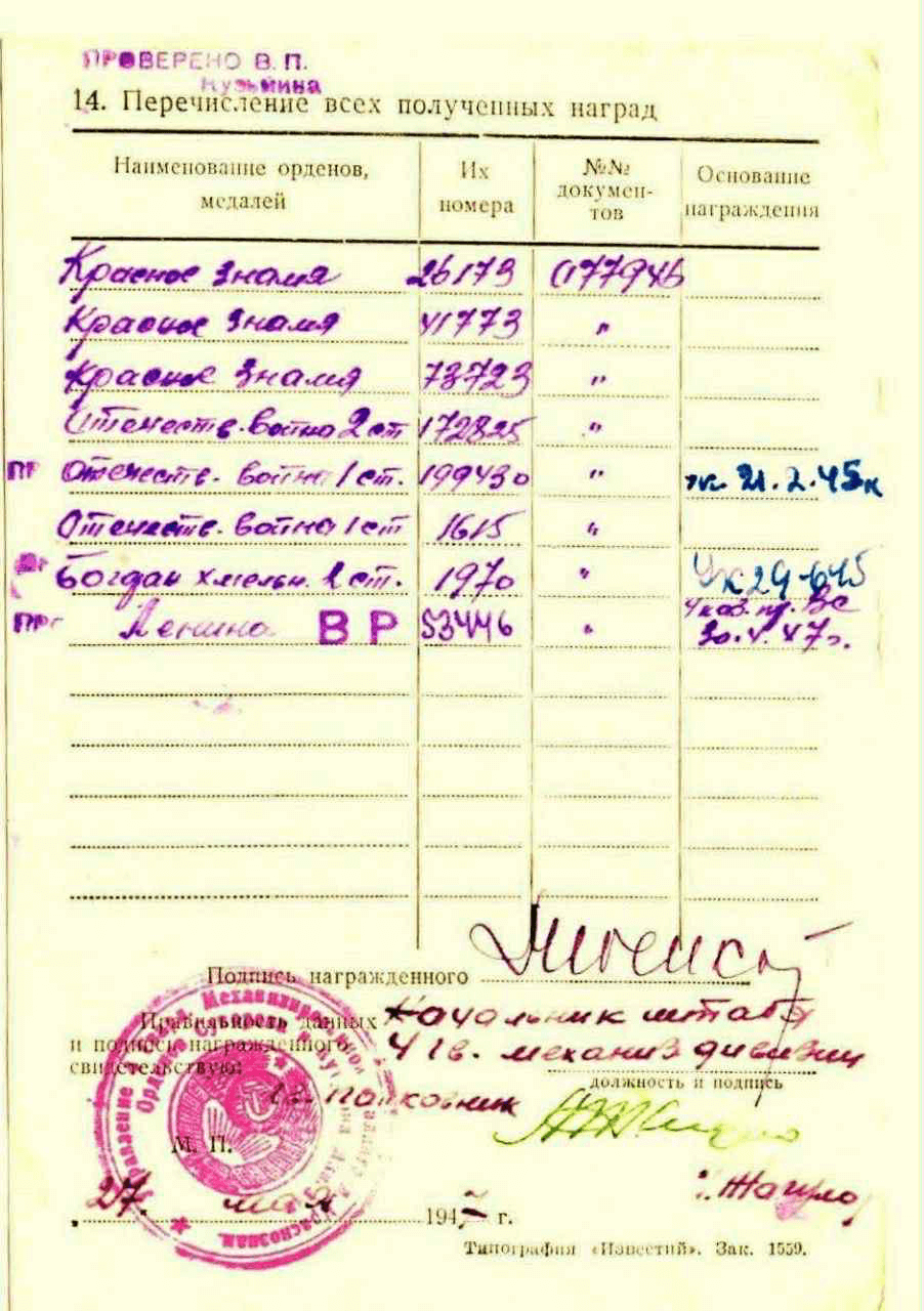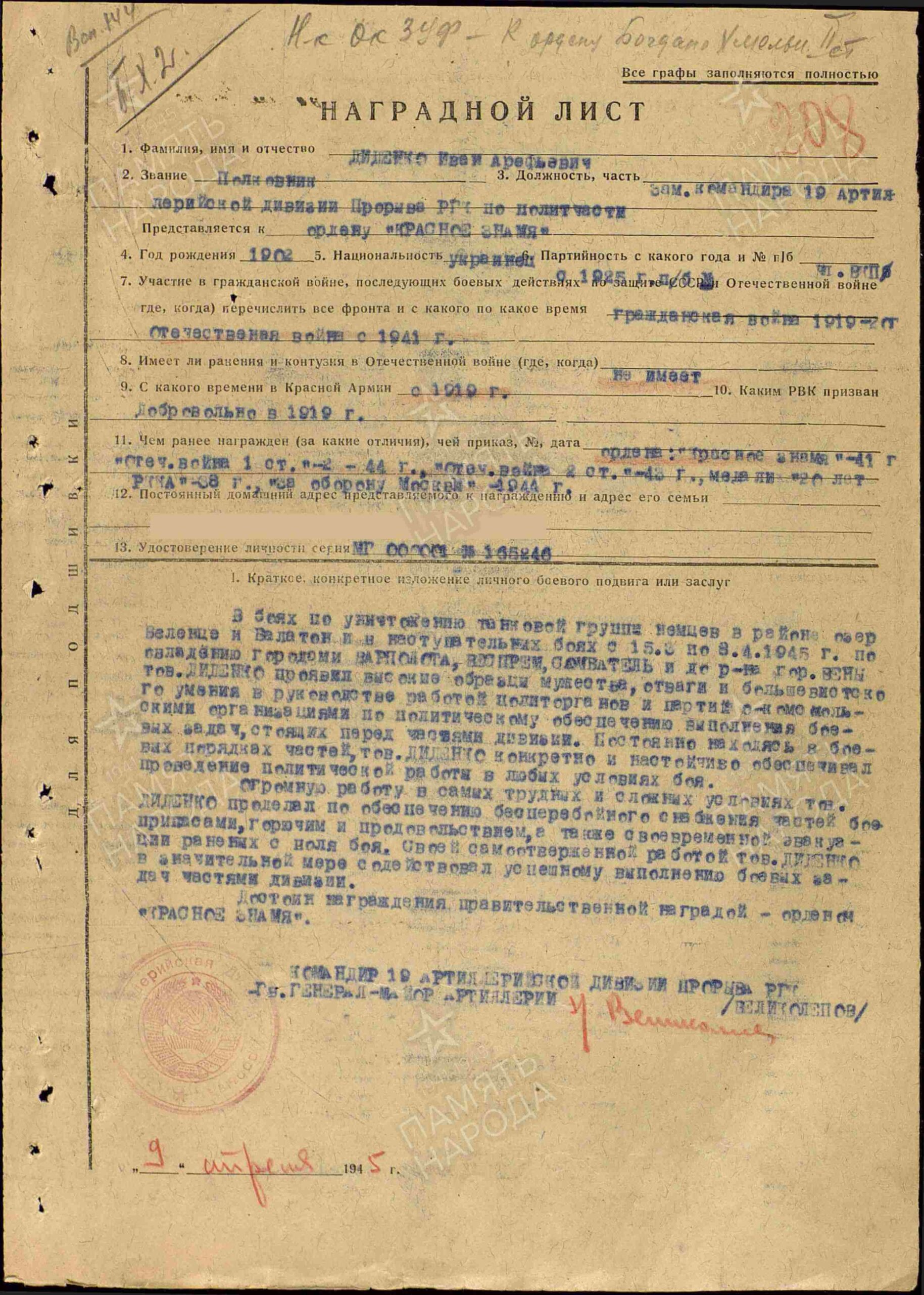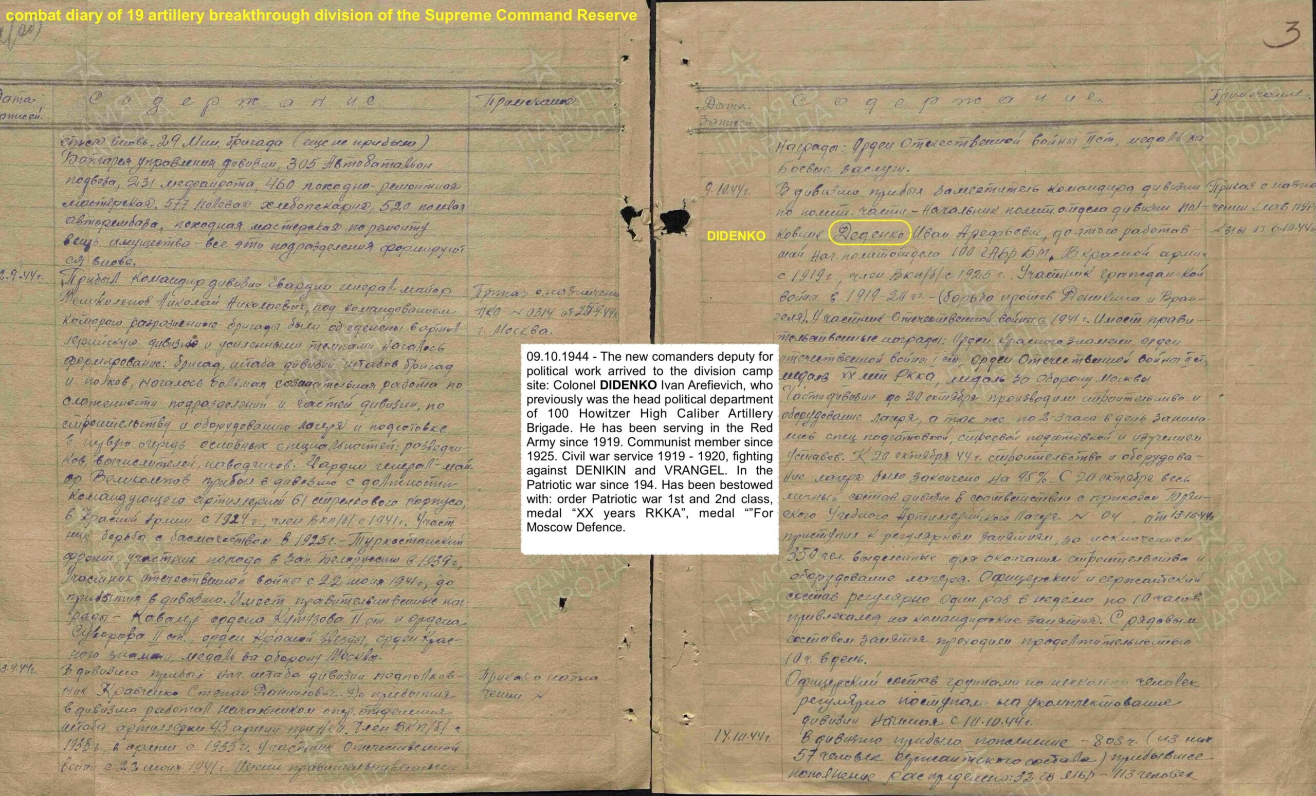 Comrade DIDENKO conducted extensive work in utmost difficult and complicated conditions with the aim to establish reliable and timely deliveries of ammunition, fuel, and food, and efficient evacuation of the wounded from the battlefield. With his selfless work, comrade DIDENKO significantly assisted the success in our combat operations. He deserves state award order “RED BANNER”.[later changed to the Order of Bogdan Khmelnitsky 2nd class]