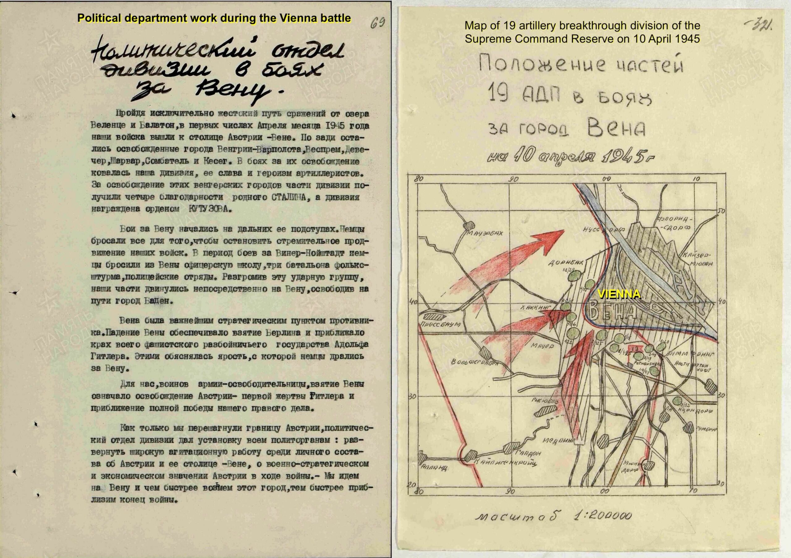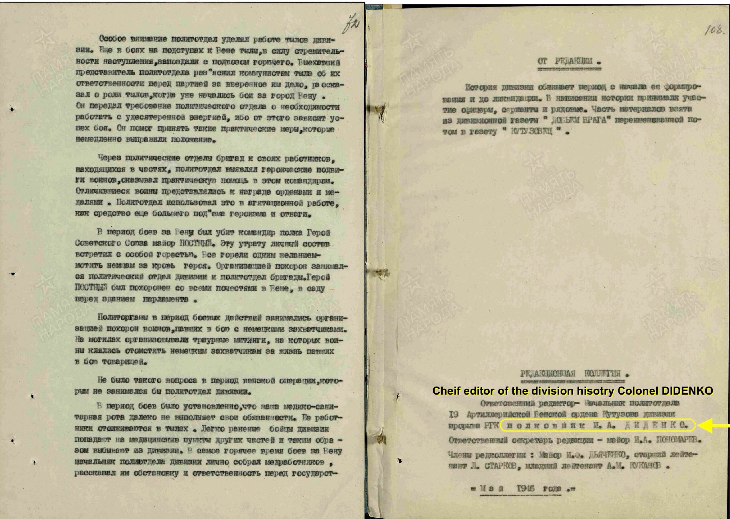 He distinguished himself in the combat operations for elimination of the German tank group near the lakes Velence and Balaton, and in the subsequent offensive during 15 March – 18 April 1945 for taking the towns Várpalota, Veszprém, Szombathely and then all the way to Vienna city. He exhibited high examples of courage and bravery, true Bolshevik’s management skill of his political assets and organisations. This all to provide political support to the combat operations conducted by the division troops. Comrade DIDENKO was constantly present among the fighting formations and rendered direct and persistent help in provision of political work in any combat circumstances.