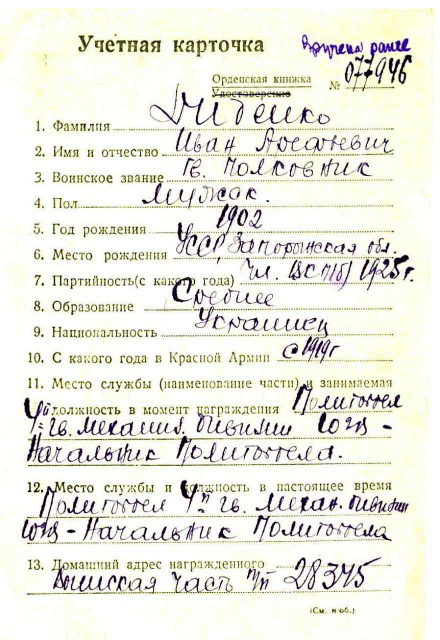 Awarded to Colonel Ivan Arefievich Didenko (Иван Арефьевич Диденко)